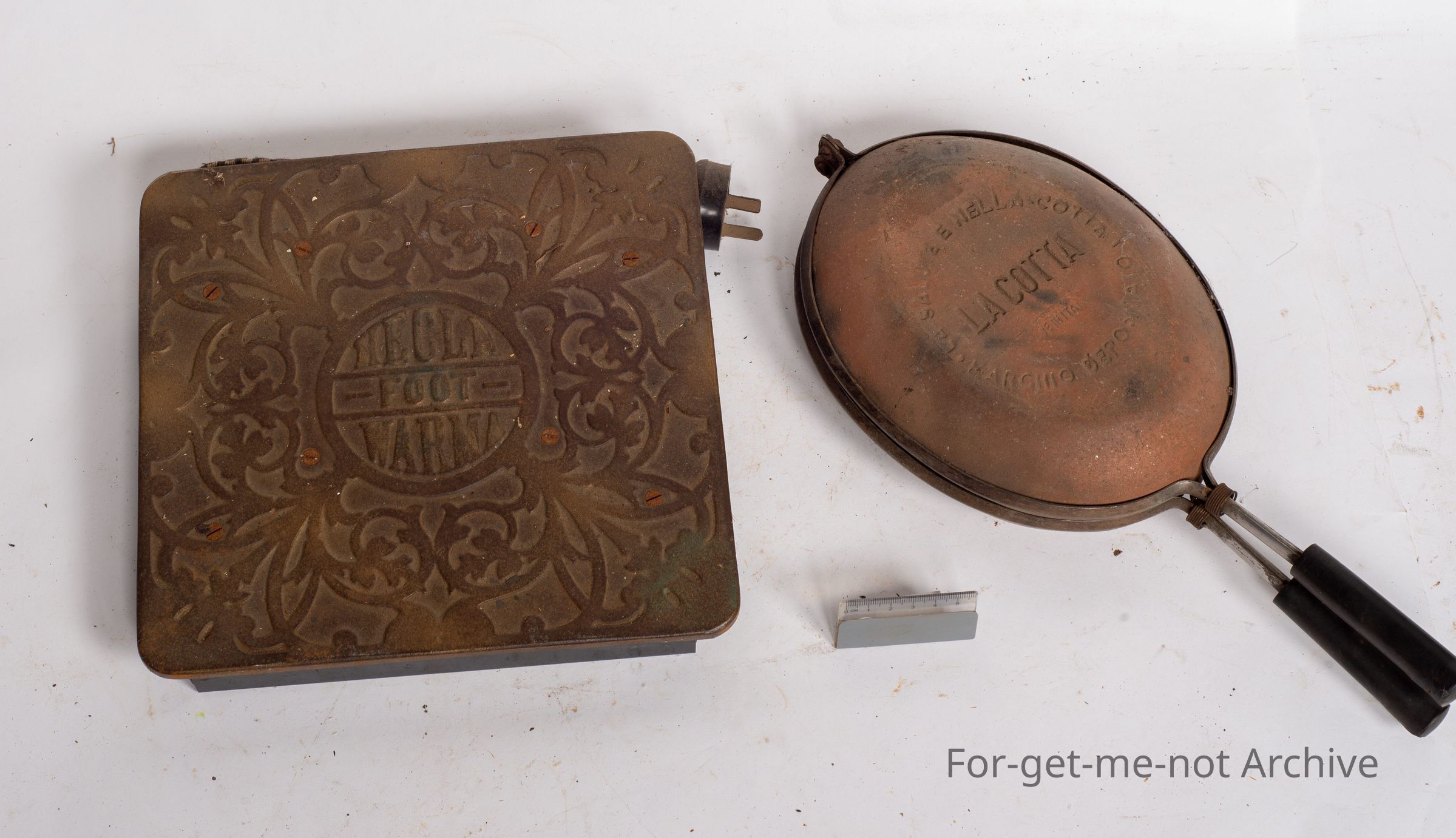 1 is, a terracotta cooker. This is hinged. It's called La cotta. Possibly Italian. In very good order. The other one is a Hecla foot warmer, electric, made of cast iron, Quite a decorative plate to put your feet on.Collection