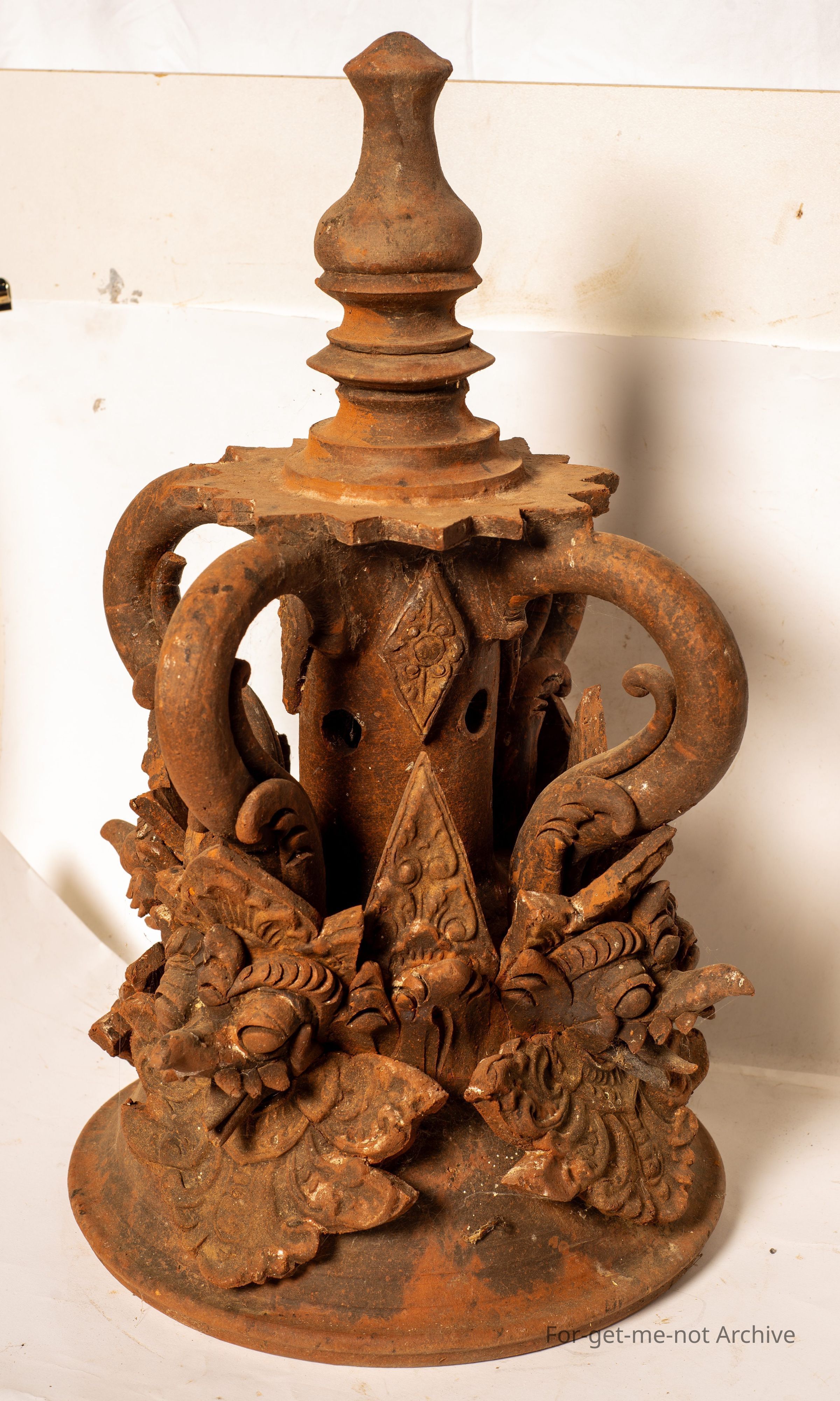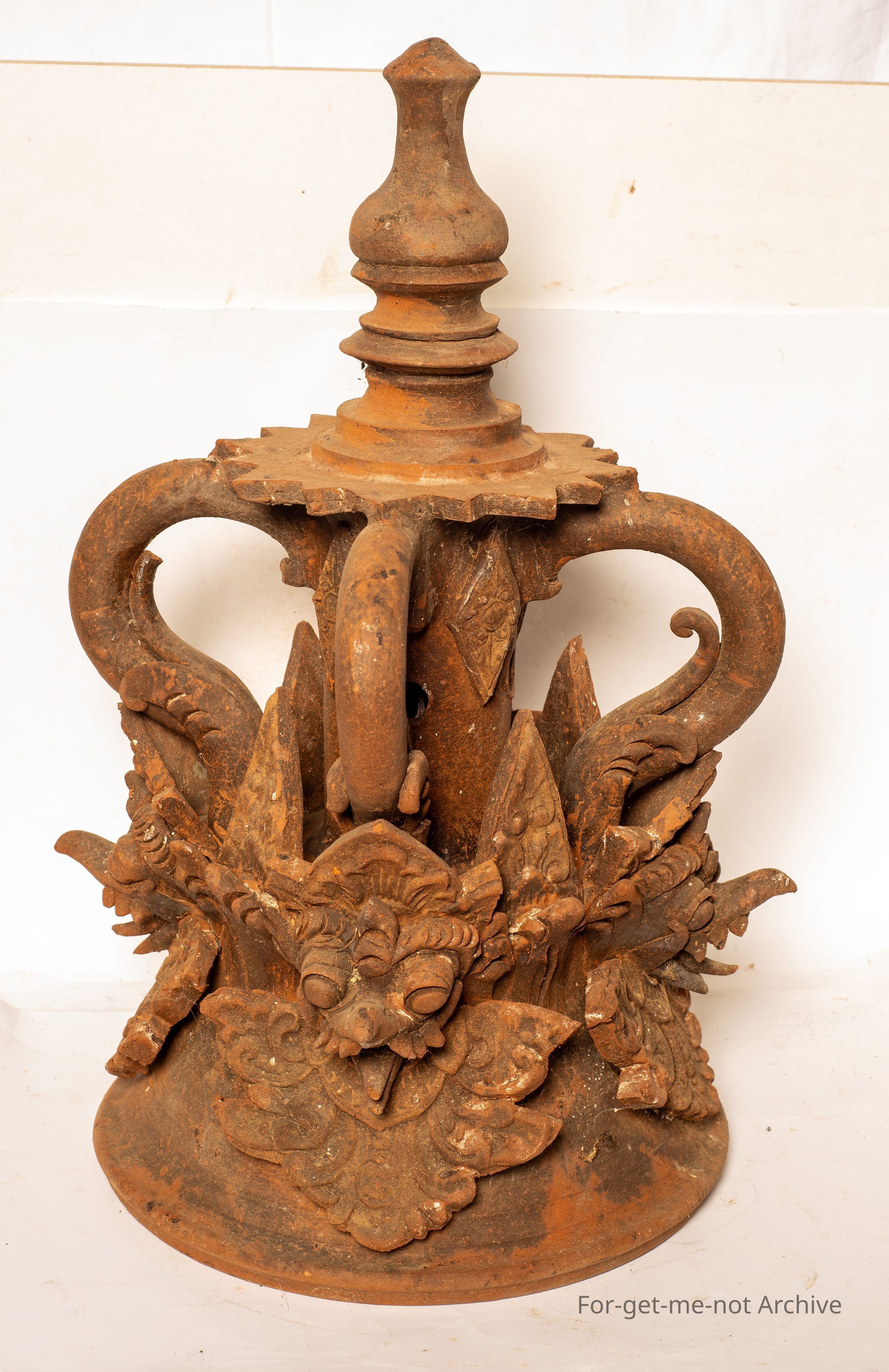 Ornate terracotta finials. This is a smaller one of 2. these are from a Balinese temple. They had a candle inserted in the centre with the light coming out the centre column which has holes in it. Heavily decorated with, monstrous type of figures. A lot of work.Collection