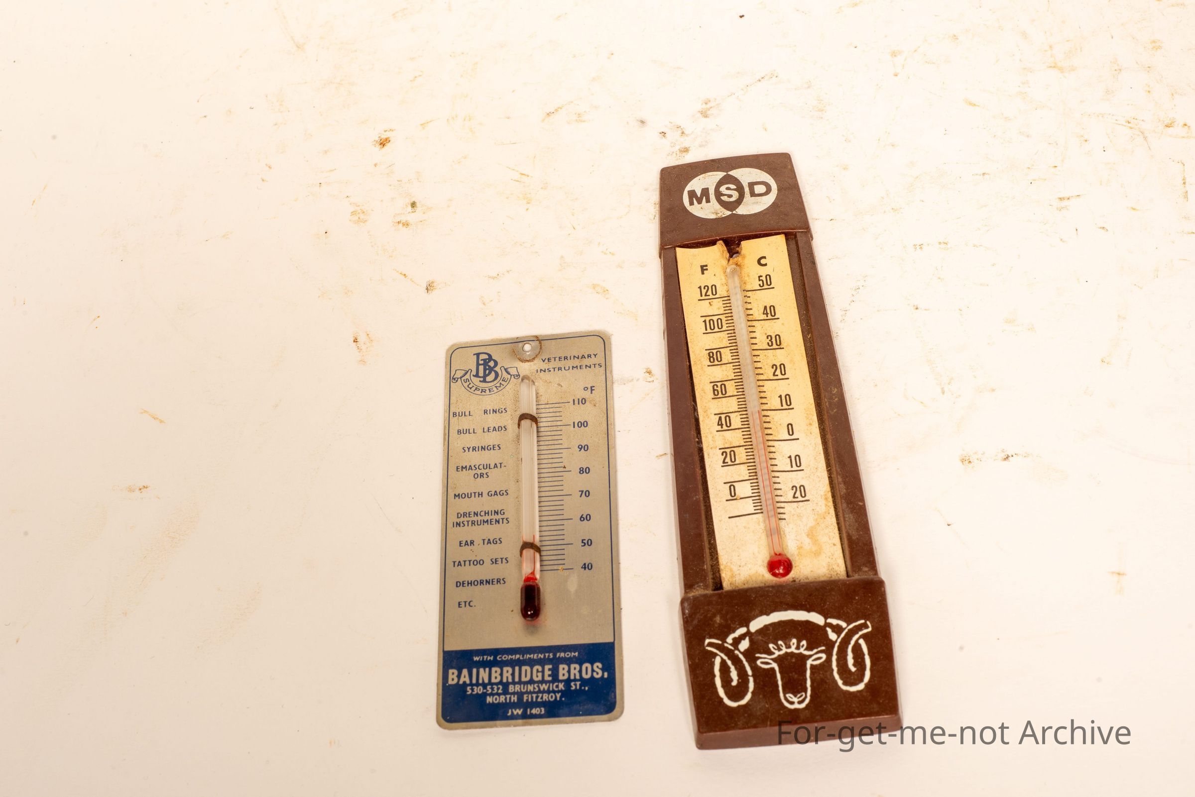 Are 2, temperature thermometers. 1 from Bainbridge Brothers, North Fitzroy, manufacturers of veterinary instruments. The second one is from Merck, Sharp, Dome who were manufacturers of animal health products.Collection