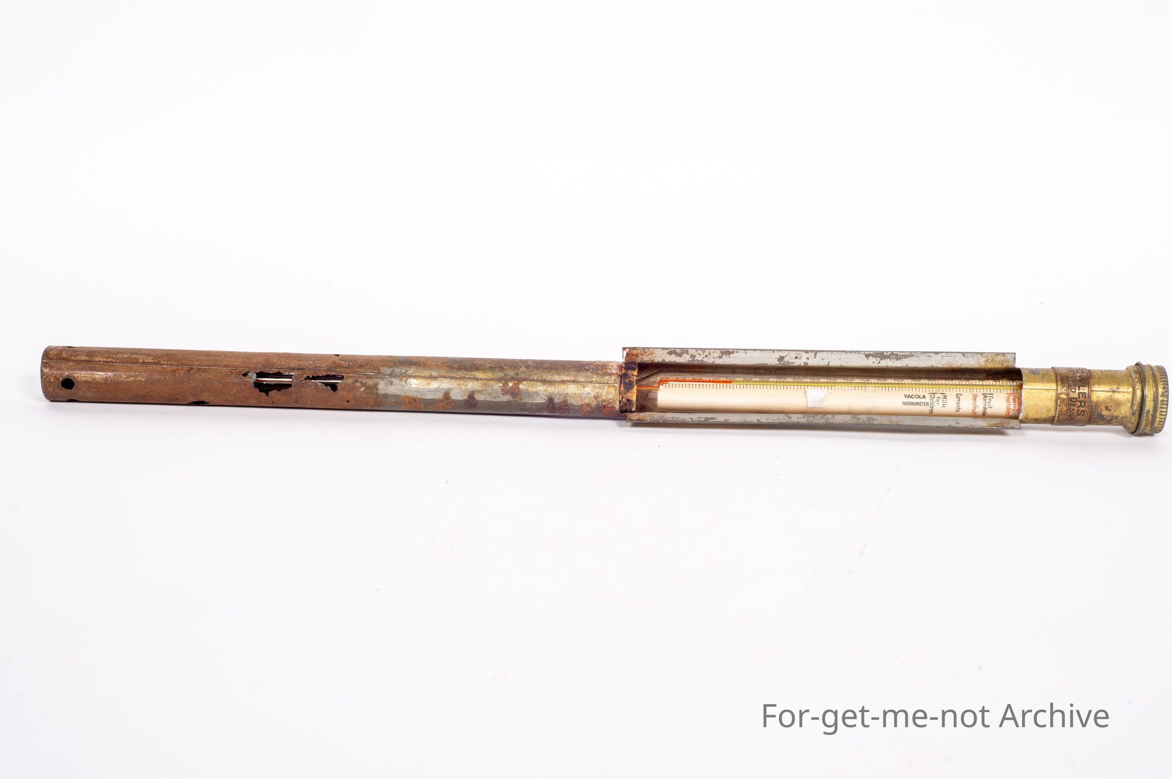 This is the Fowler's temperature Gauge for when doing fruit preserving in the equipment. This is a registered design, a screw top lid. It has the thermometer in it with indications for all the different products, milk for children, stone fruit, fruit marmalade, quite complex. I would say this is a pretty rare piece,Collection