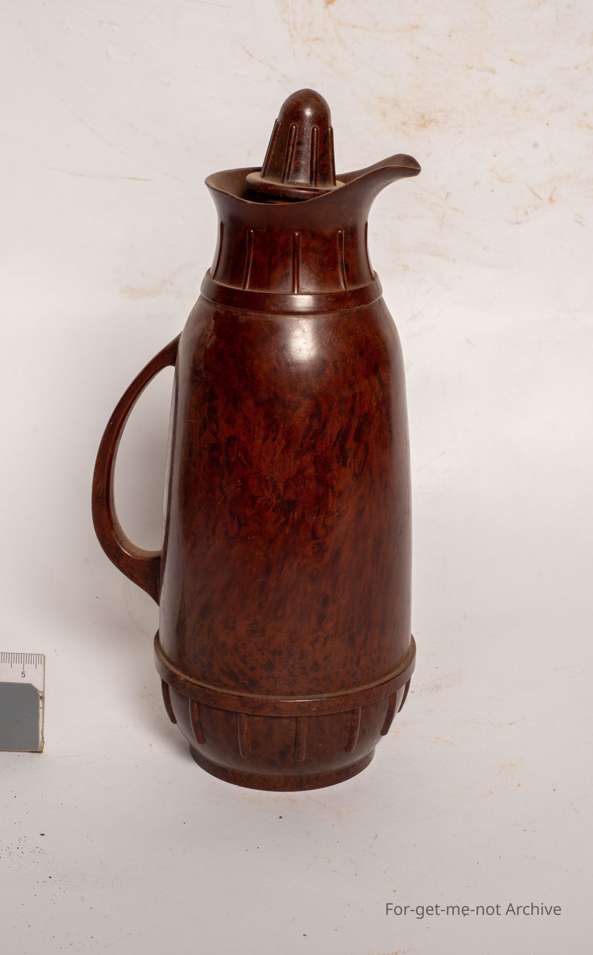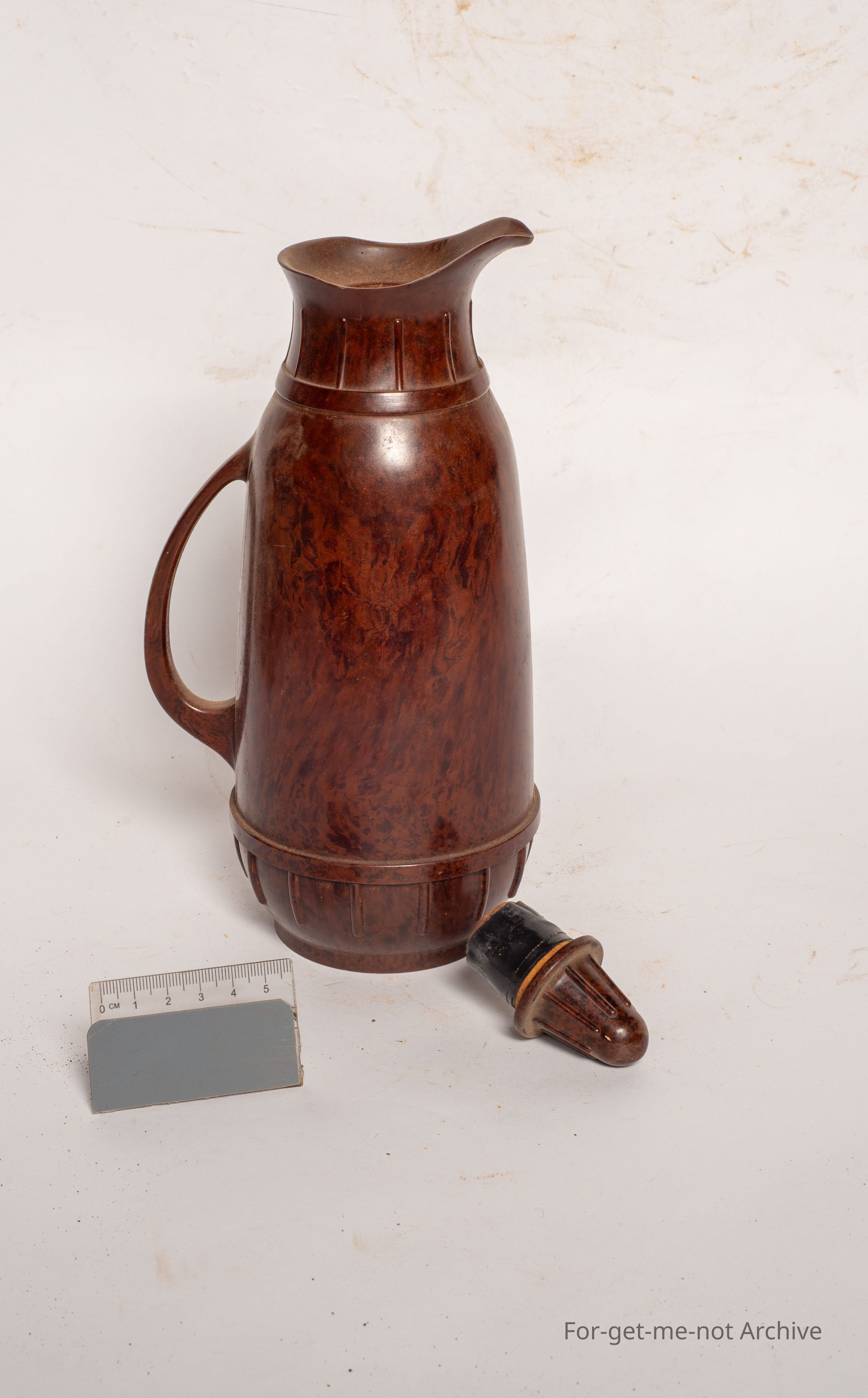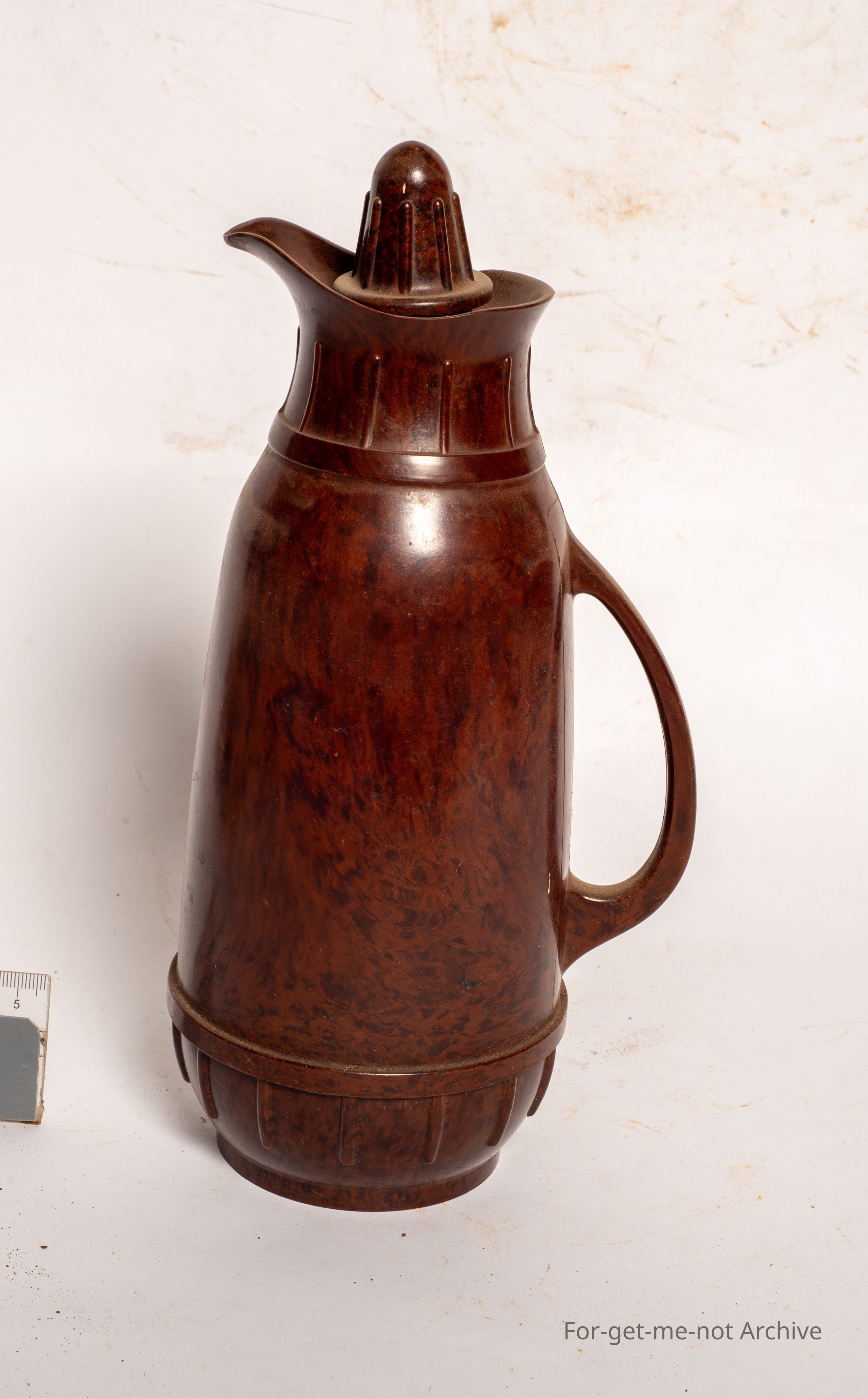 This is a lovely full Bakelite thermos flask with the original cork. Lovely handle in a mottled brown, colour. Says on the base, Thermos made in England, London.