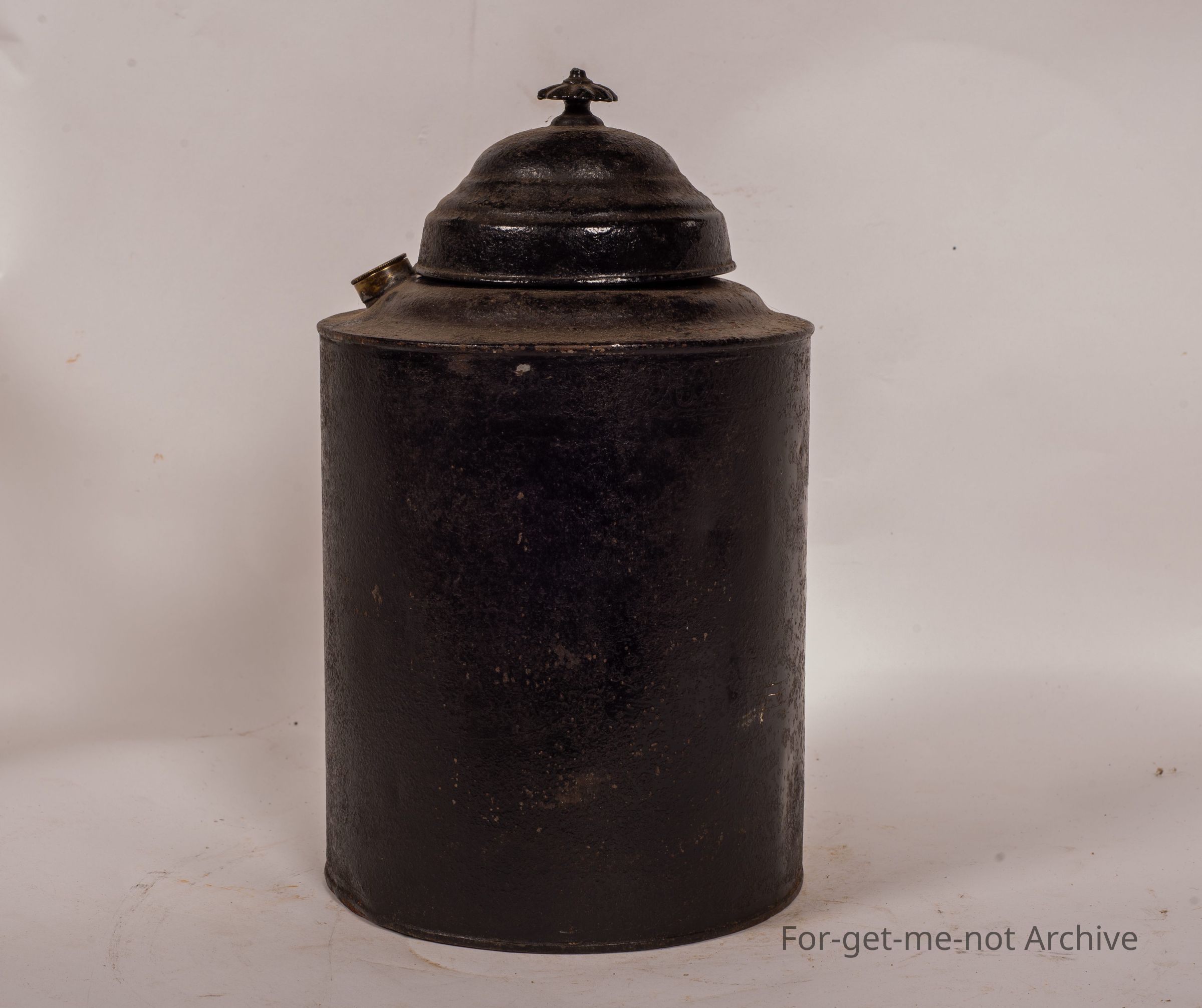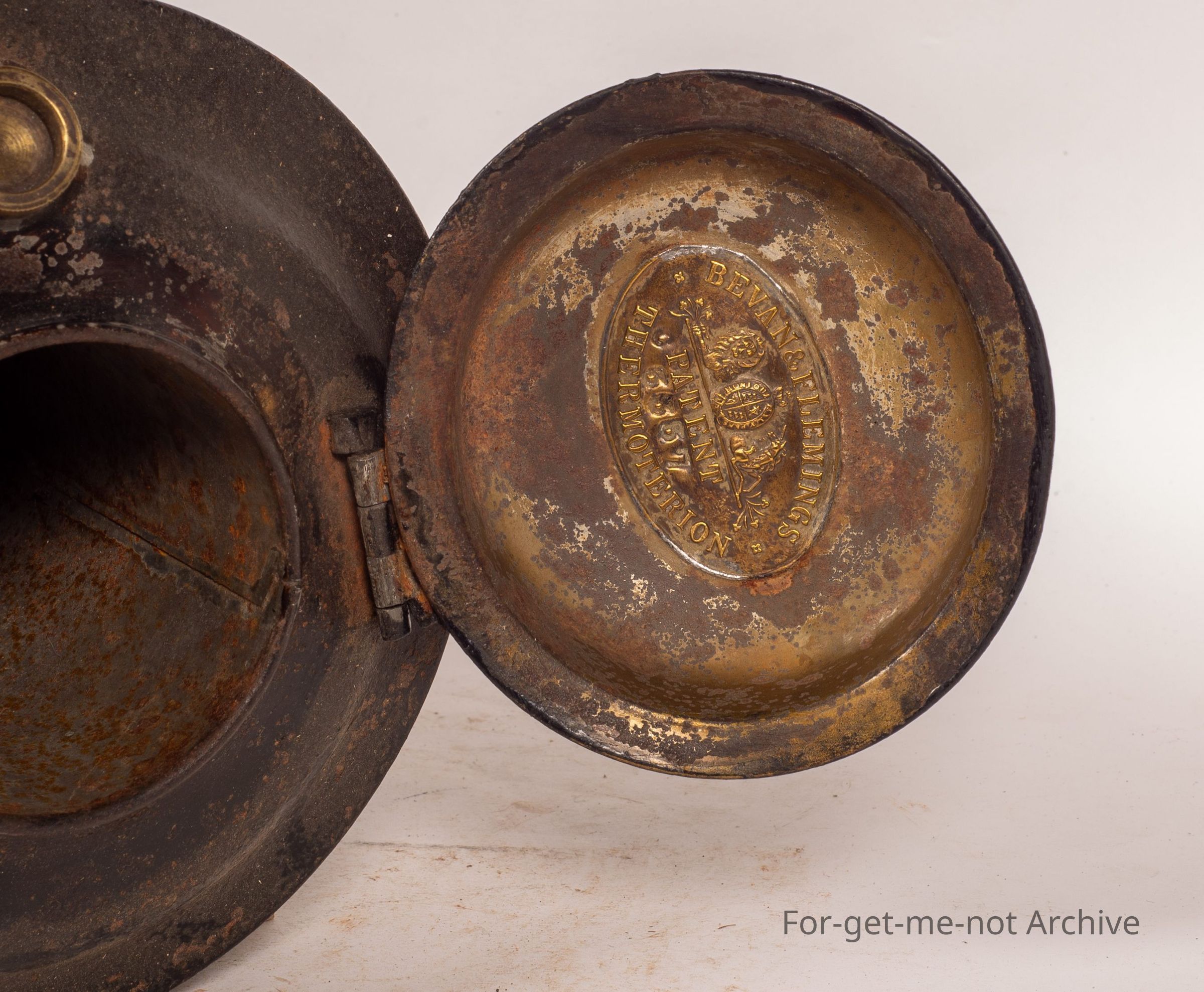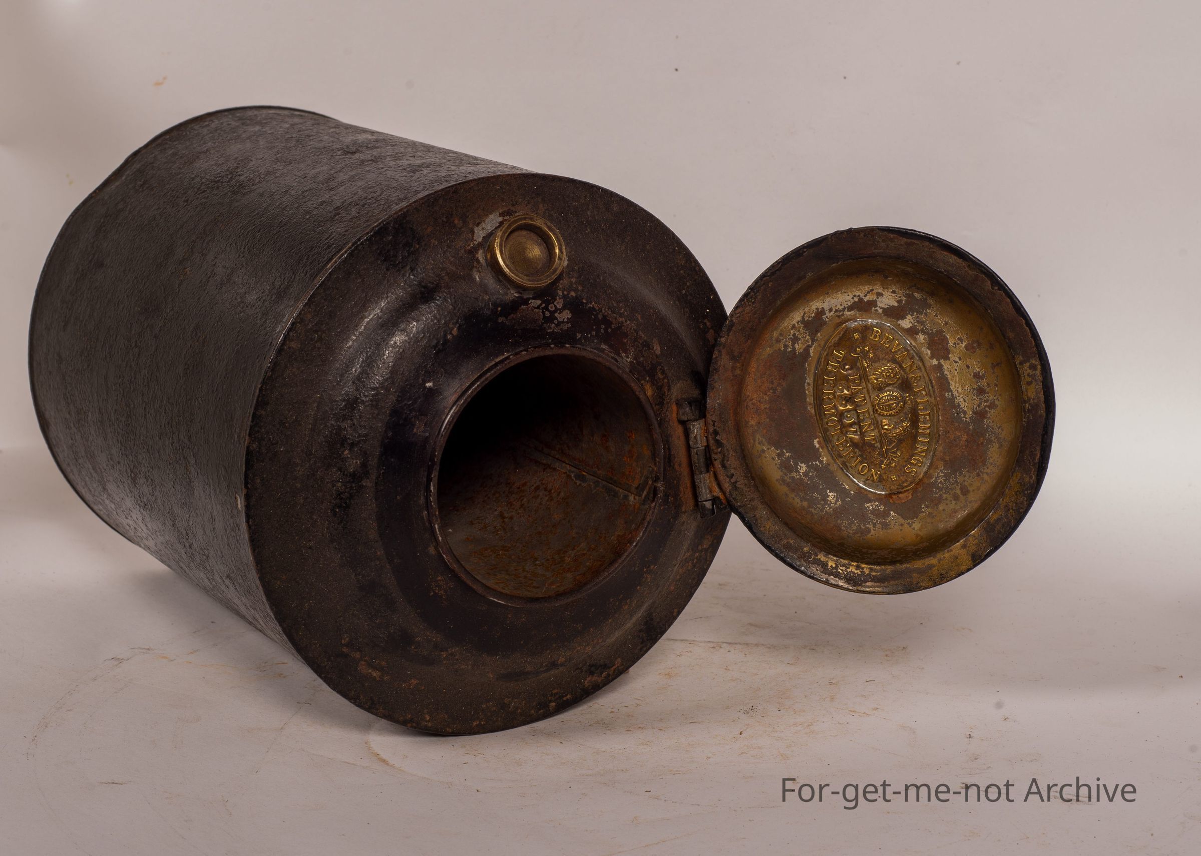 This is a very, very early thermos called a Thermoterion, made by Bevan and Flemings. Patent British coat of arms. Beautiful manufacturer's plaque inside the lid. This thermos would have held boiling water or freezing water internally for a relatively small quantity that had held itself. This would be the very beginning of making thermoses.Collection