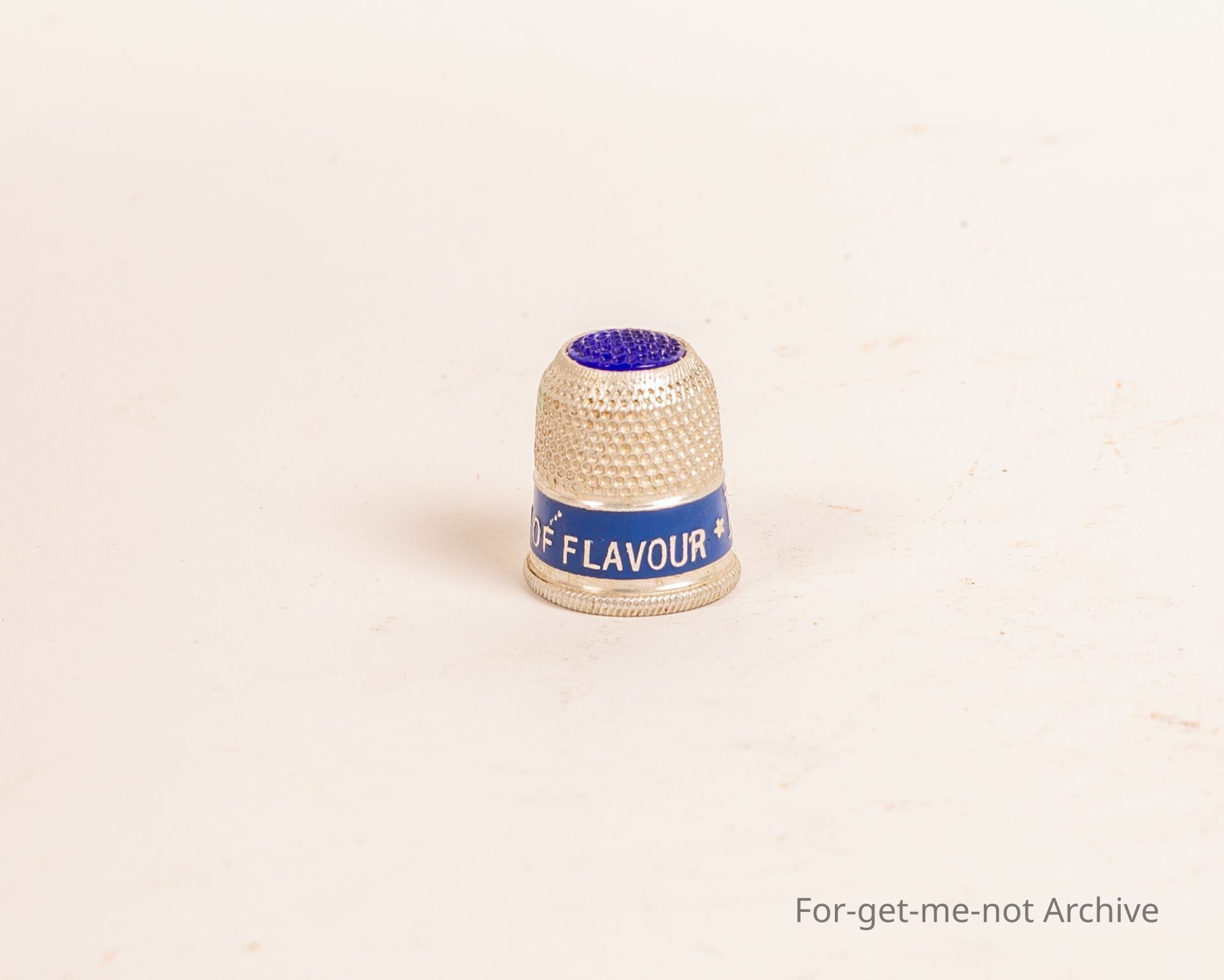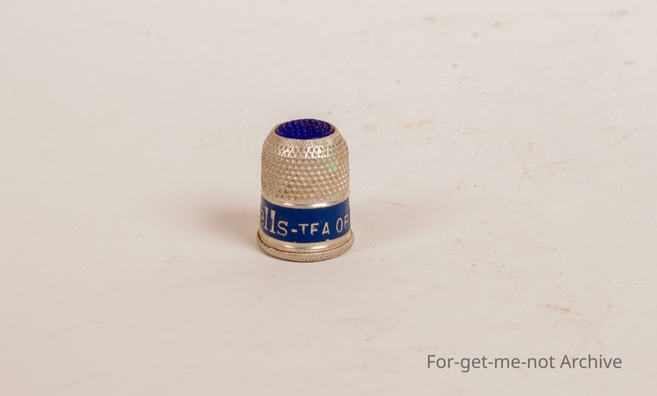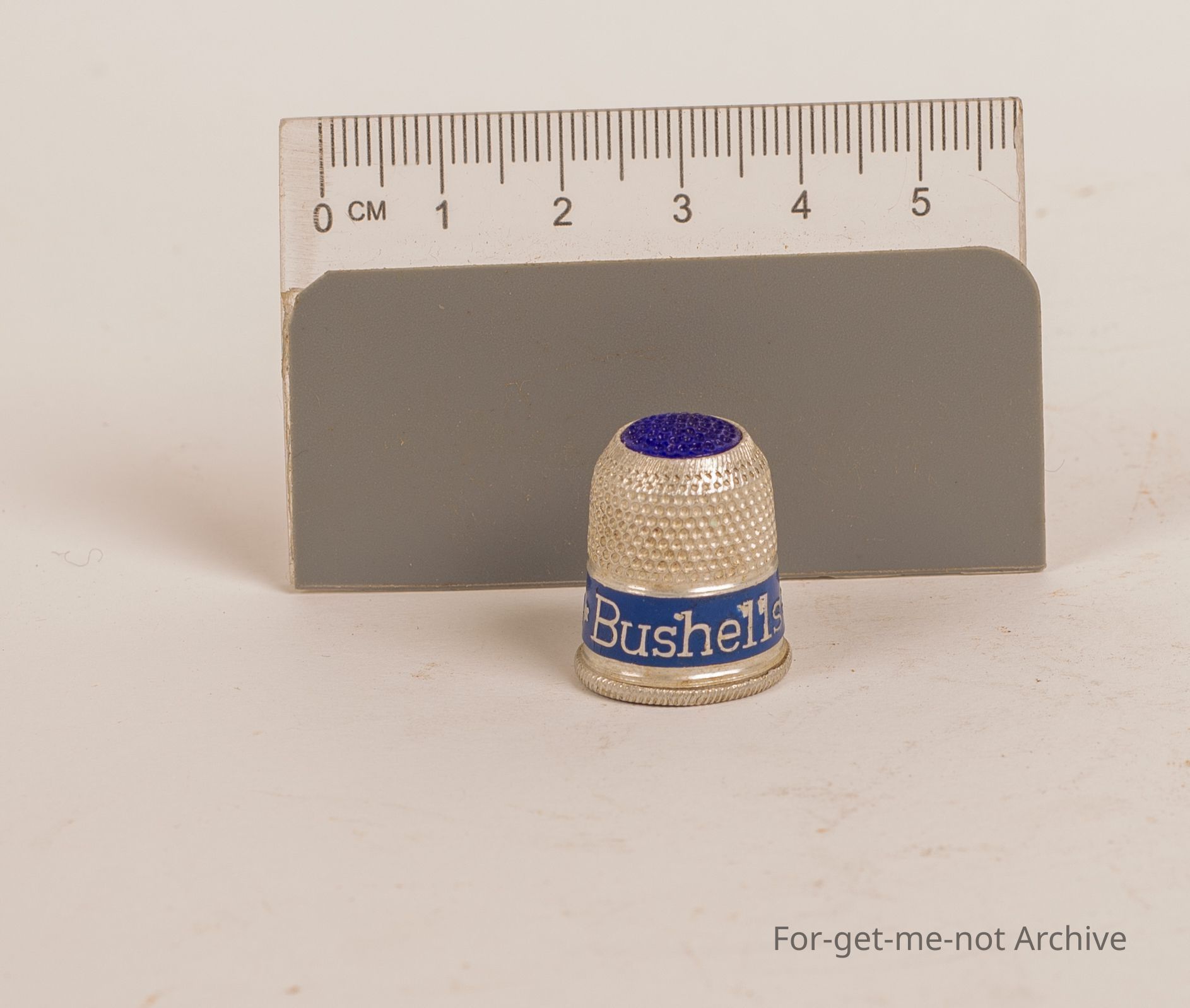 Small thimble. Advertising Bushels Tea. Made of aluminium with blue paint on the bottom and a blue top which is dimpled.