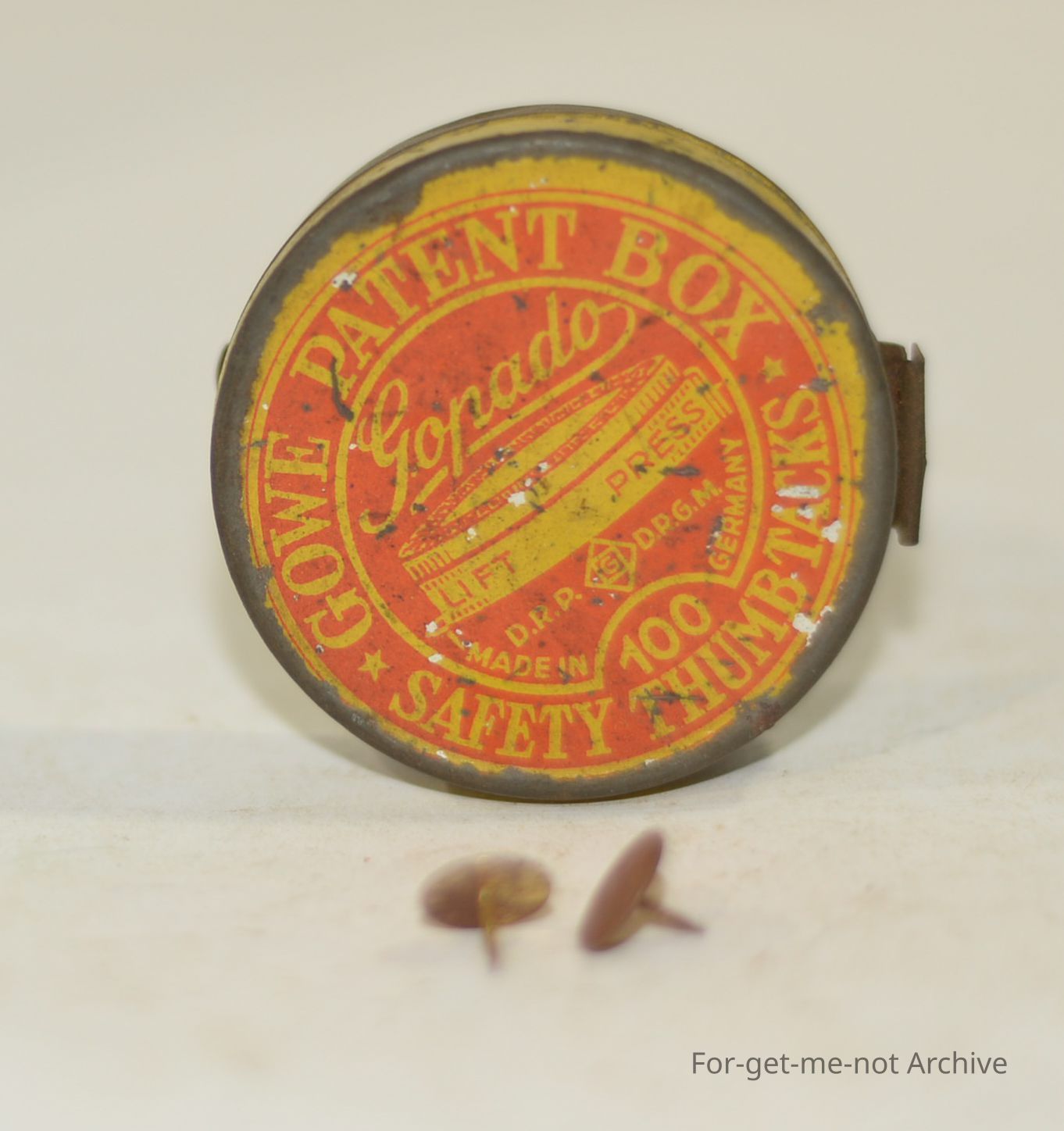 "Gowe Patent Box " Safety Thumb Tacks made in Germany, the container has special mechanism for dispensing the tacks