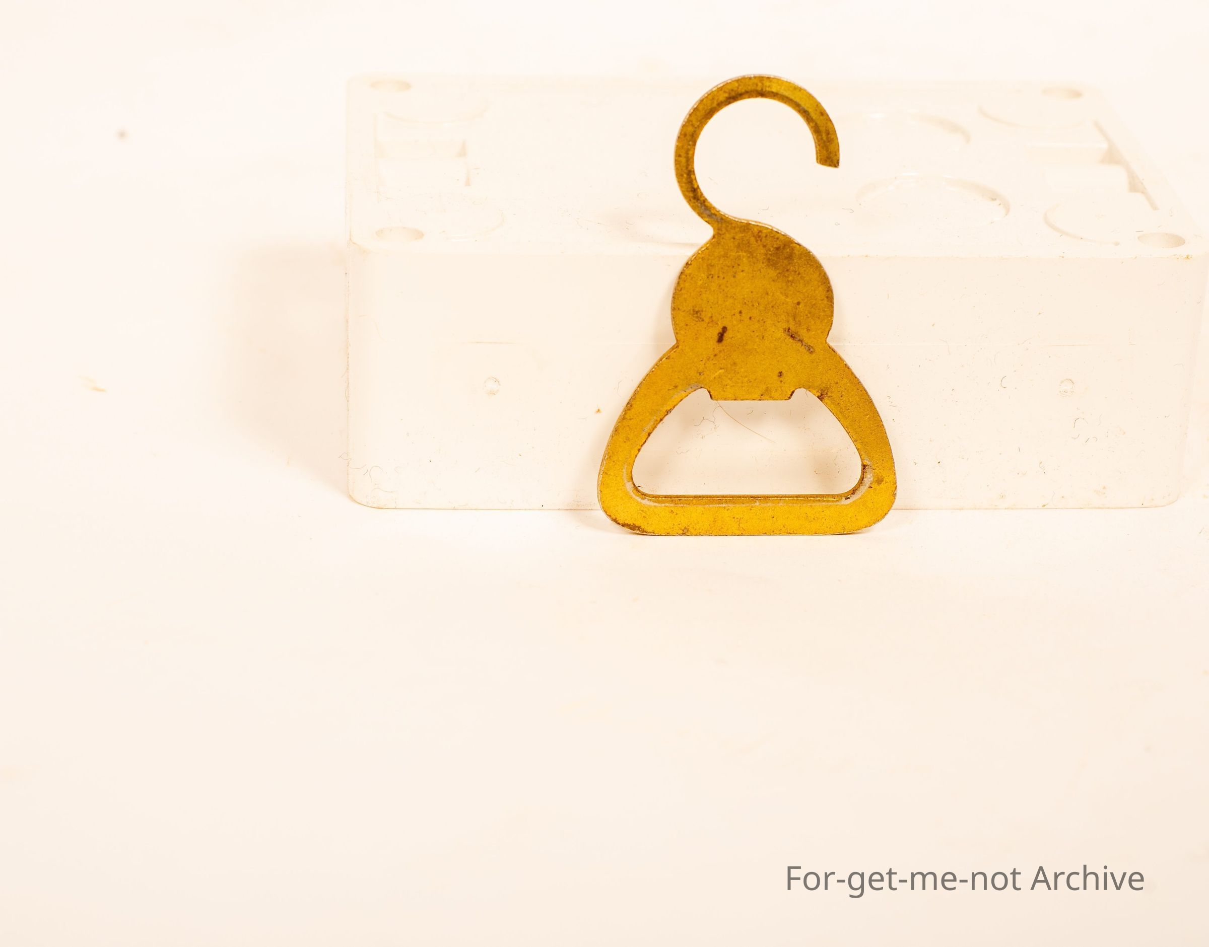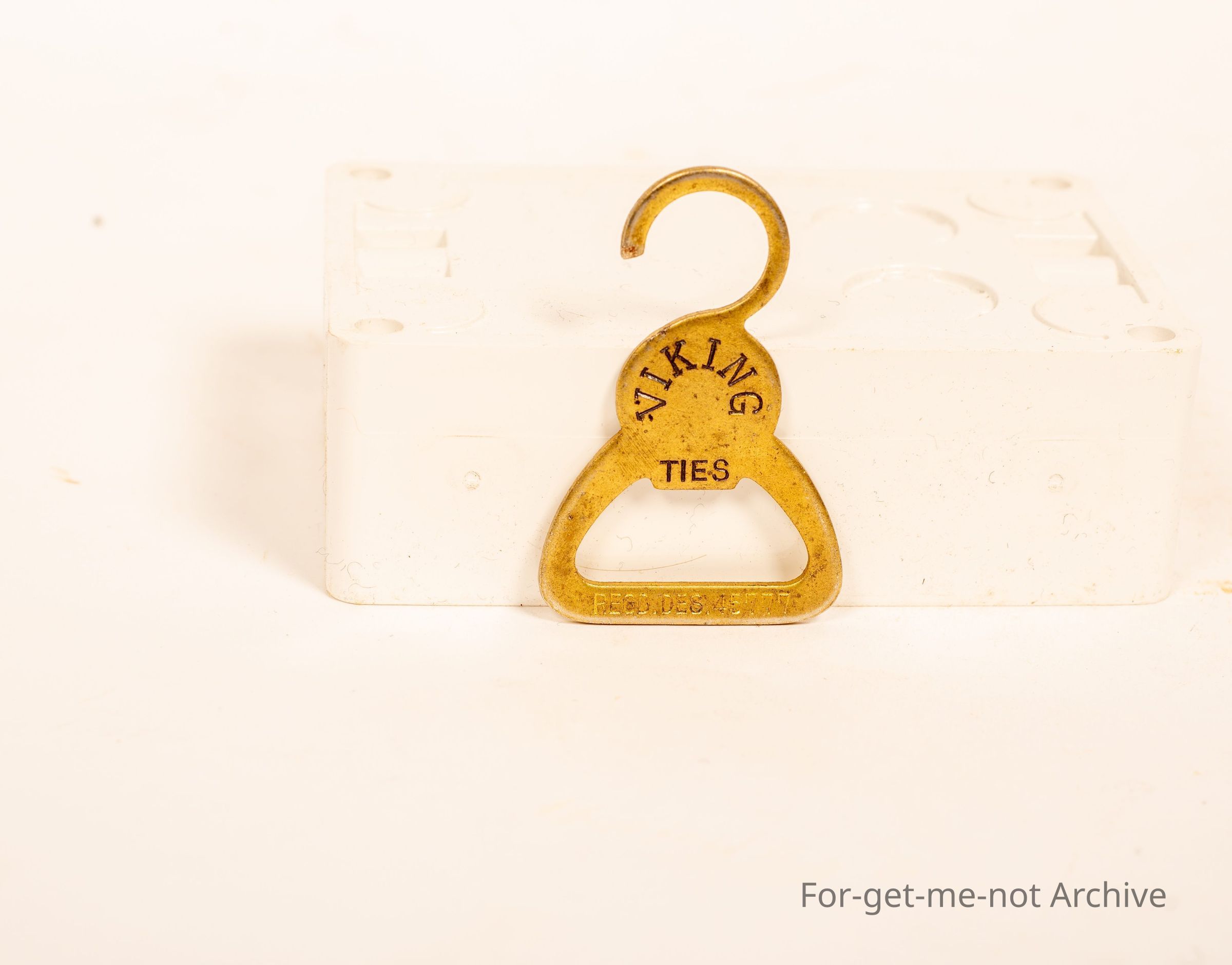 An advertising piece for a tie company in the form of a bottle opener and tie hanger