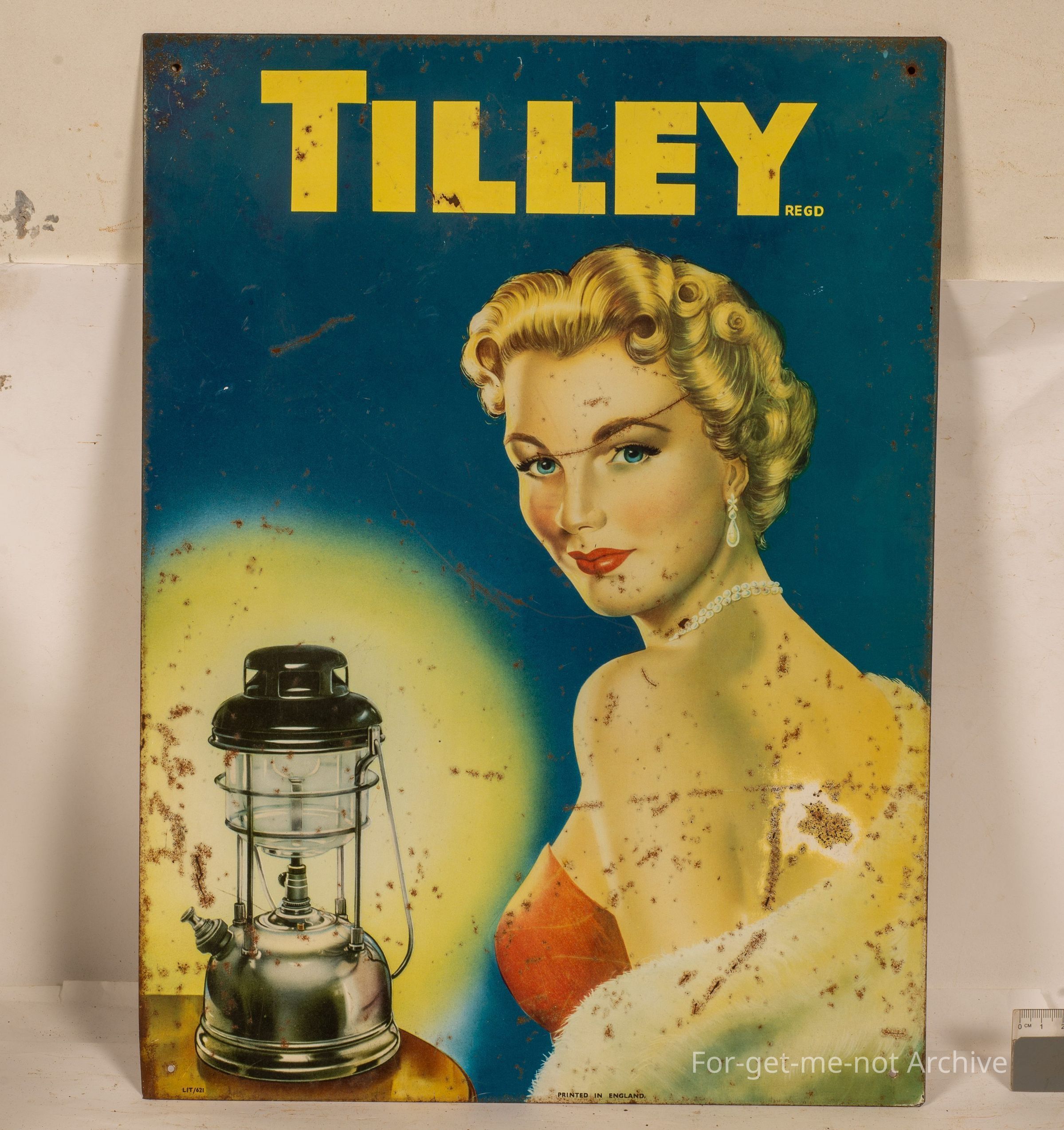 Sangeet Collection. This is a Tilley sign This one is also printed in England. A lady, in the light of a Tilly pressure lamp. This one has a little bit of foxing, but other than that, very good.Collection