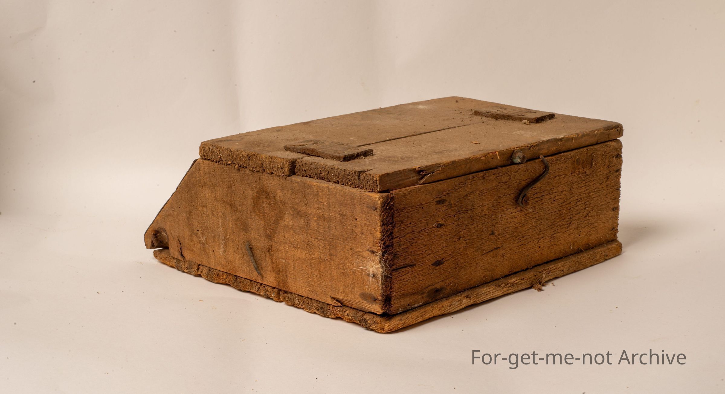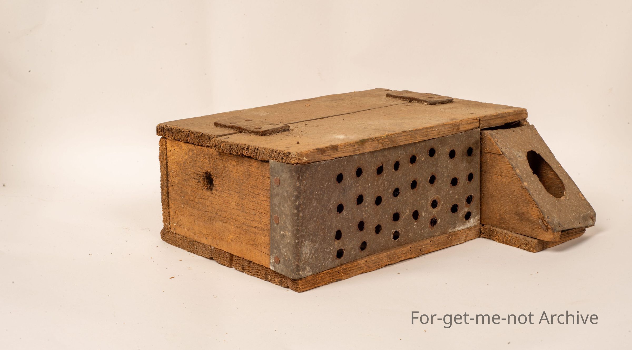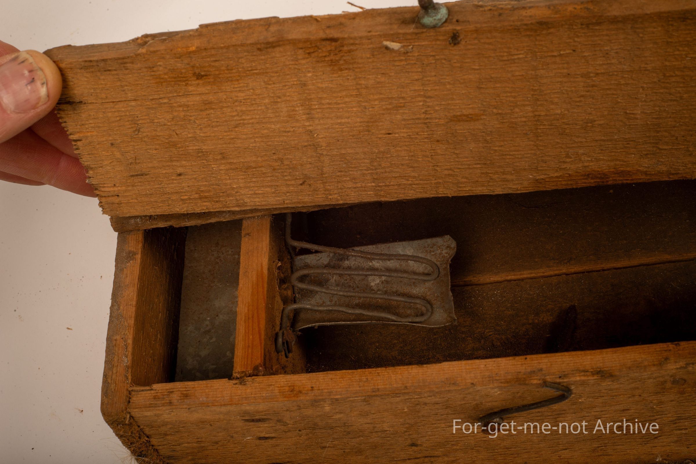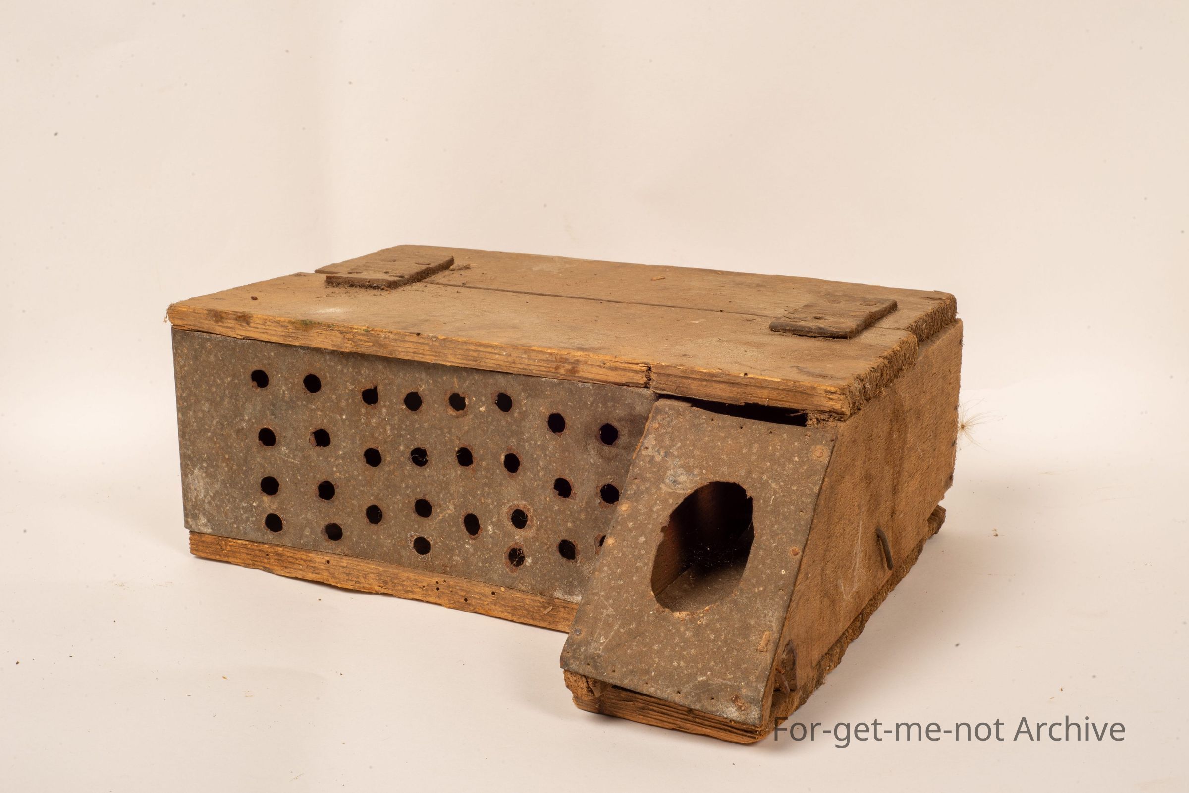 Depression Hero Homemade Fastrack. This is made from scrap timber, leather hinges, a wire catch. The inside has a tilt tray with a wire piece over the top that when the mice run-in, they cannot get out. Completely improvised. Wonderful piece.Collection