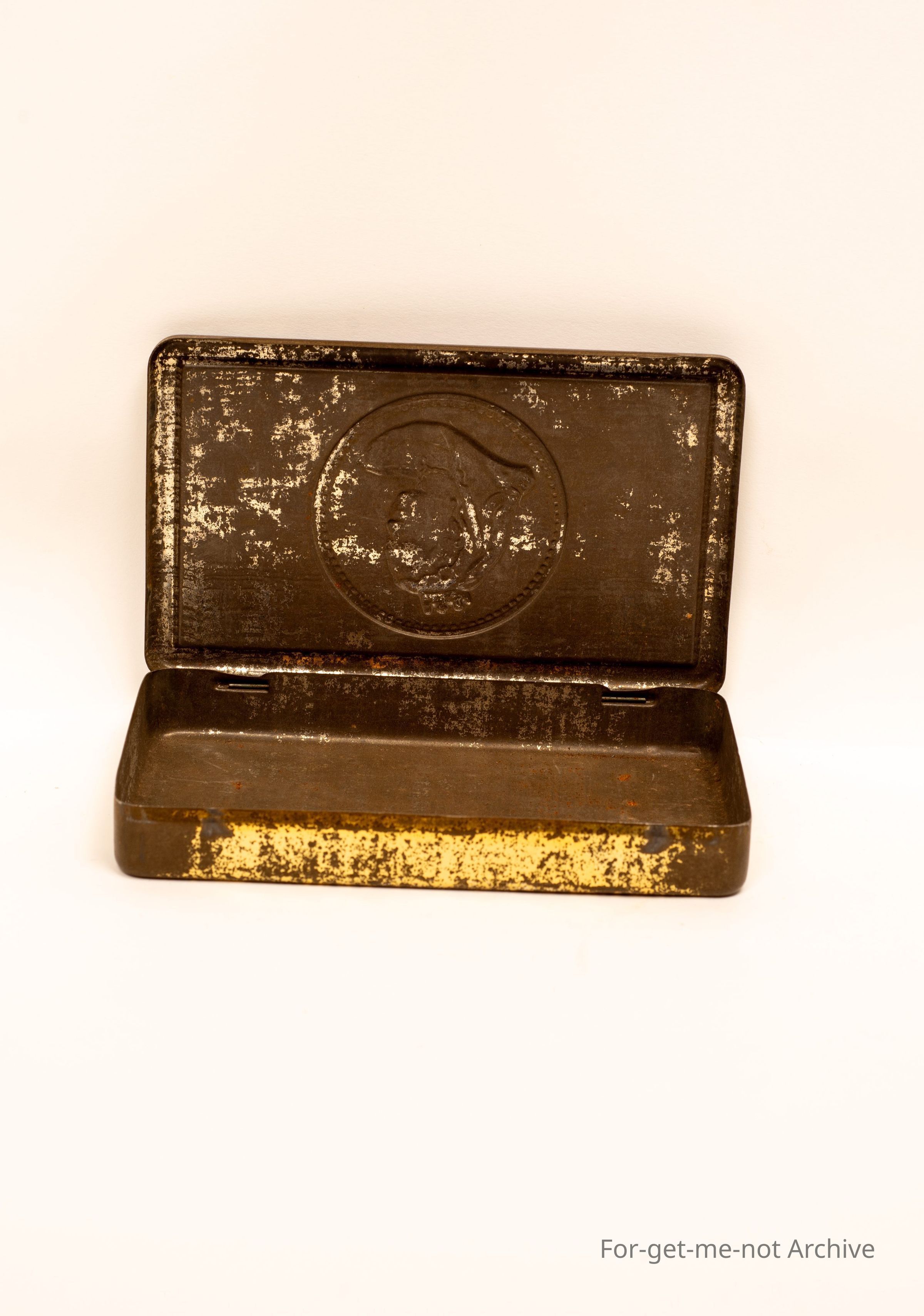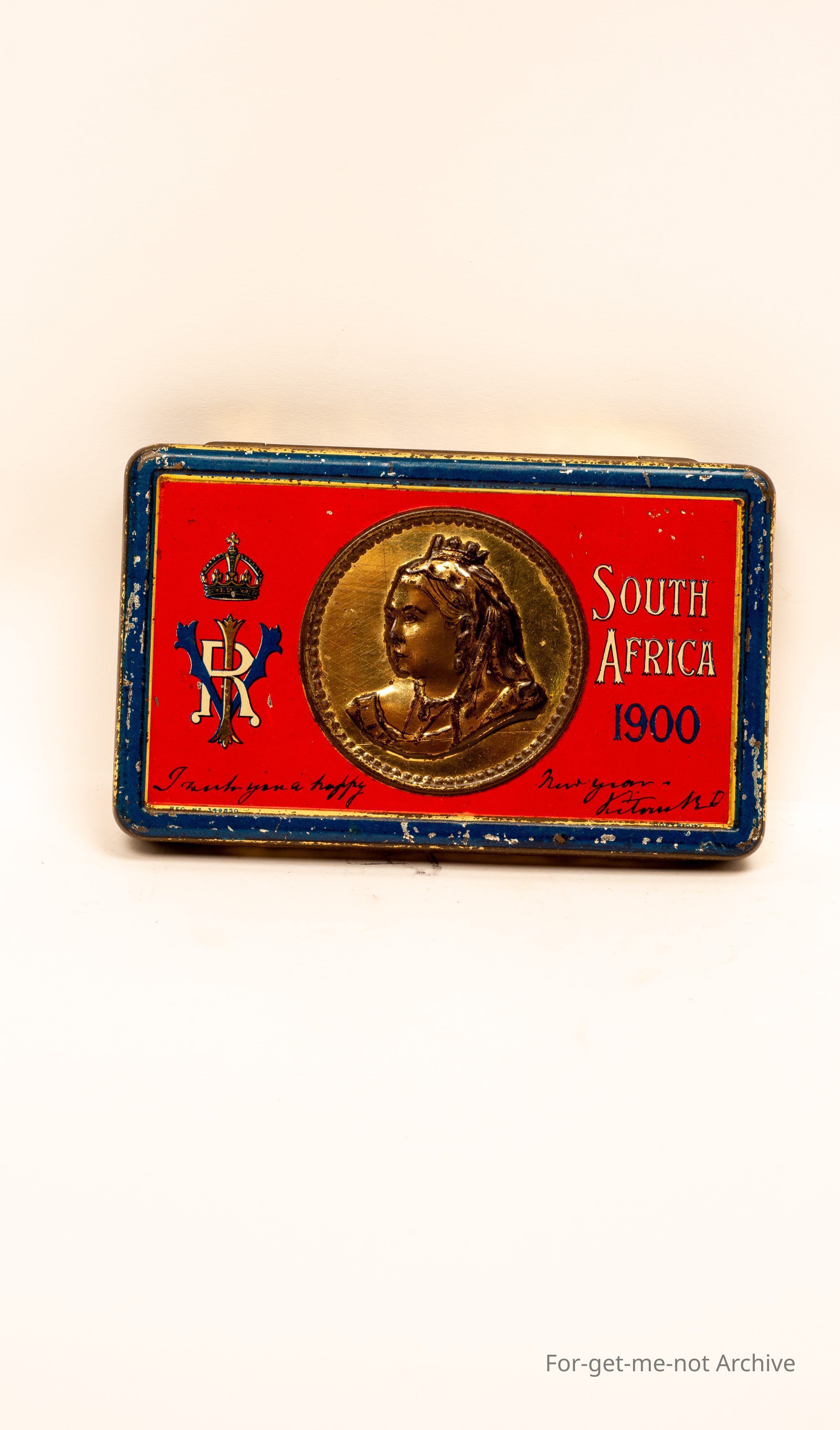 This commemorative tin originally contained chocolate. It was given to the troops serving in the Boer War as a New Year gift from Queen Victoria. The three major British chocolate manufacturers, Fry, Cadbury and Rowntree, all Quaker owned companies, produced the chocolate tins. Initially they were reluctant to support the war effort because of the Quaker pacifist ethic, but were persuaded to change their minds. The three companies' tins vary slightly in appearance. The tin shown here is a Cadbury's tin, manufactured by Hudson Scott. It is slightly smaller than the other two company tins. In addition each type of tin is printed in a different shade of blue, with the borders of differing widths, and the Queen's medallion in the centre is not the same.Collection