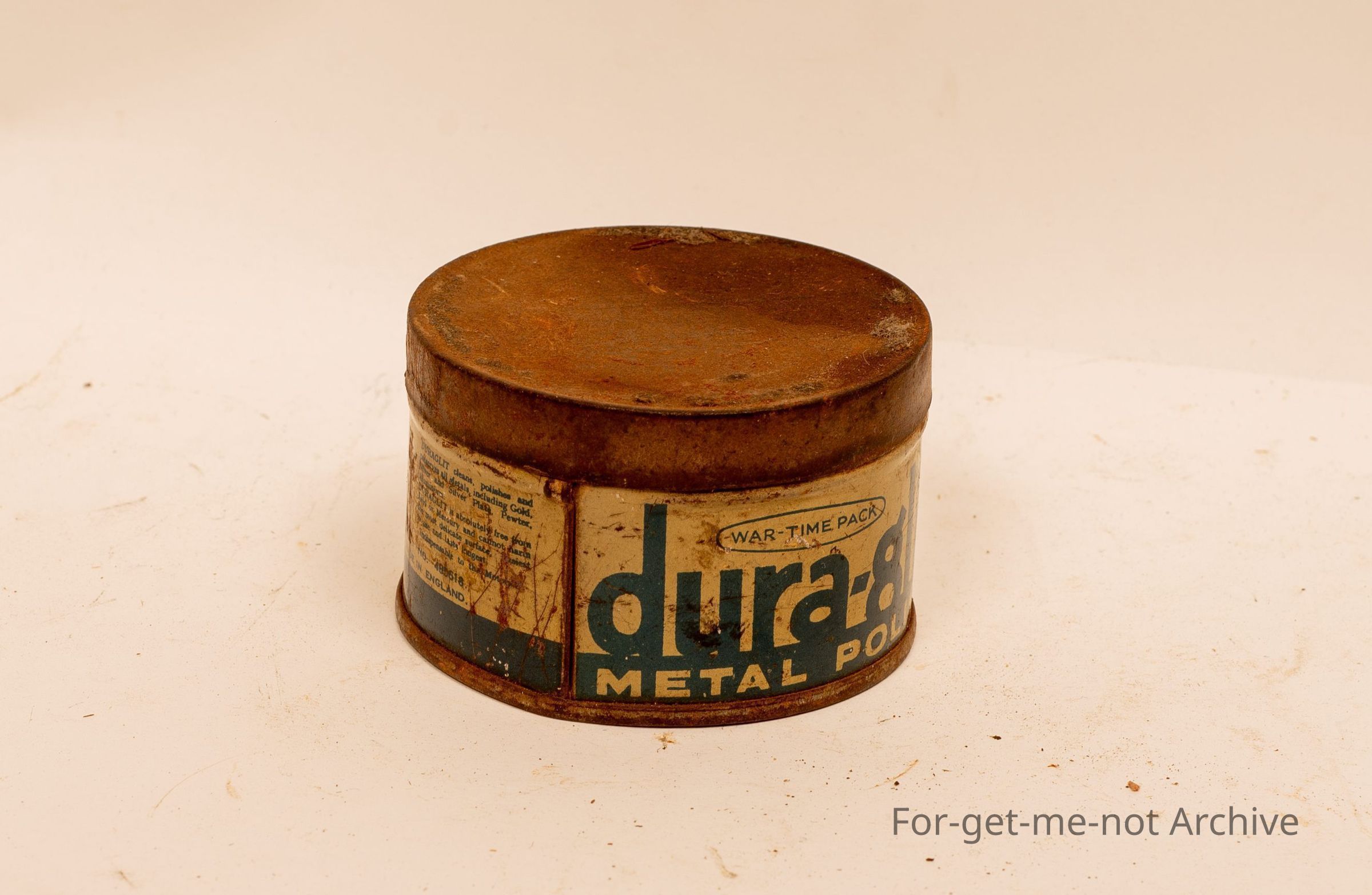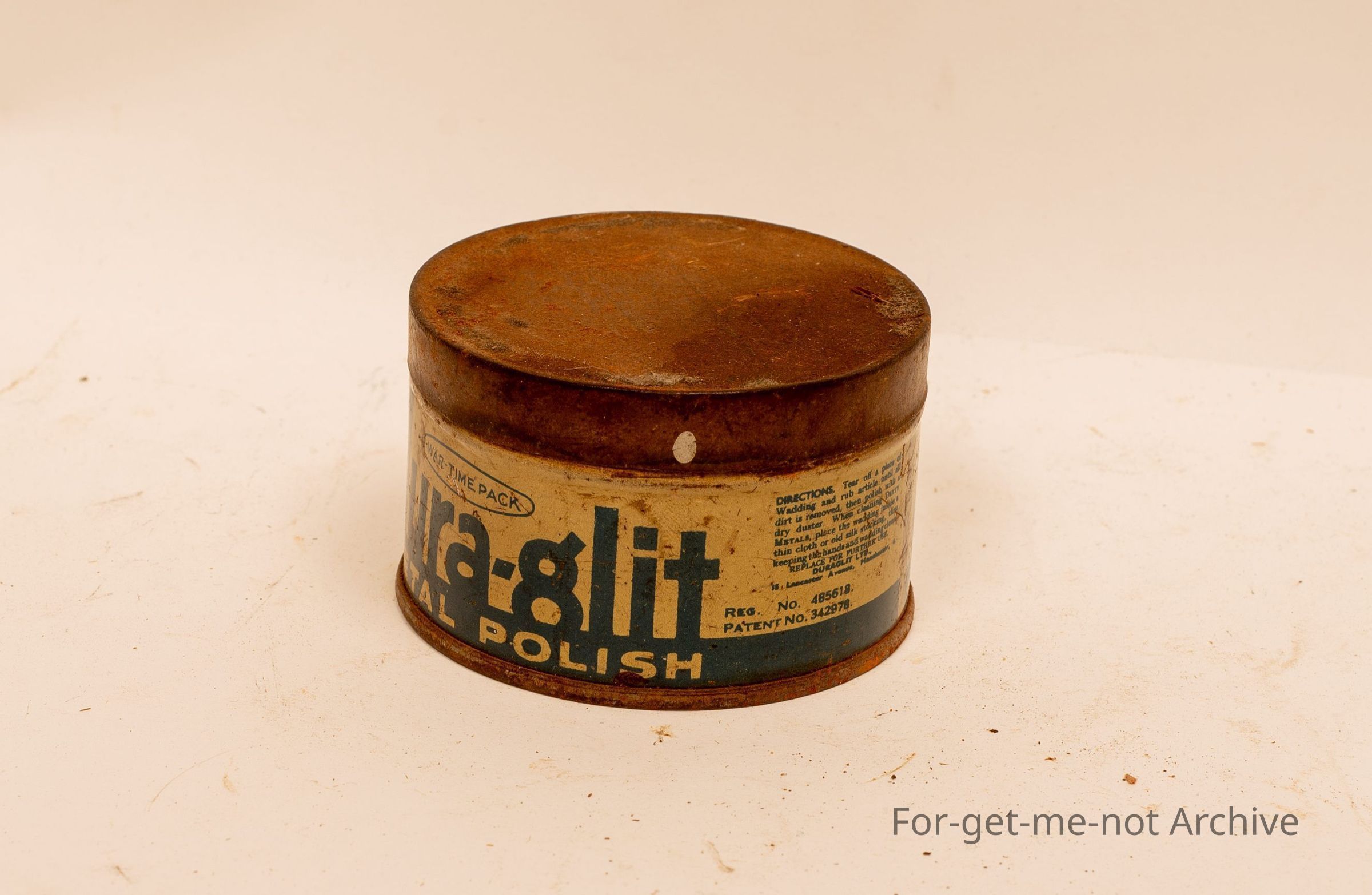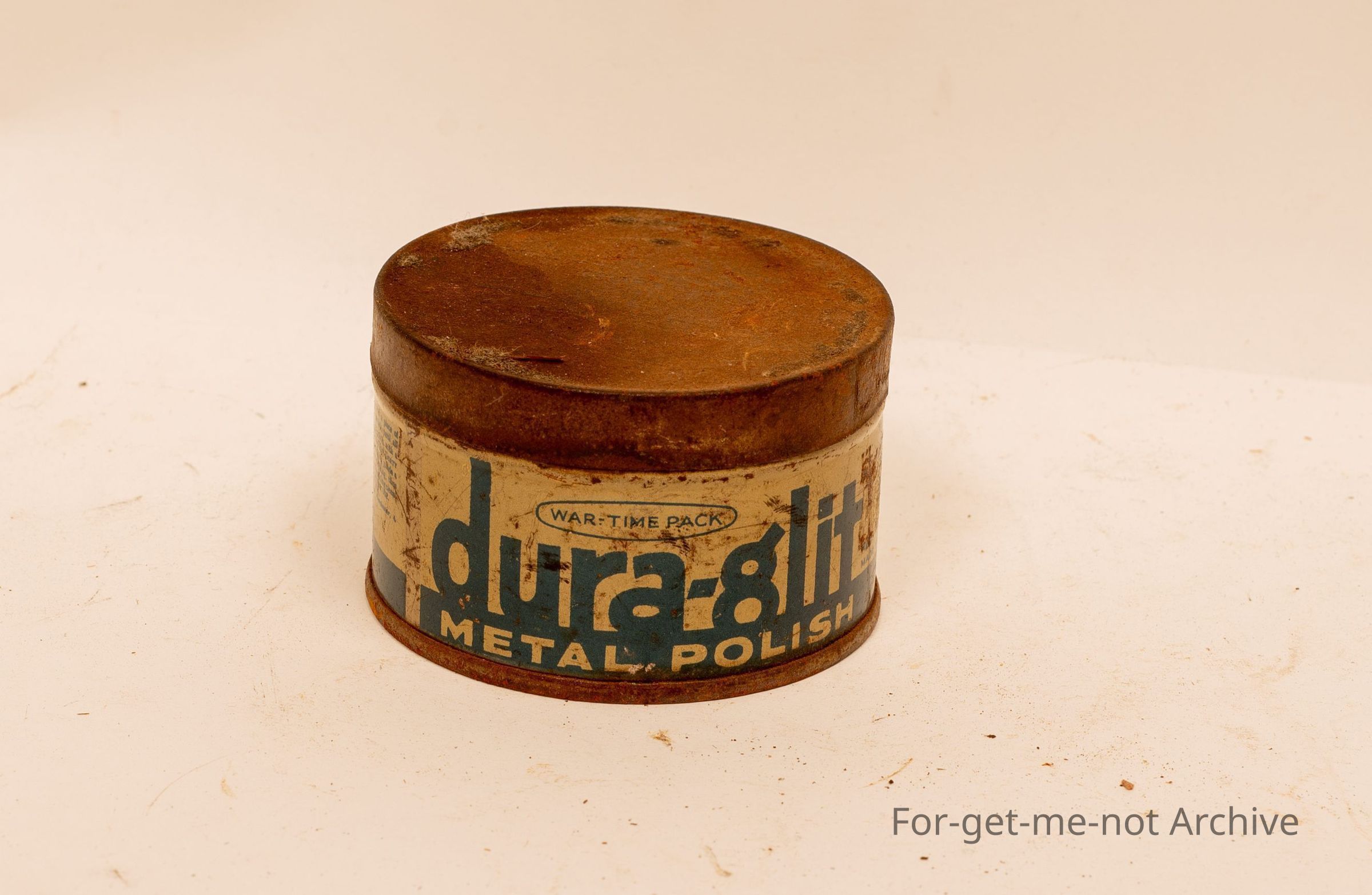 A tin of Dura Glit metal polish. In war time packaging
