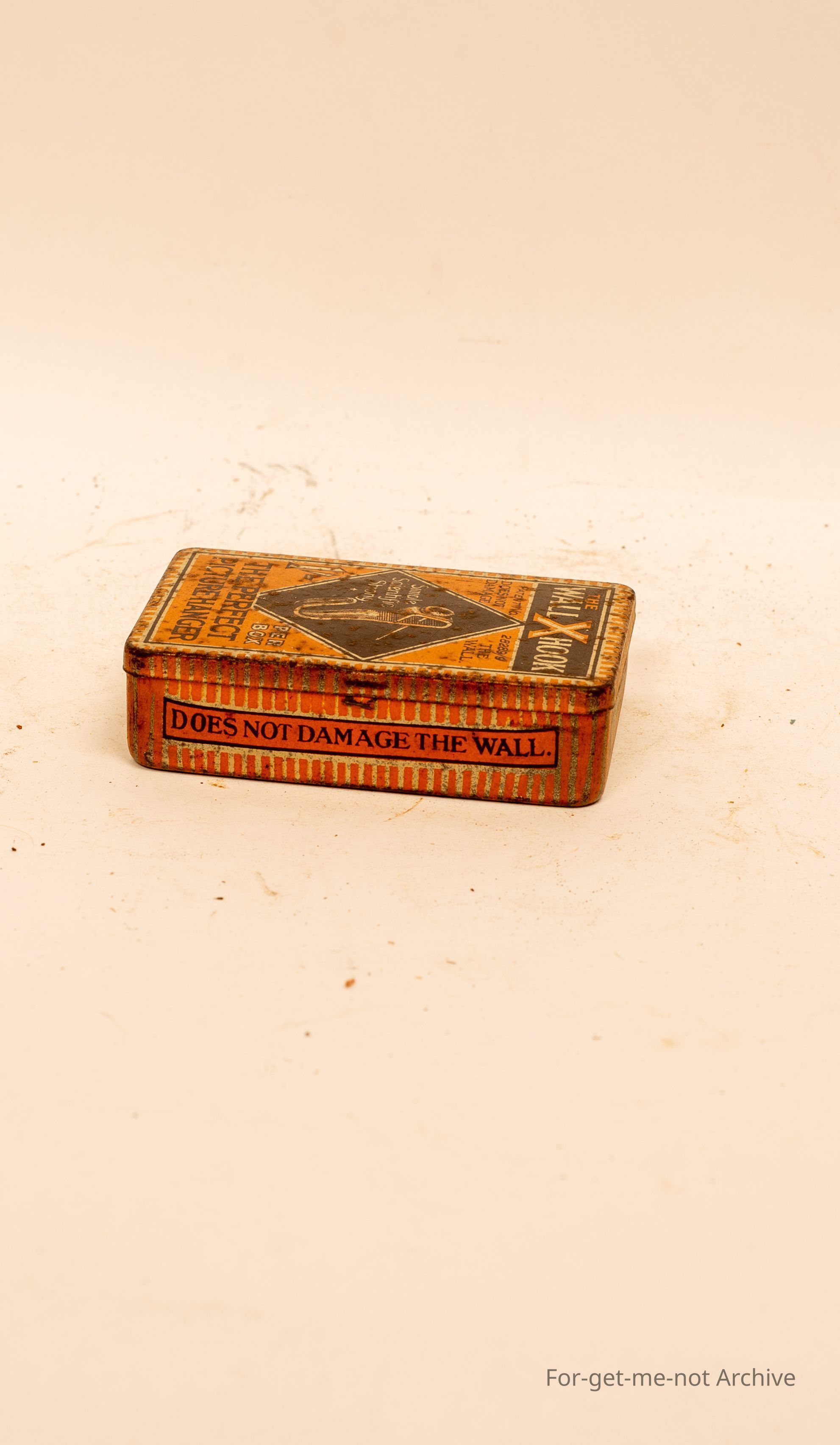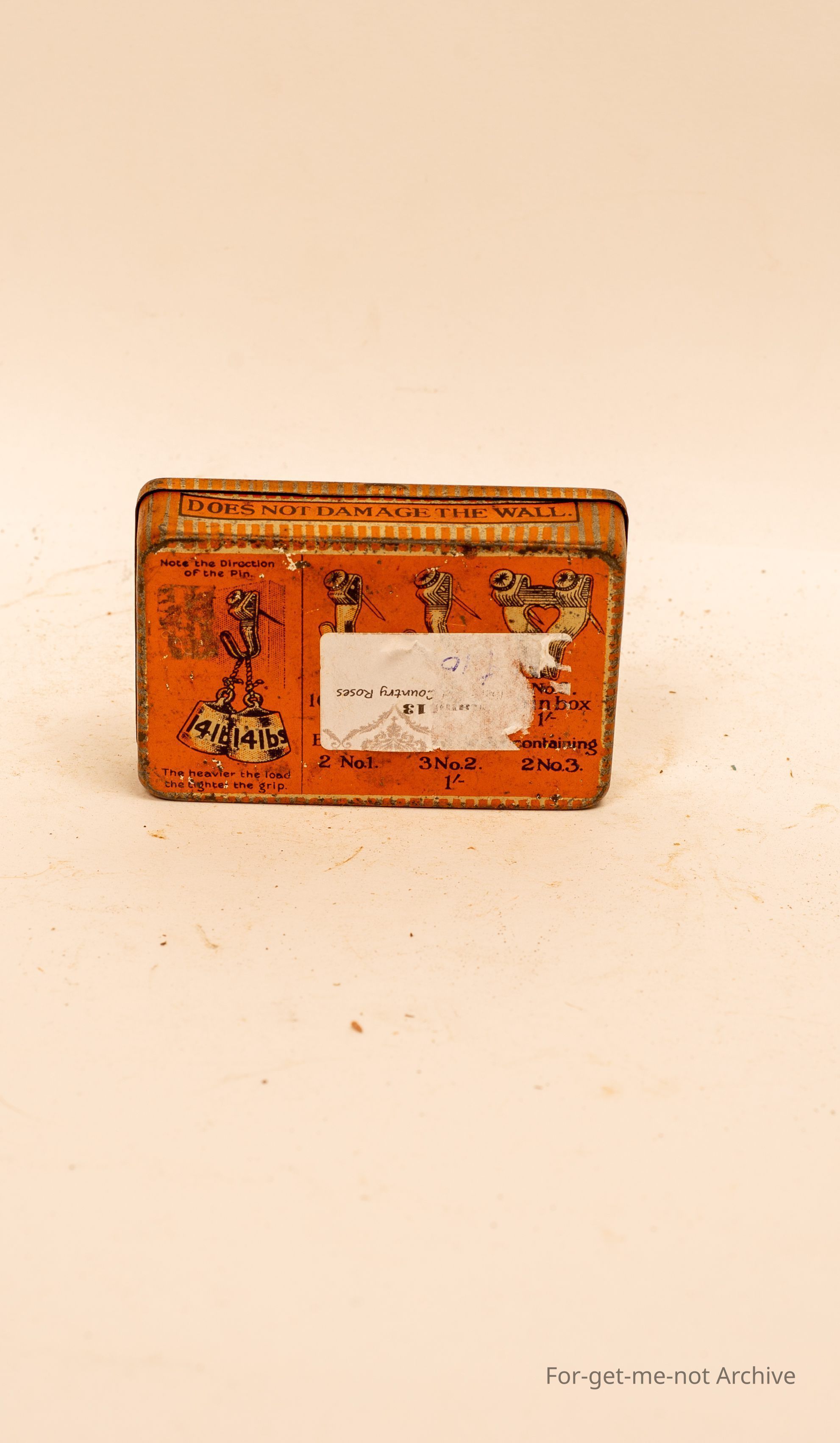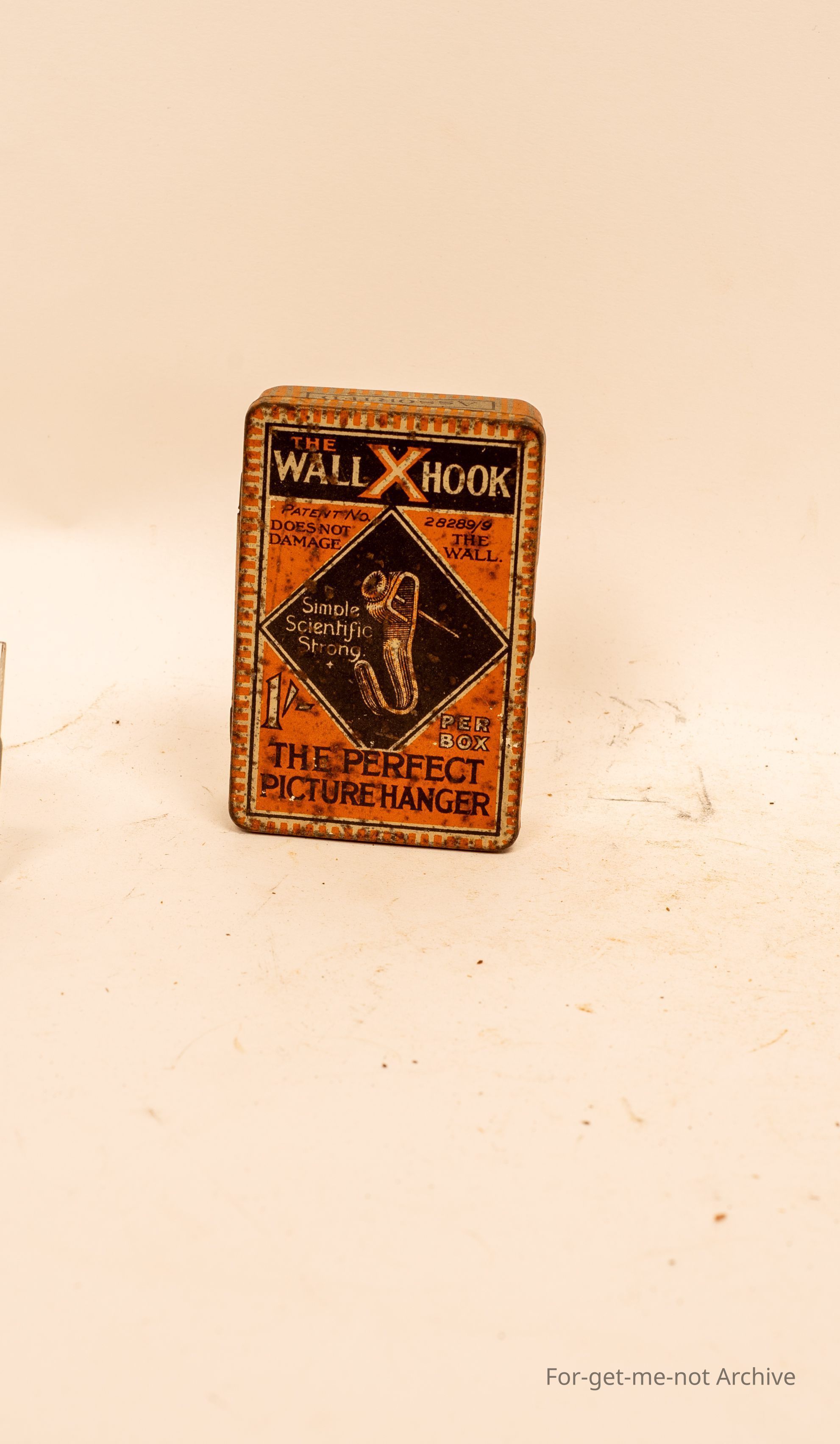 Small tin, The wall hooks, the perfect picture hanger. Nice graphics, down condition,