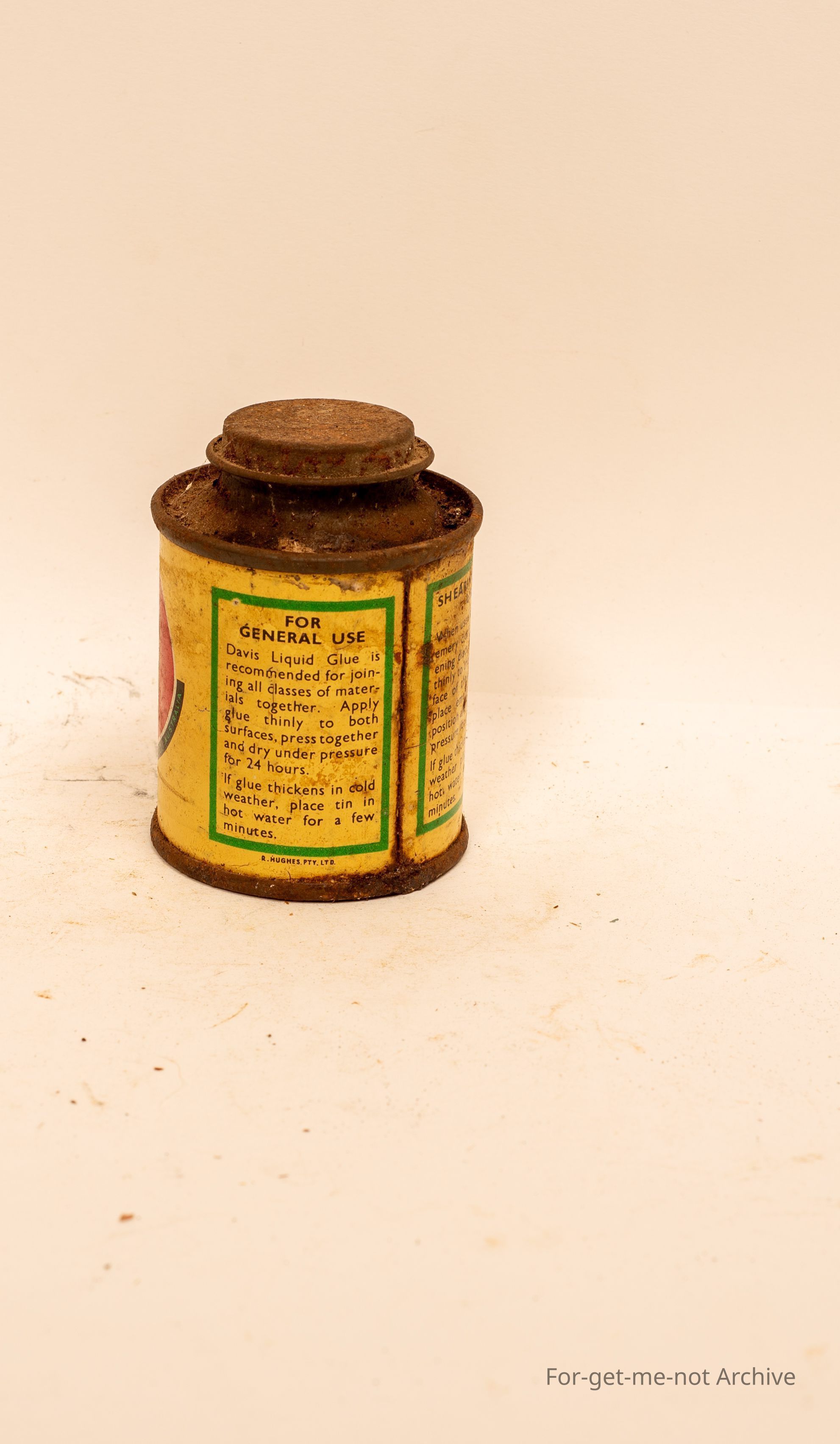 Small tin of Davis liquid glue, 4 ounce capacity, shearing shed use for gluing papers to grinder.