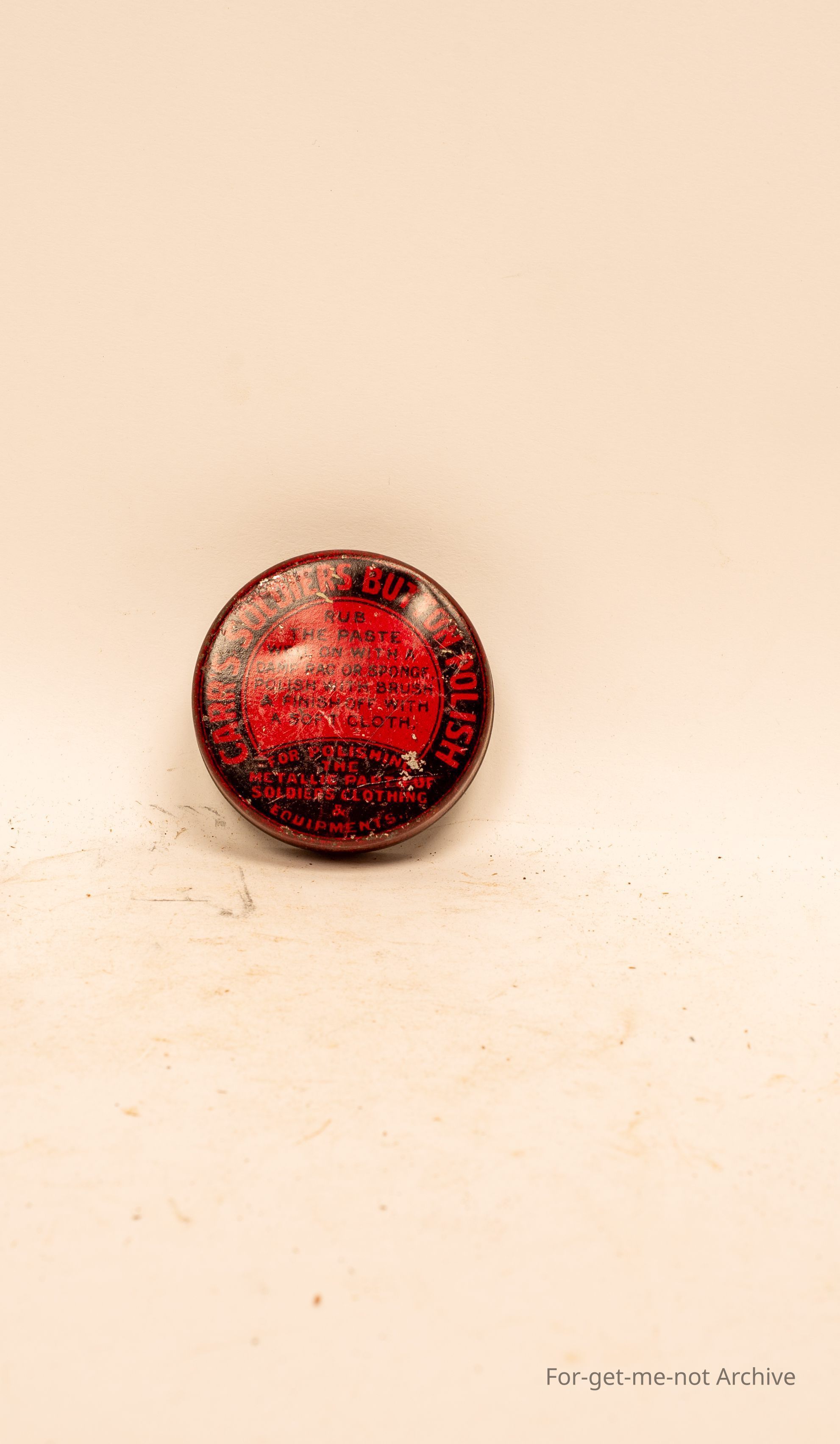 "Carrs", soldiers, button polish. Believed to be from First World War. Apply the paste well with a damp rag or sponge. Beautiful early tin