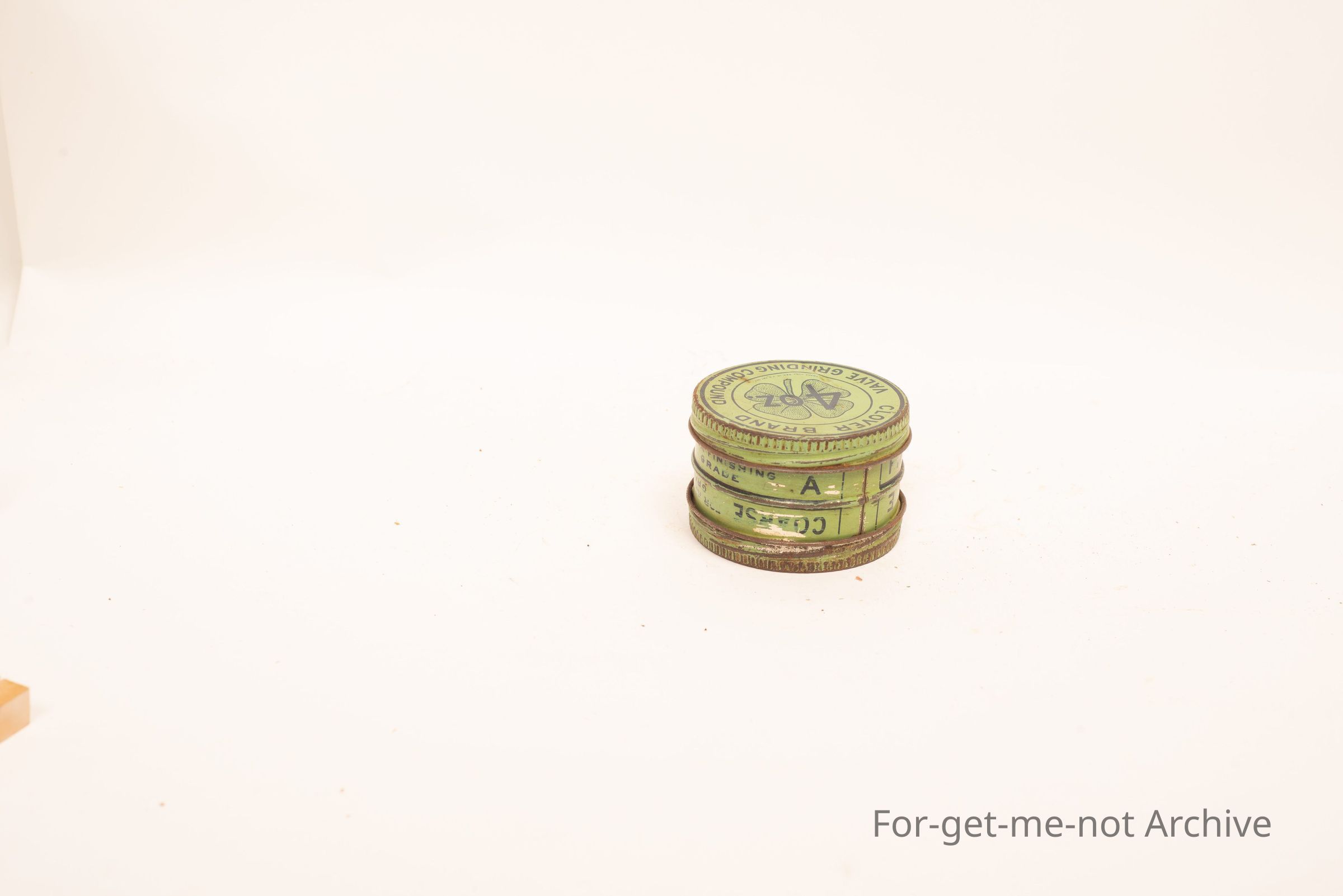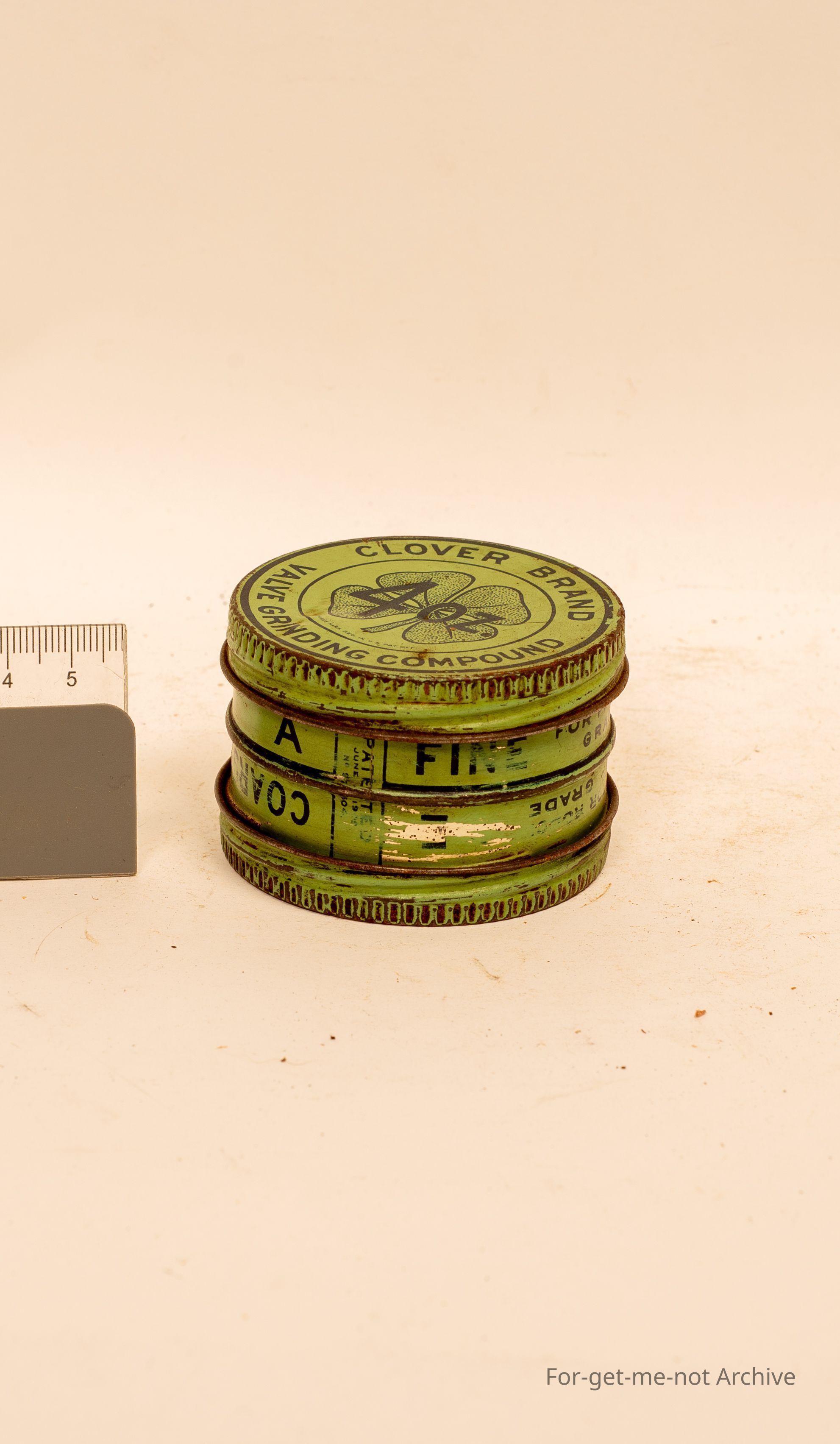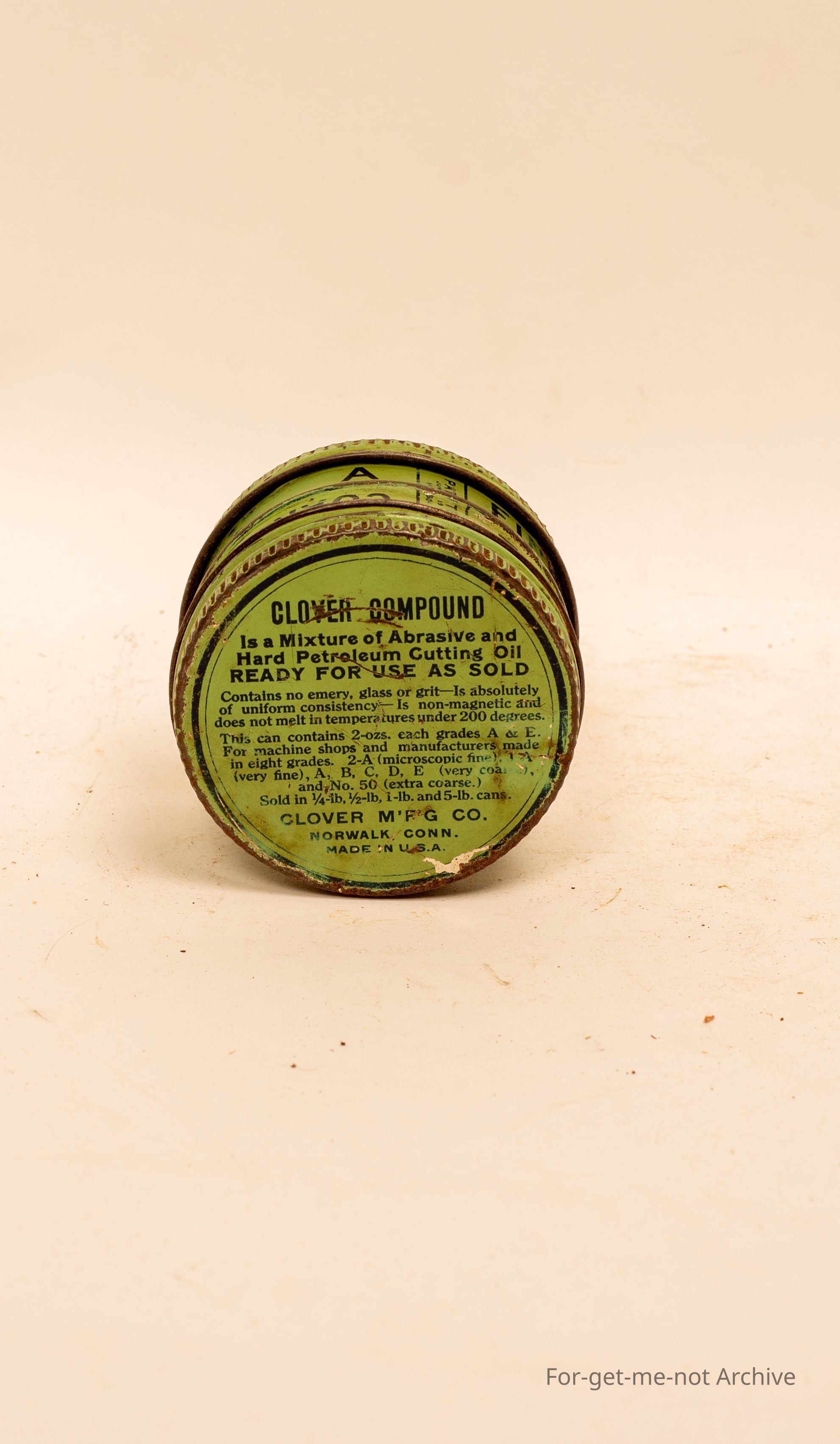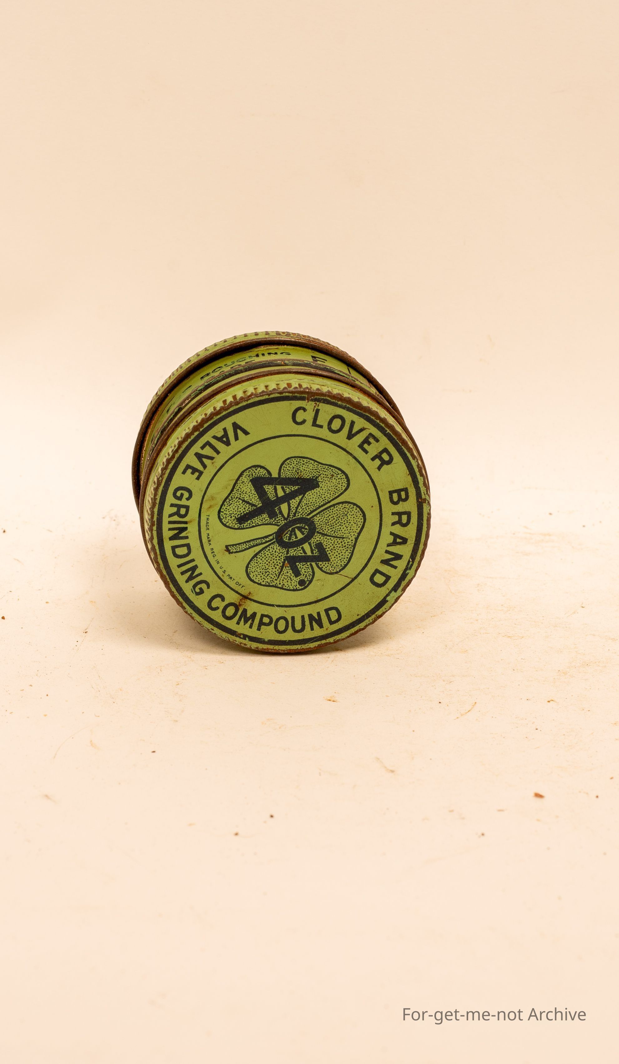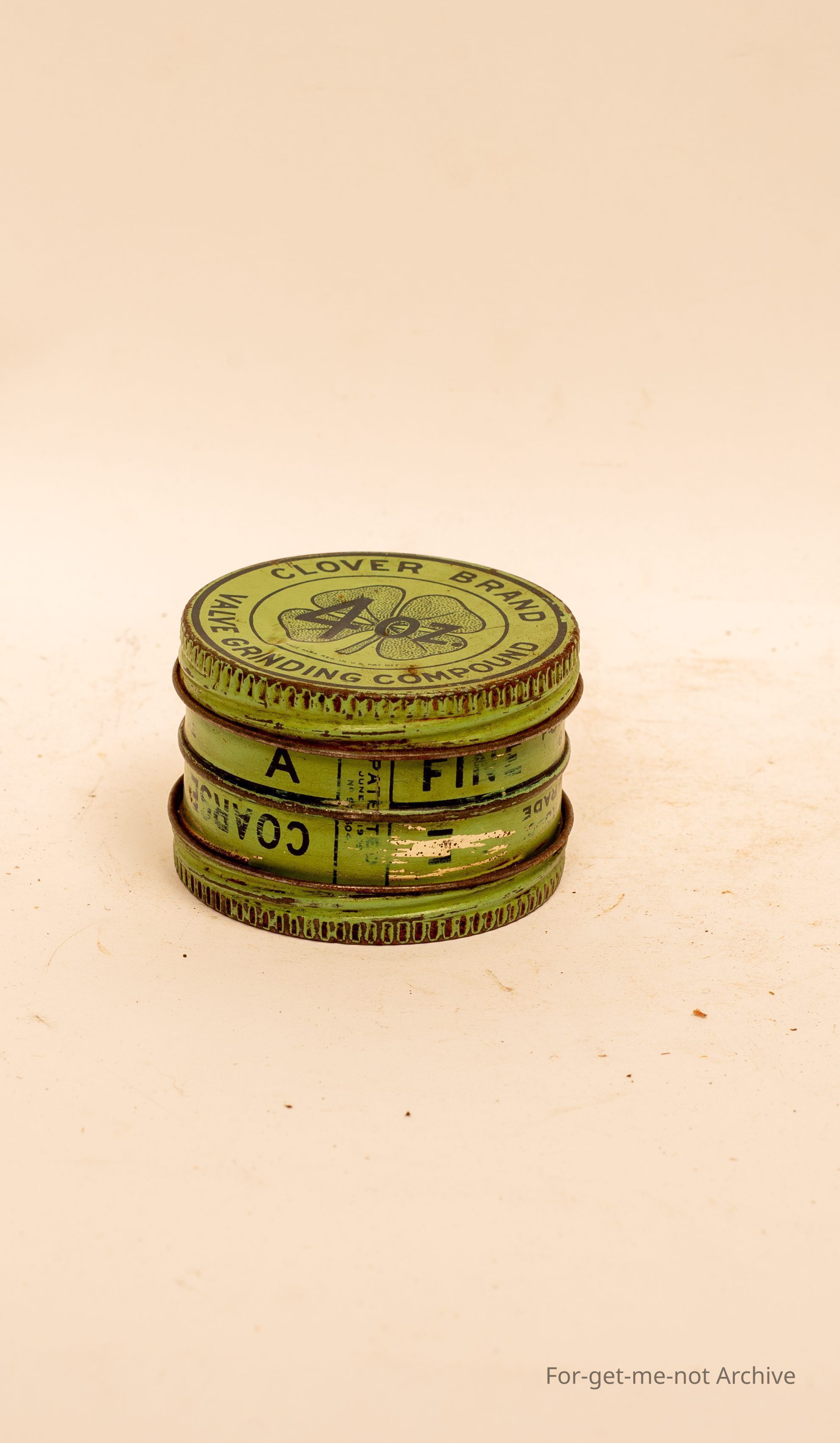 Small tin, Clover brand valve grinding compound, 4 ounces.