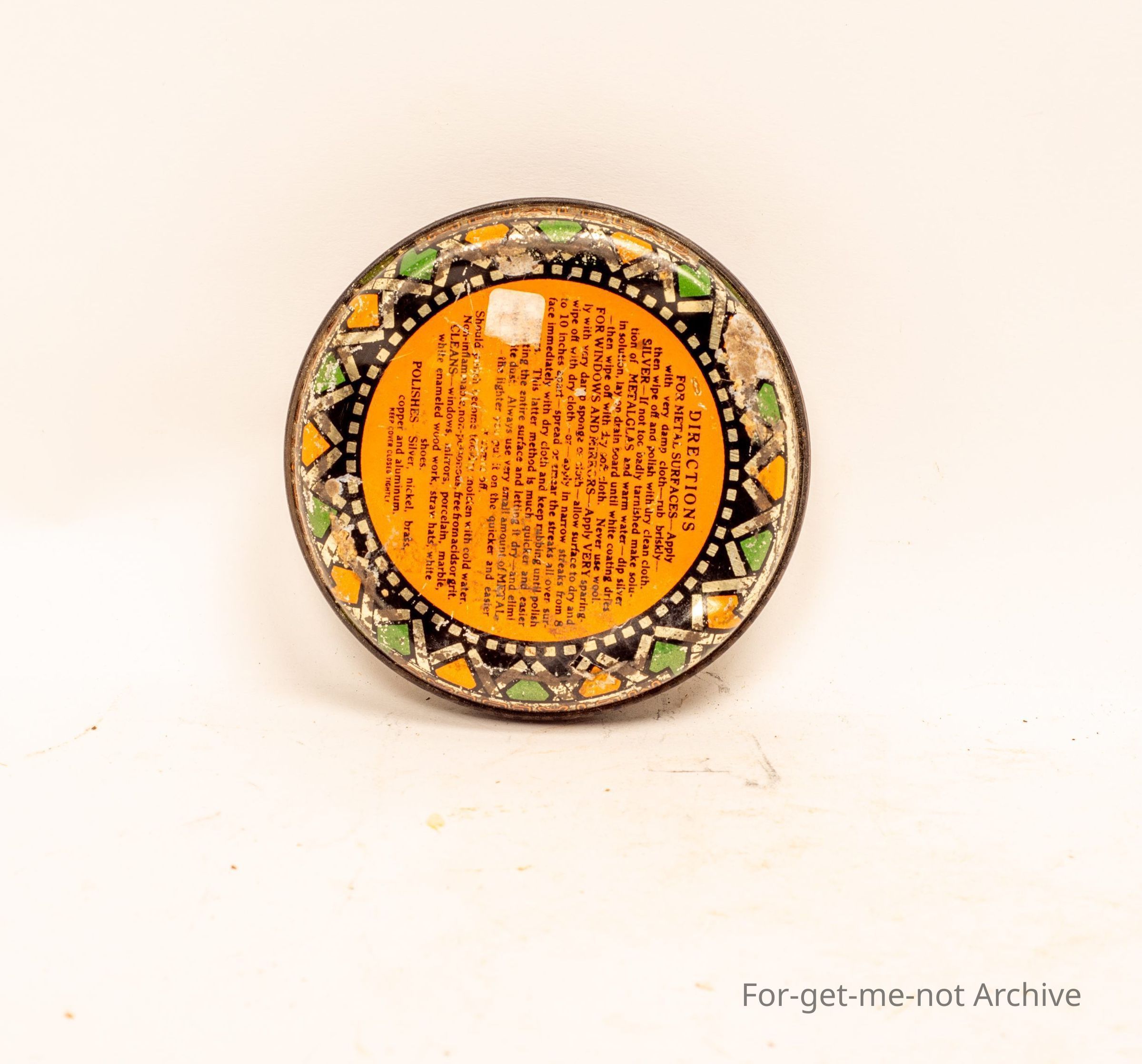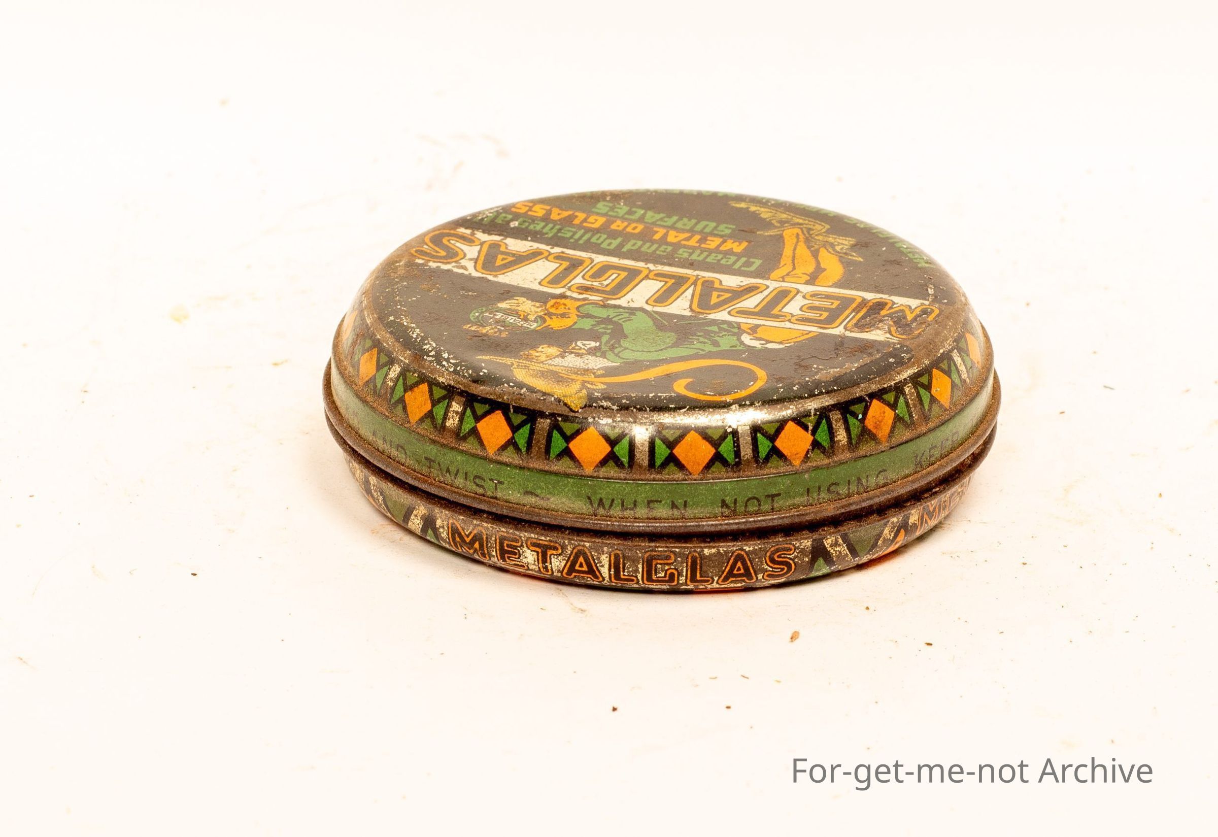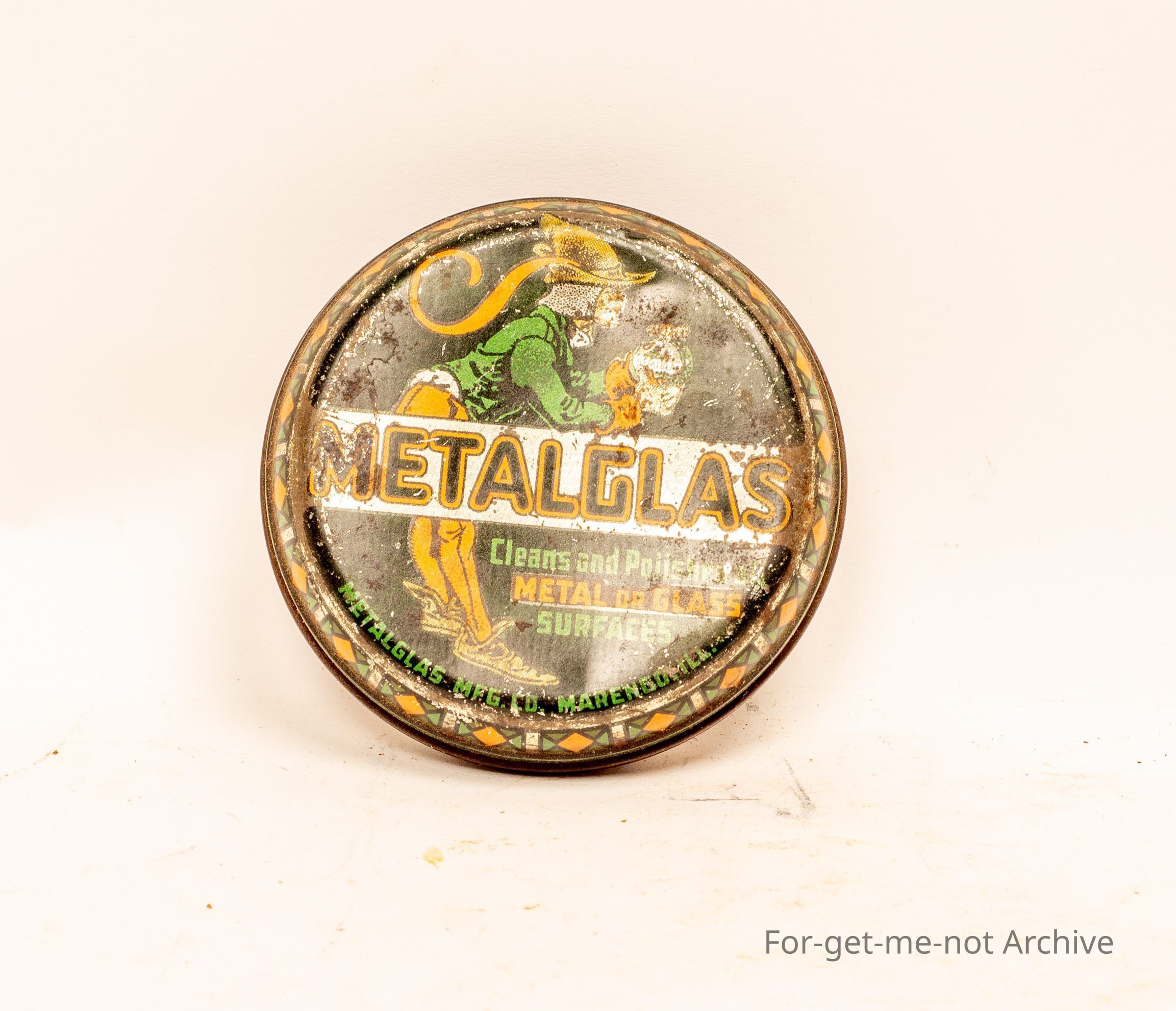 Tin of "Metalglas". Cleans and polishes metal or glass surfaces. Nice image down and condition a bit