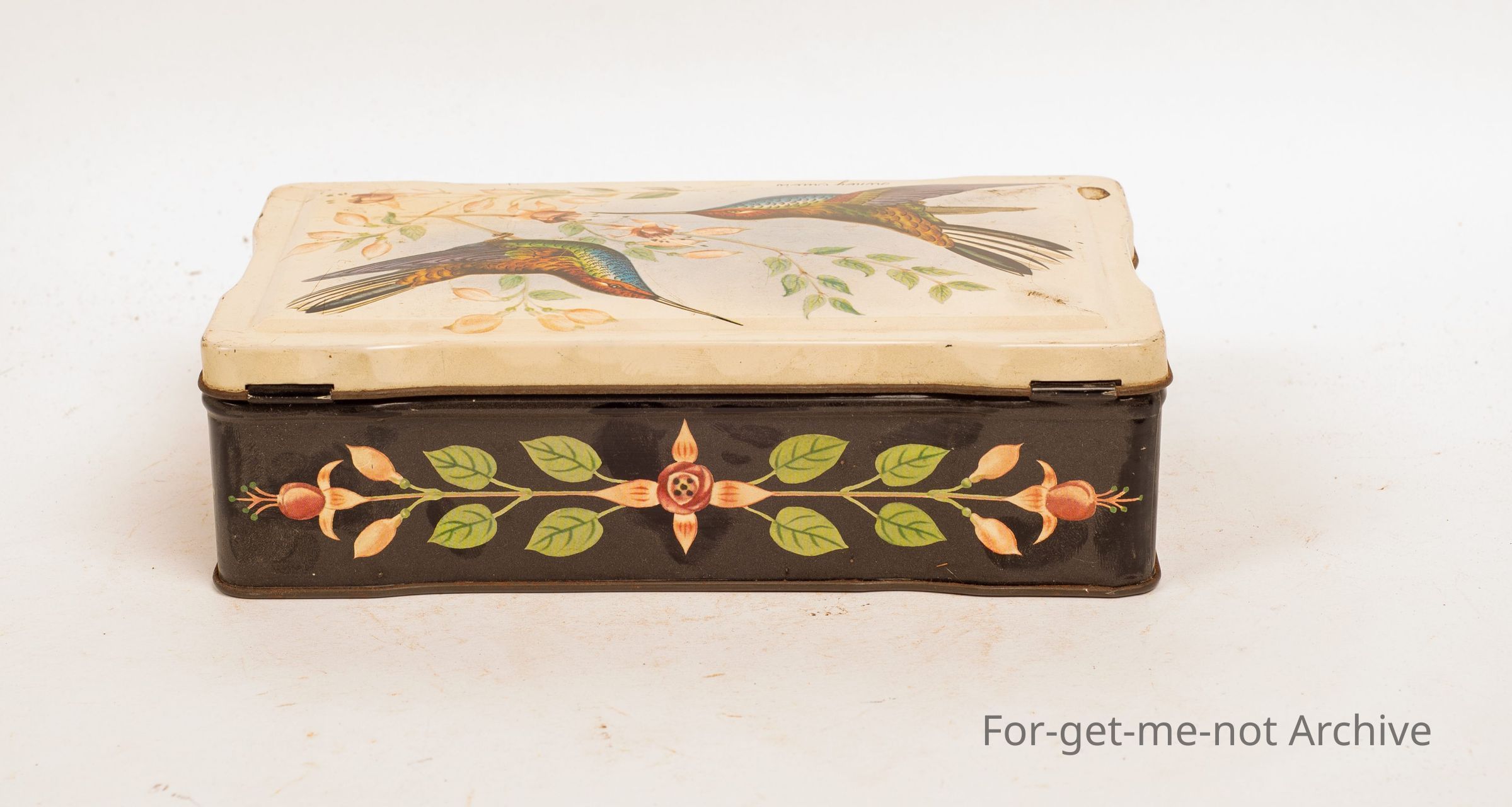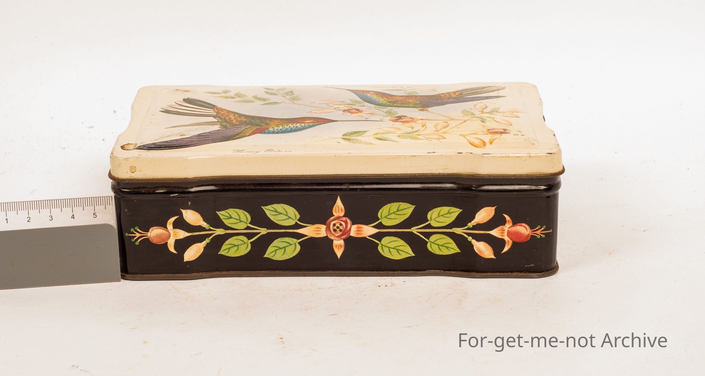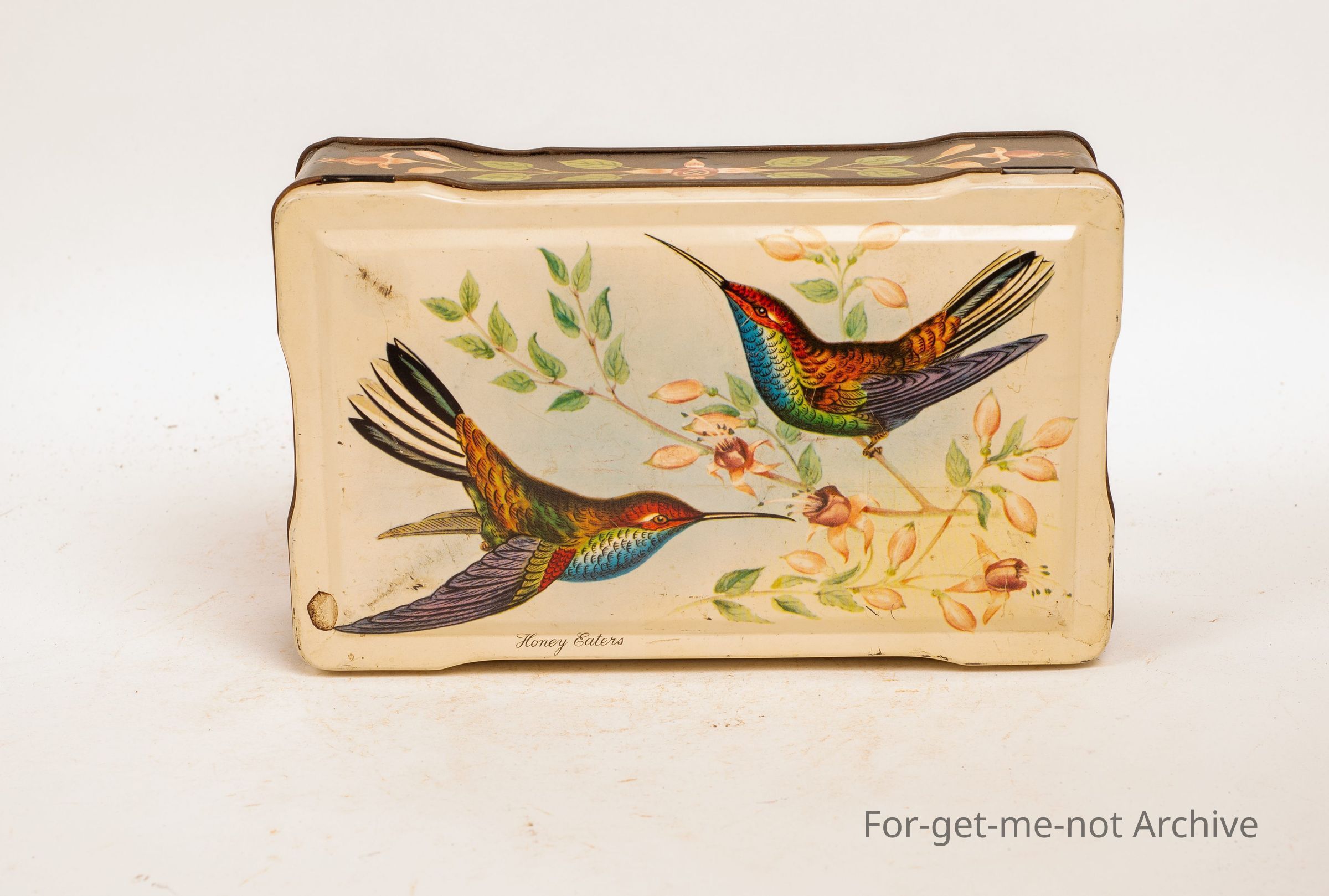 Allen sweet tin, 1 Lb capacity with Honey Eaters getting nectar from flowers on the front