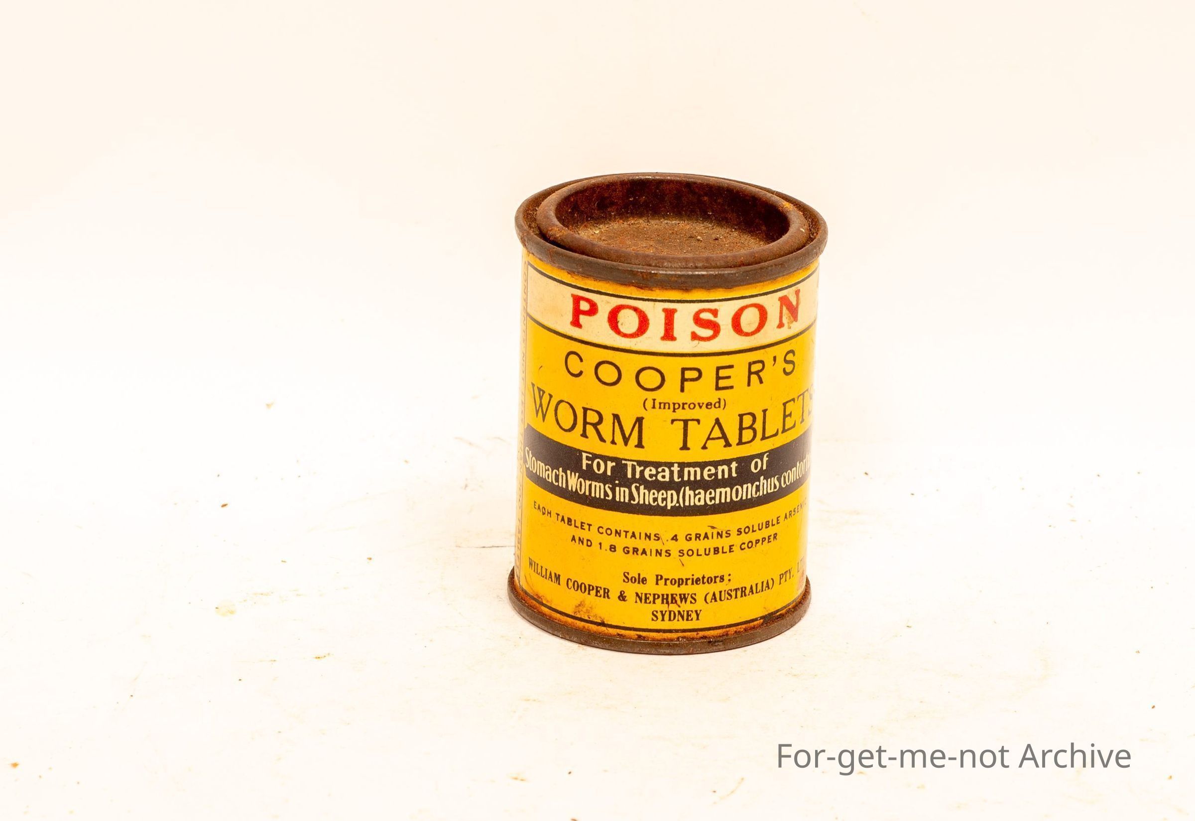 Small tin of Cooper's Worm Tablets. Very good condition for treatment of stomach worms in sheep and lambs. William Cooper and Nephew, Sydney.