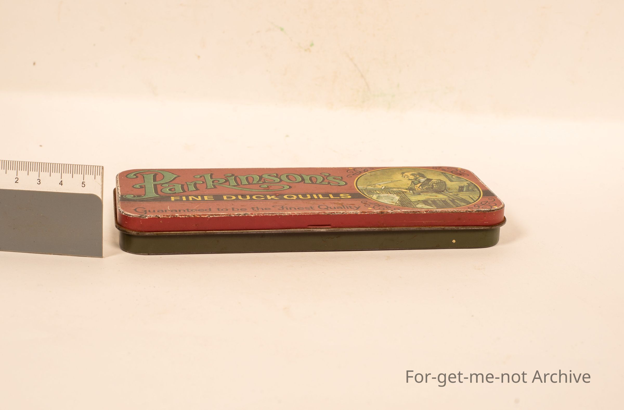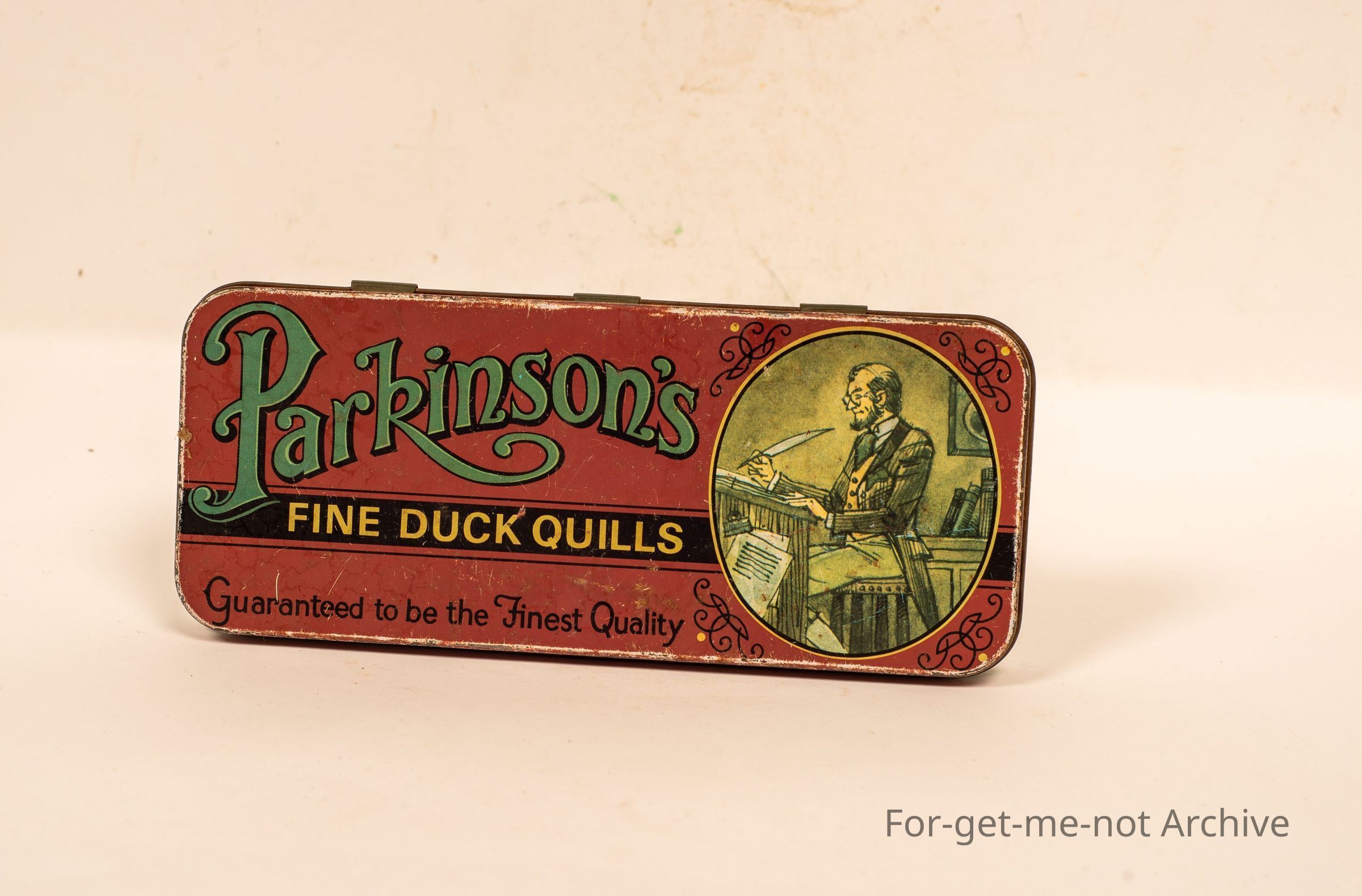 Tin Parkinson's Fine Duck Quills. Image of a bloke writing with a Quill. This tin is a reproduction.