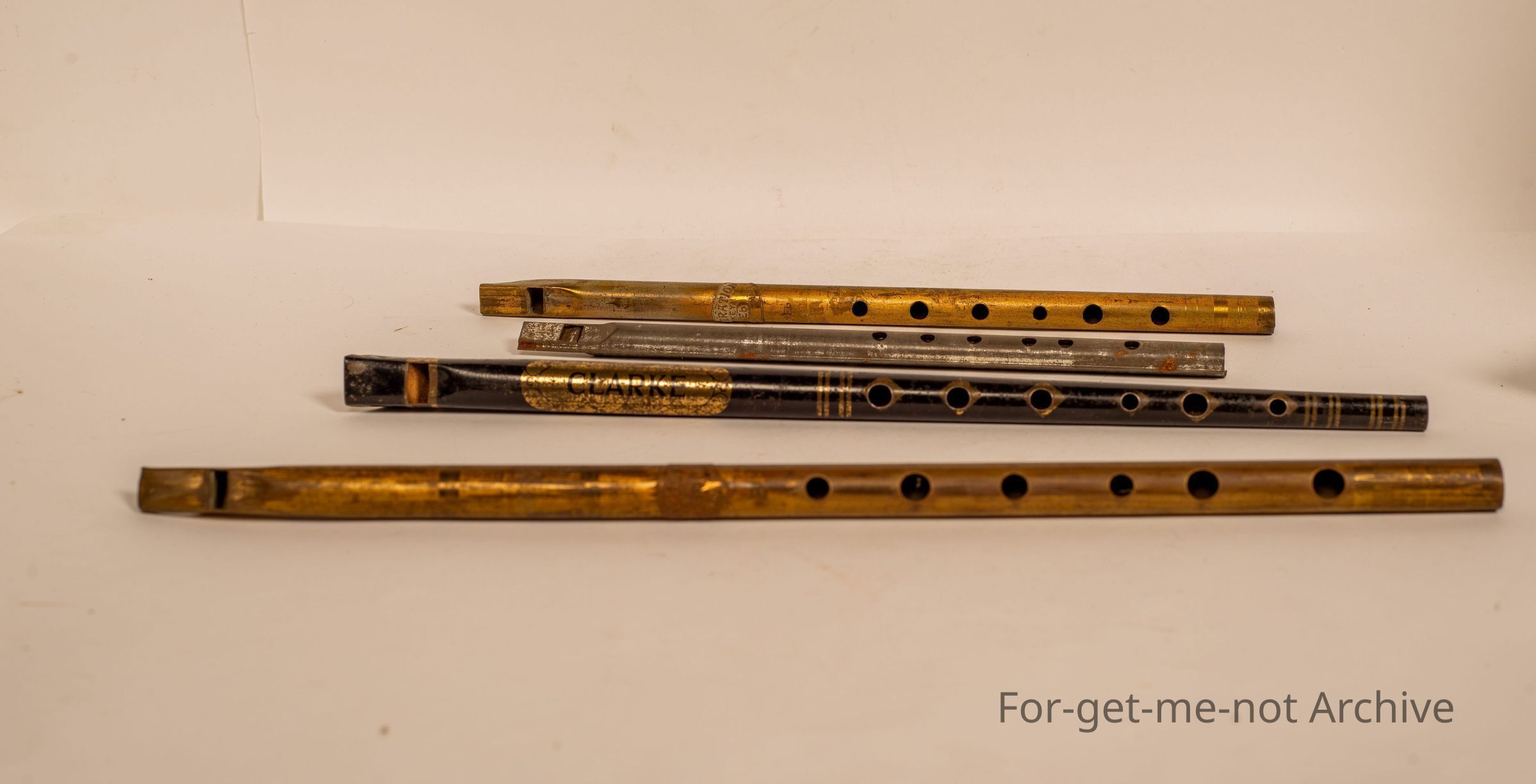 3 point 4. Flutes, 1 tin one for kid. The other 3, possibly brass, 1 o'clock. 3 of them are very good quality. 1 kid quality