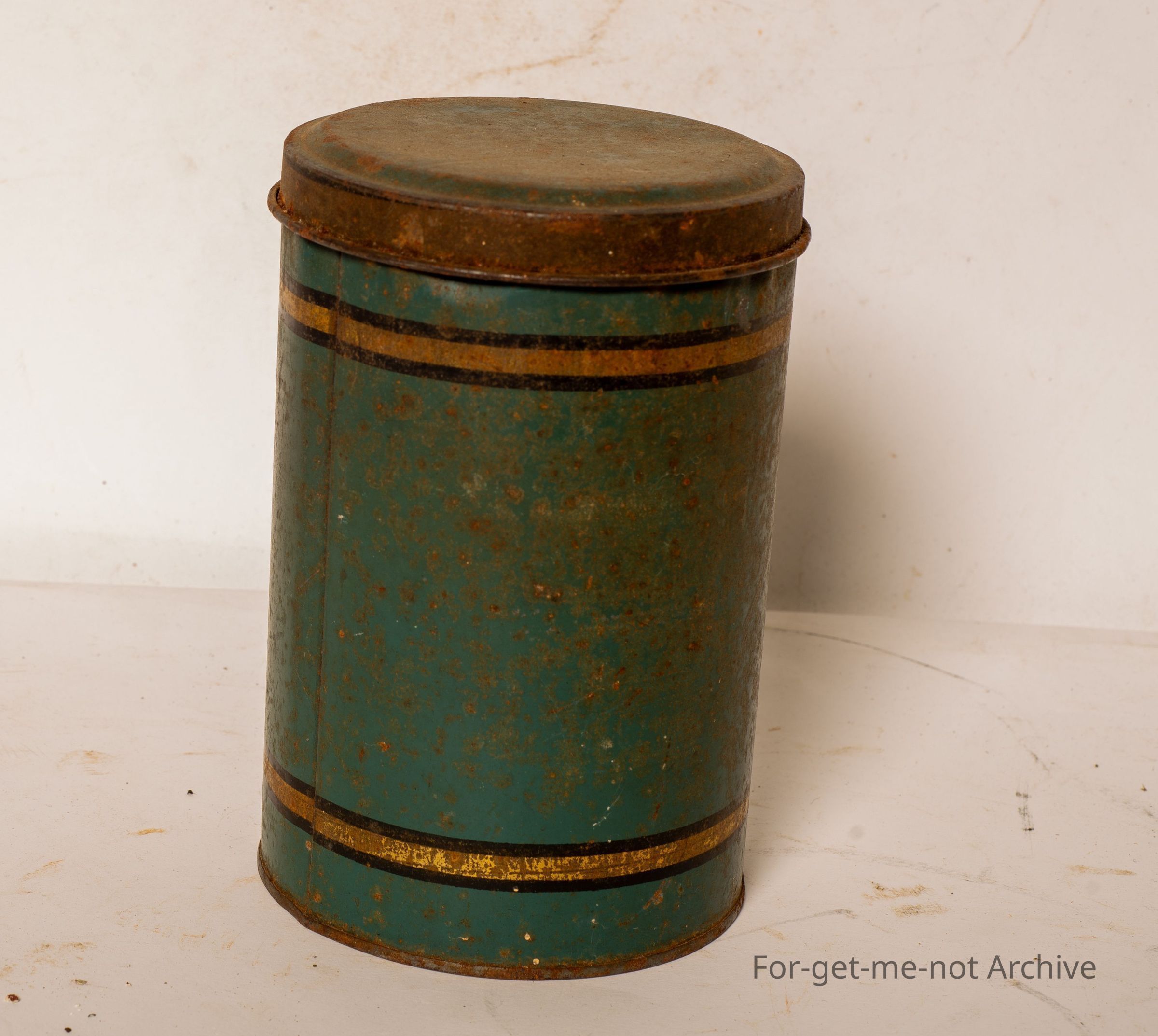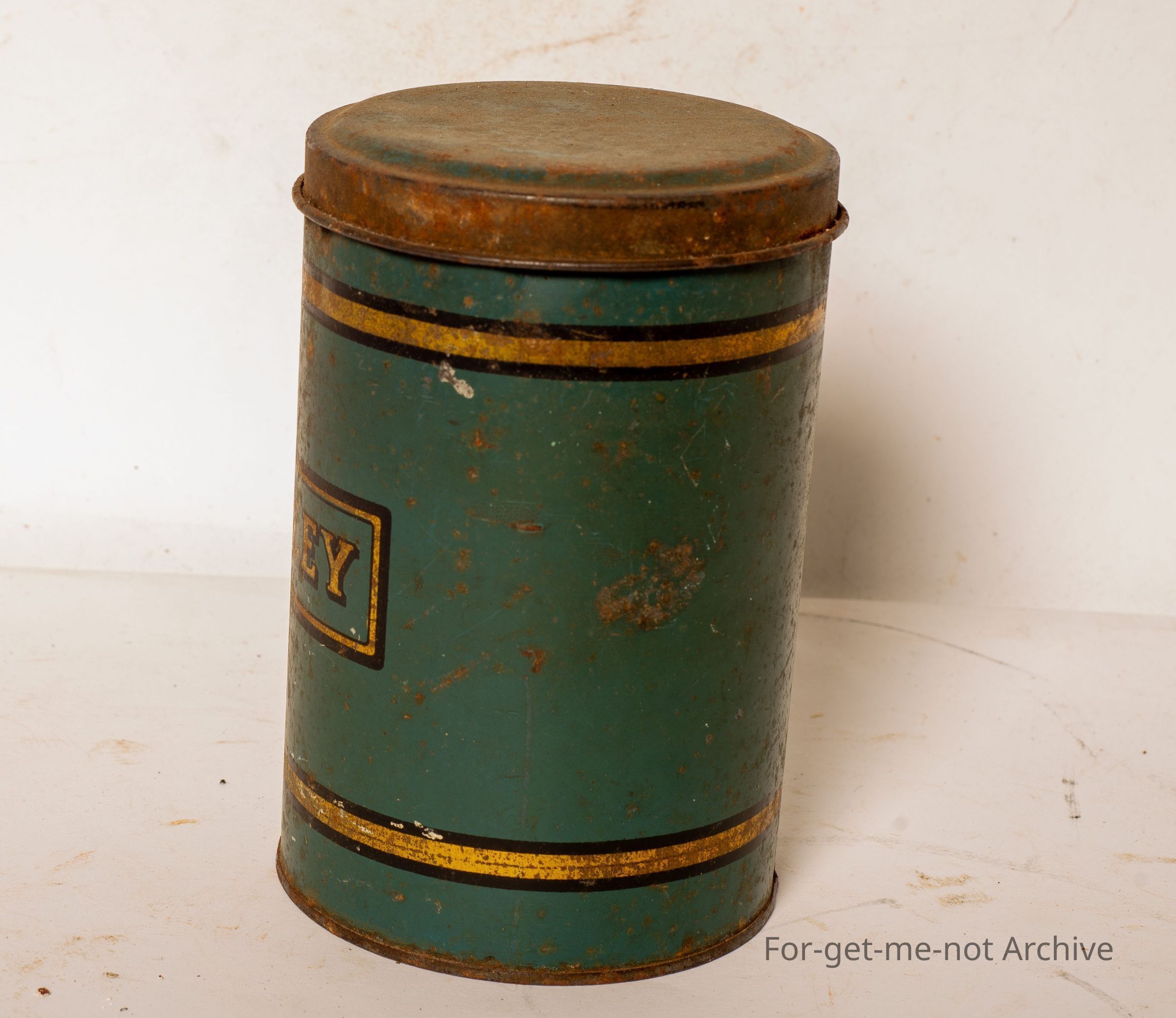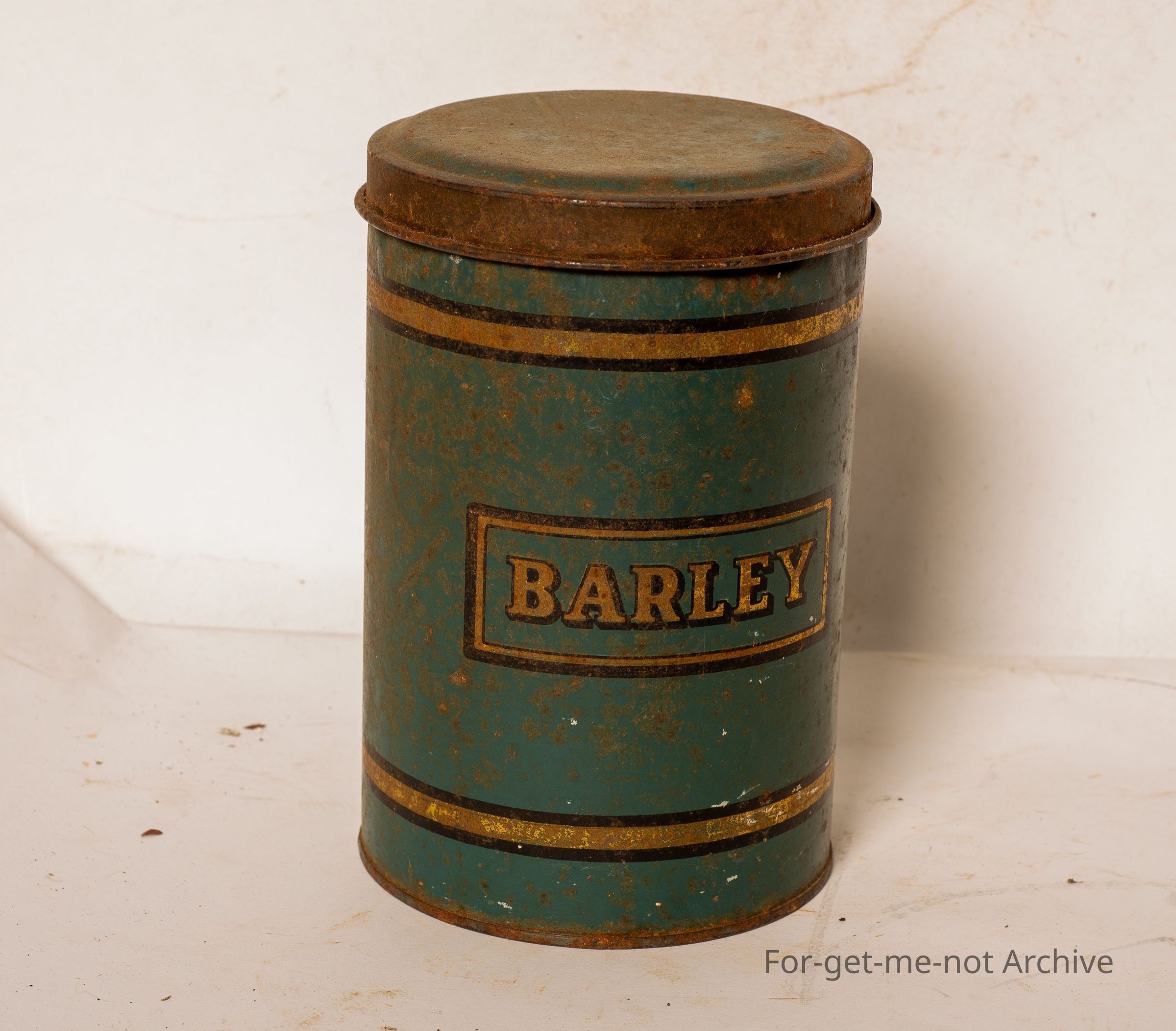 Tin storage can. This has barley in a transfer on the side. Not in very good condition. A pretty common storage thing in the kitchen.