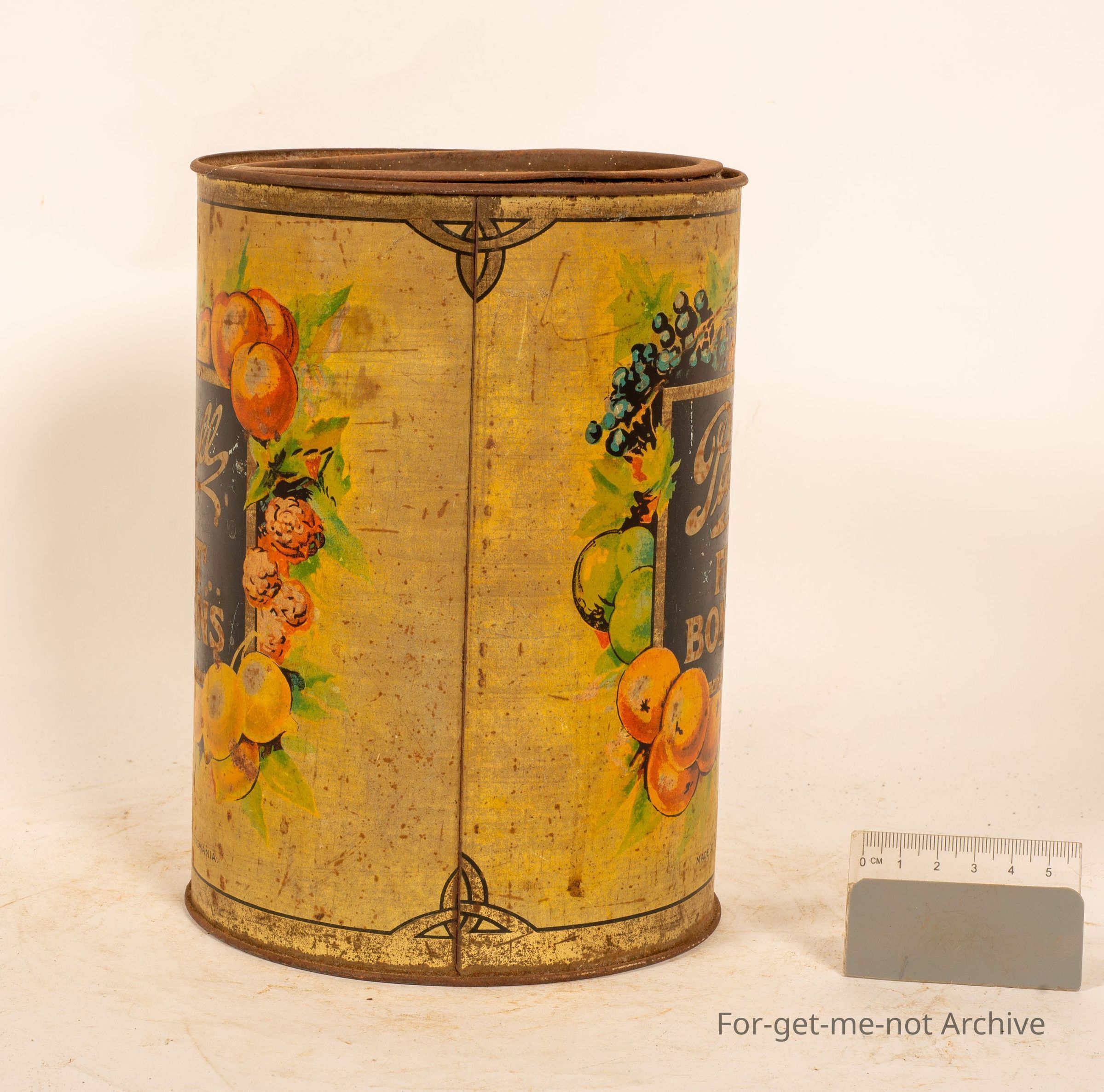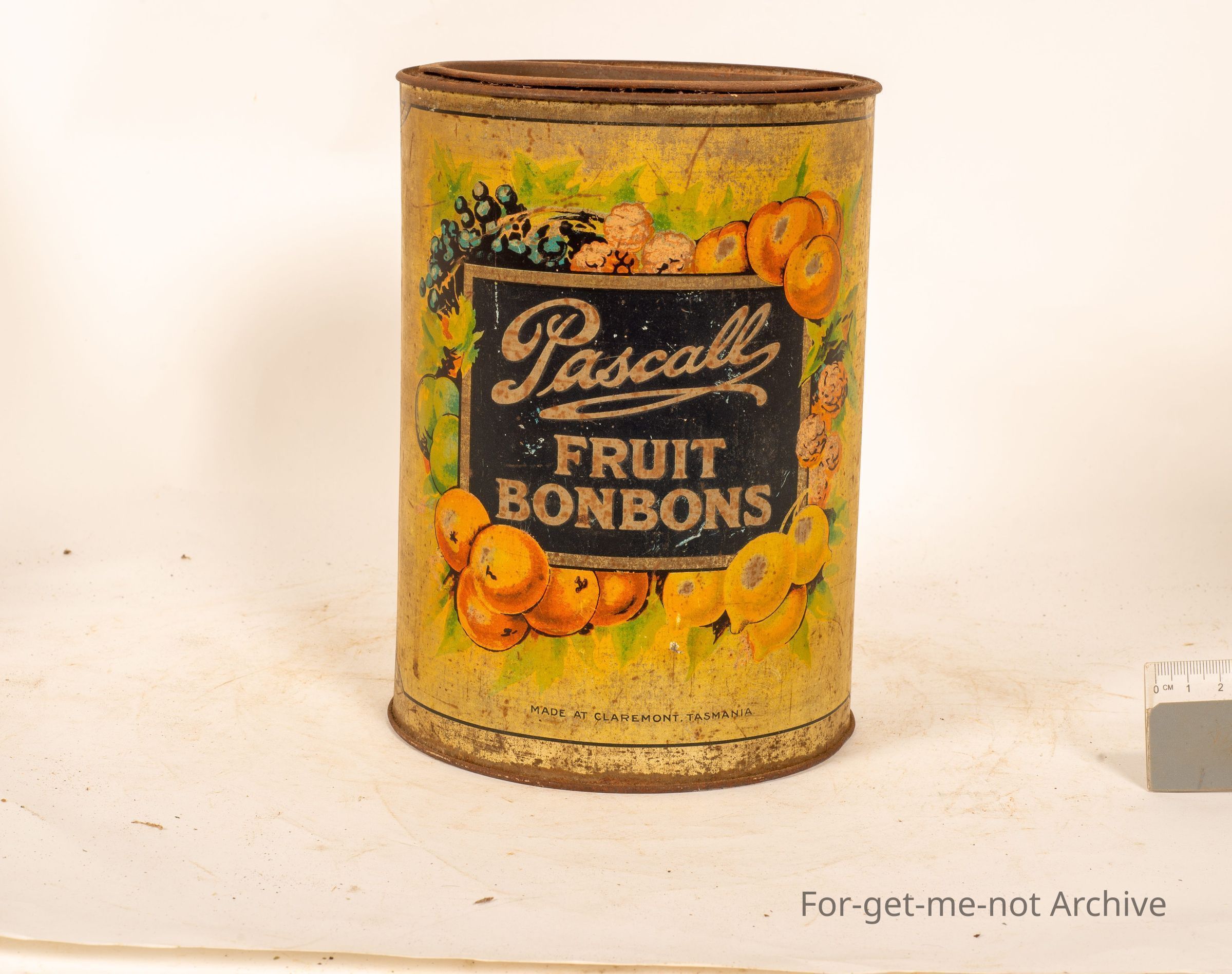 This is the smaller of the Pascal Fruit Bonbon Tins, made at Claremont, Tasmania. The usual beautiful graphics, but this one is in a bit of down condition. Still a lovely tin to display. Pascal stamped into the base of the tin and on the lid,Collection