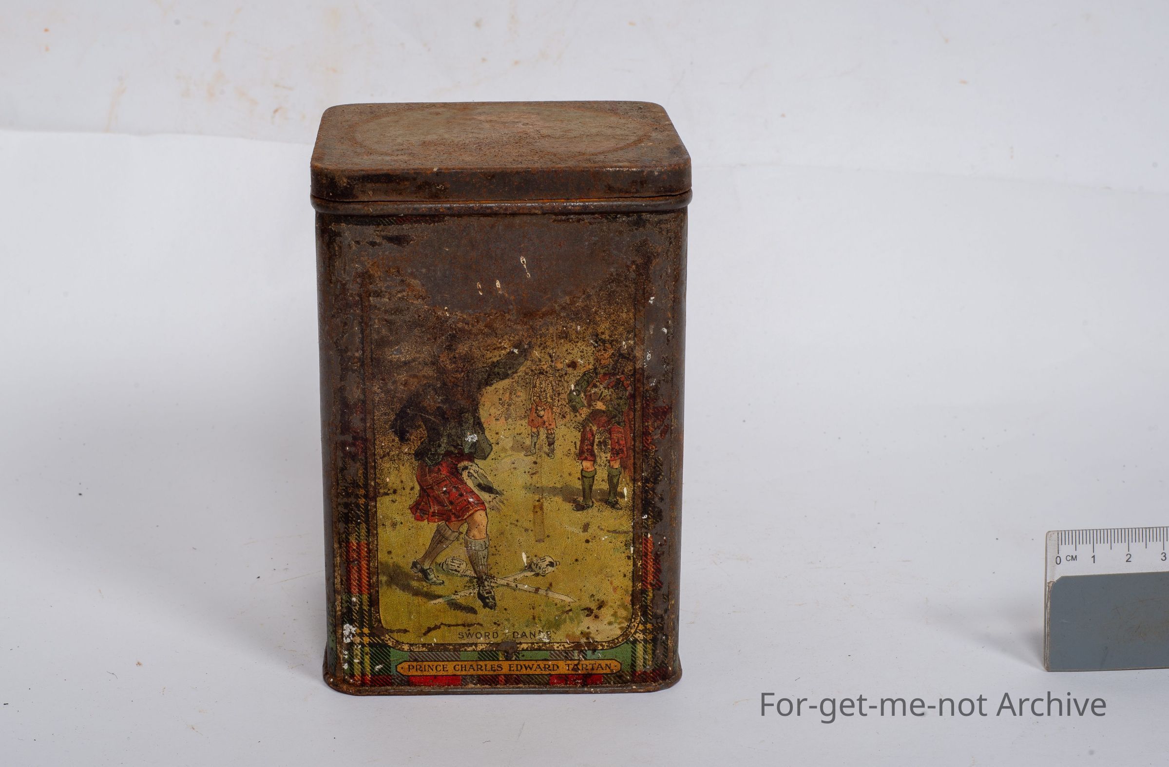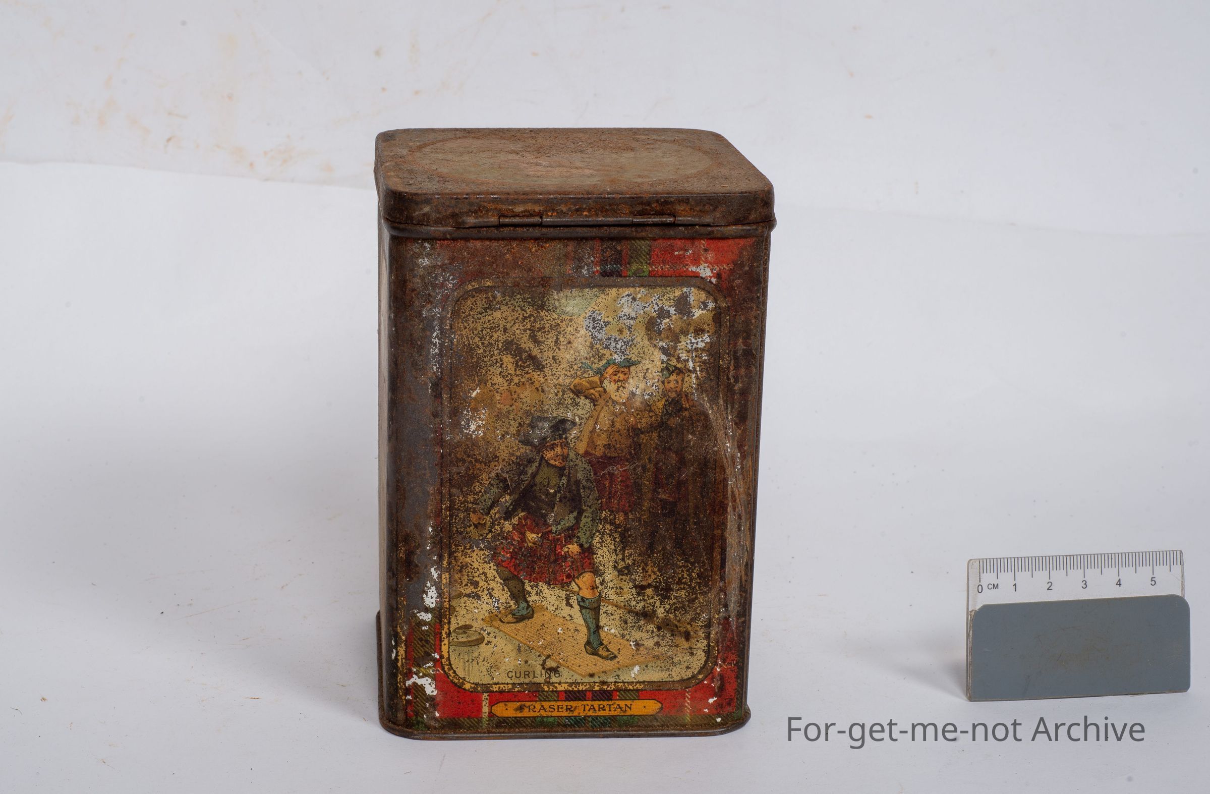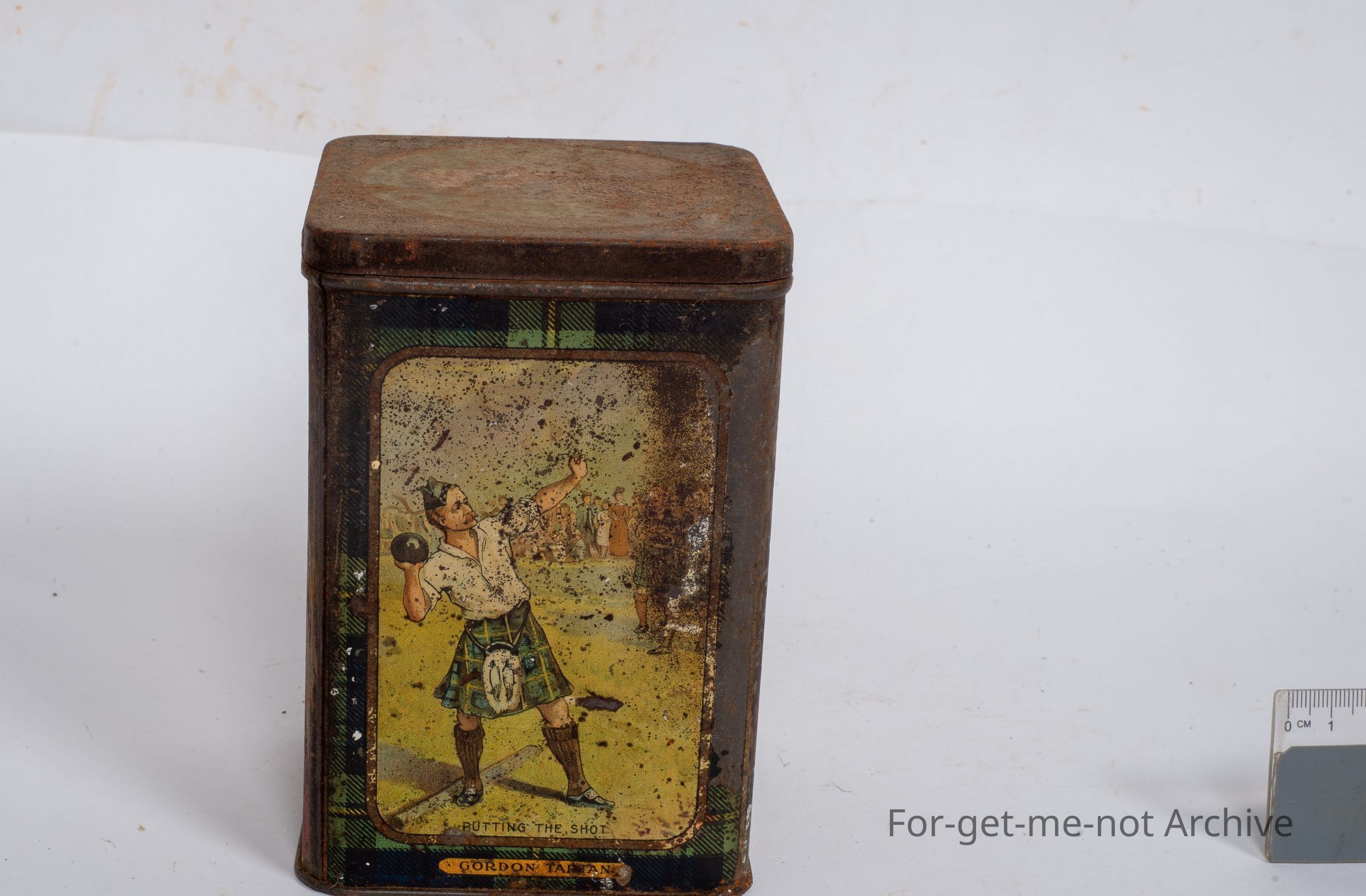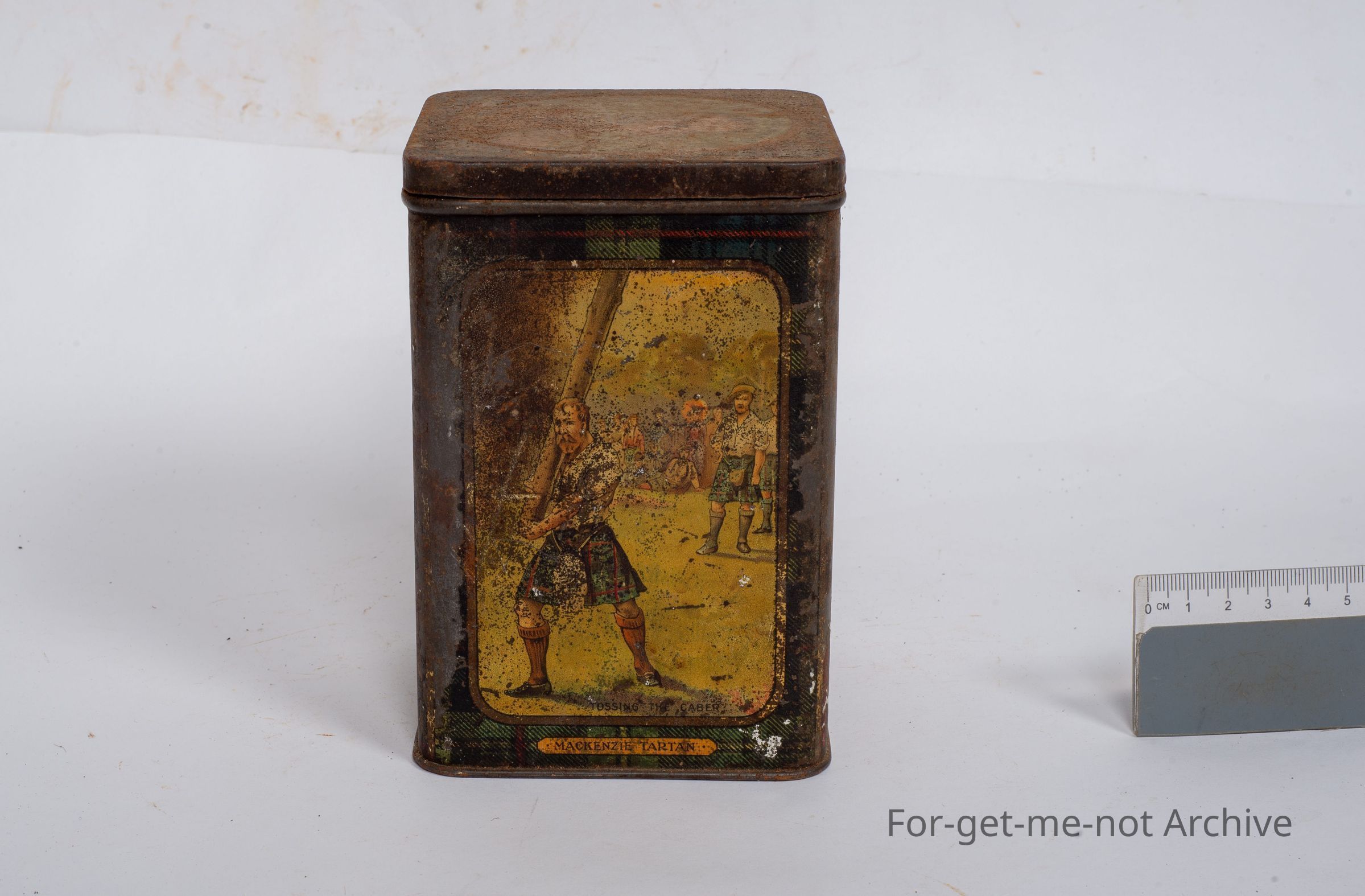This is a very warm, tin. Various, sports activities by Scotch people of sabre throwing, etcetera, shot putting. It could well have been a biscuit tin, but not much information.