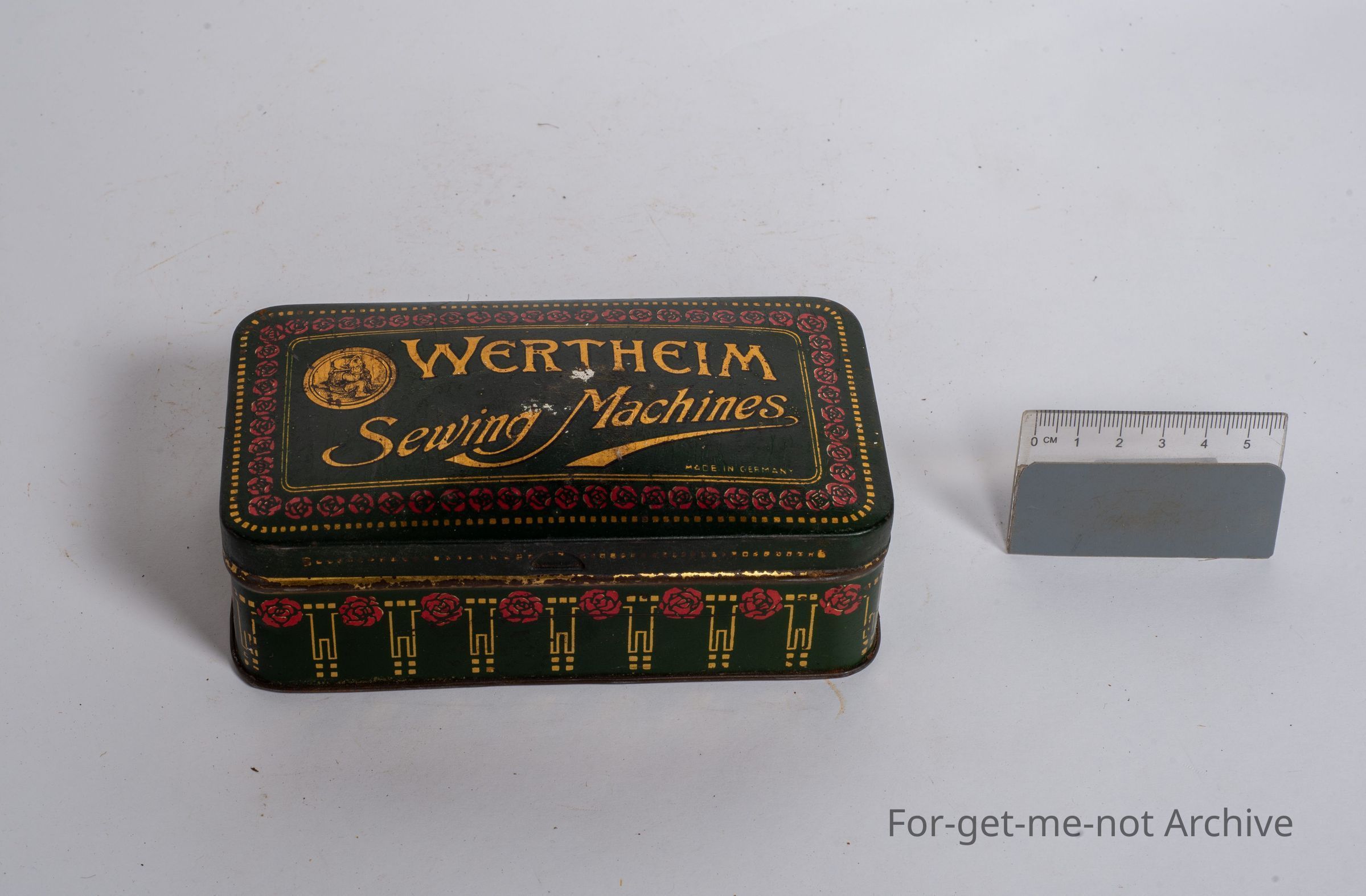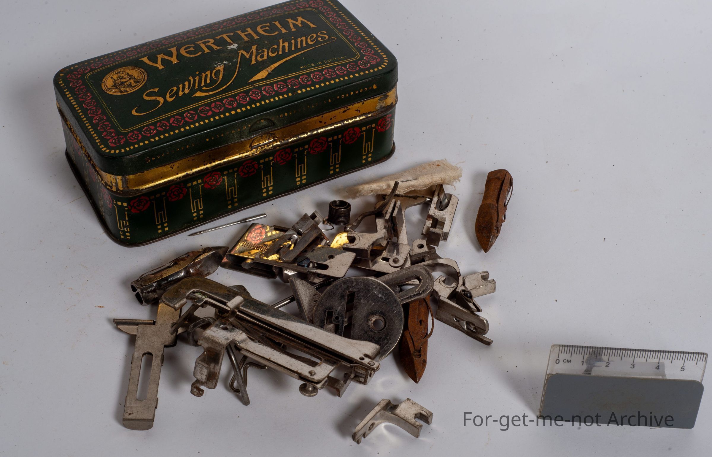 This tin is from Wertheim Sewing Machines with all the bits and bobs necessary to, activate the machine. This tin's in quite good order, with all the contents