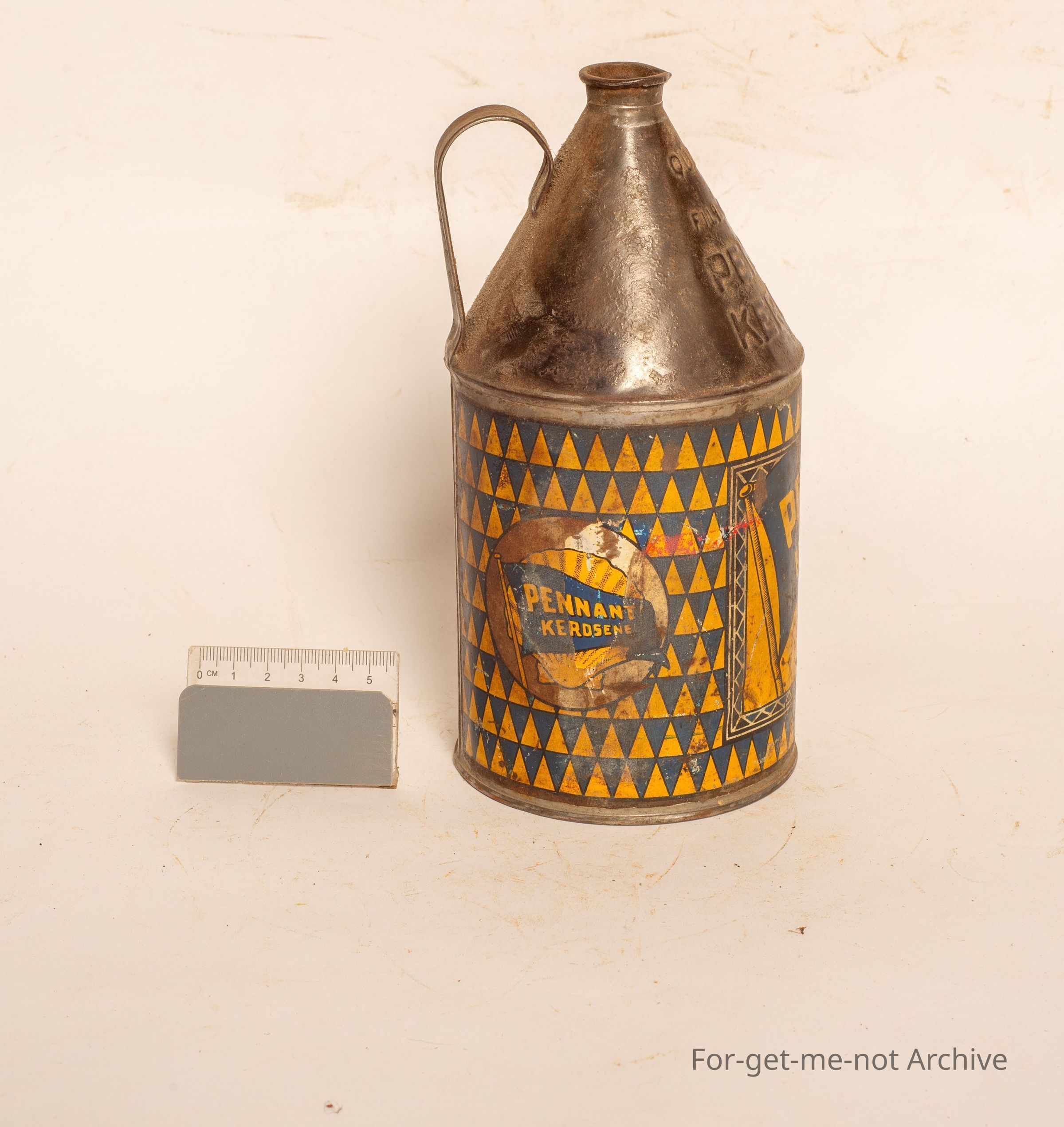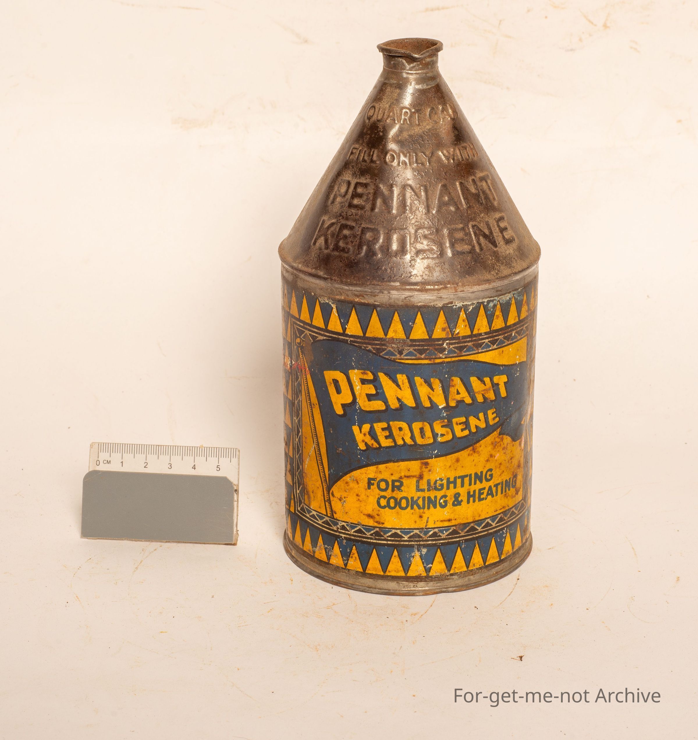 This is a beautiful early tin with a tapered neck, embossed with quart can Pennant Kerosene for lighting and cooking. Has the Pennant kerosene flag. This would be a very early tin. In pretty fair condition. Probably very collectible.Collection