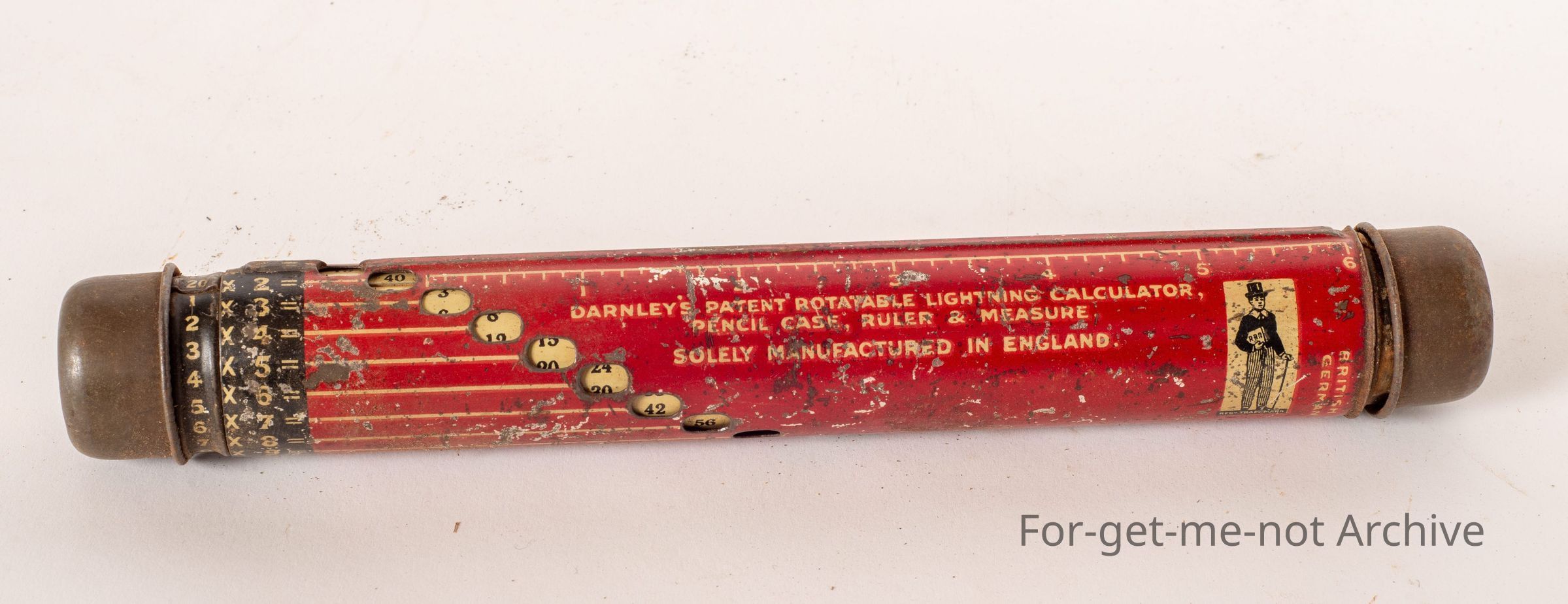 This is a tin, which is a calculator, pencil case ruler and measure, solely manufactured in England. Quite an amazing little piece. British Patent, still in working orders.