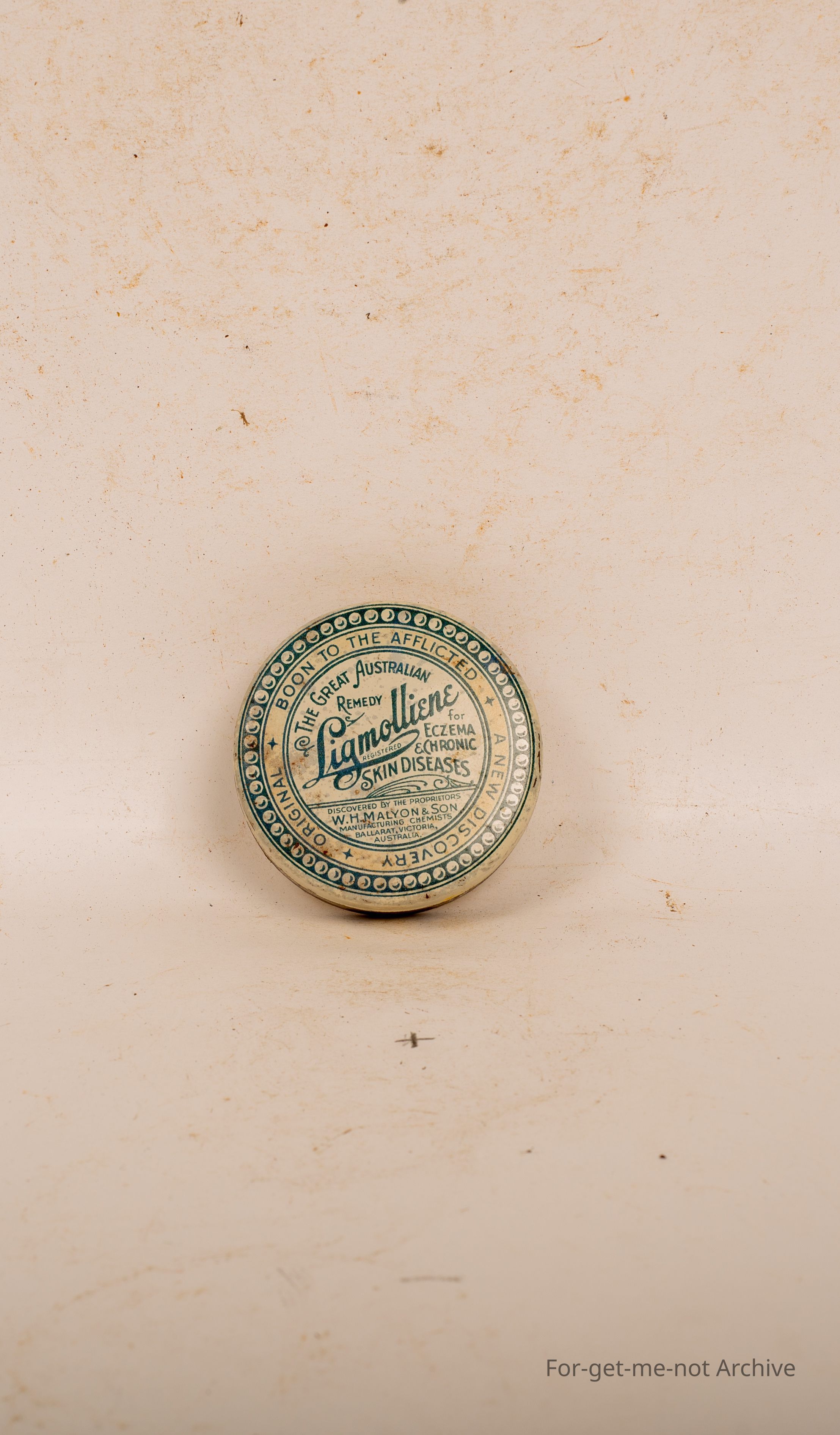 Tin of Ligmolliene, for skin diseases, it's a dressing, made in Ballarat. Quite a good tin W H Malyon and Son , manufacturing chemists, Ballarat..