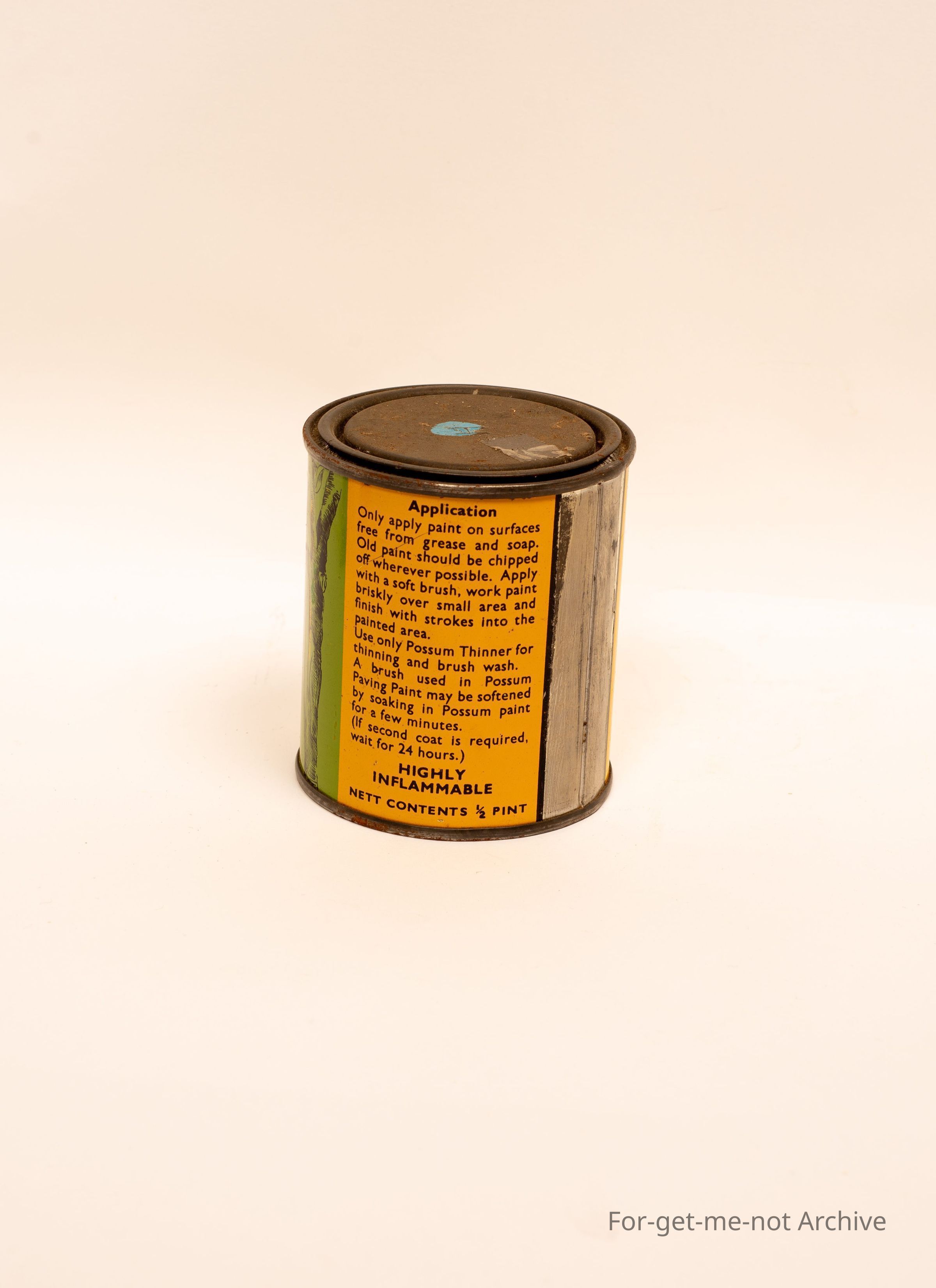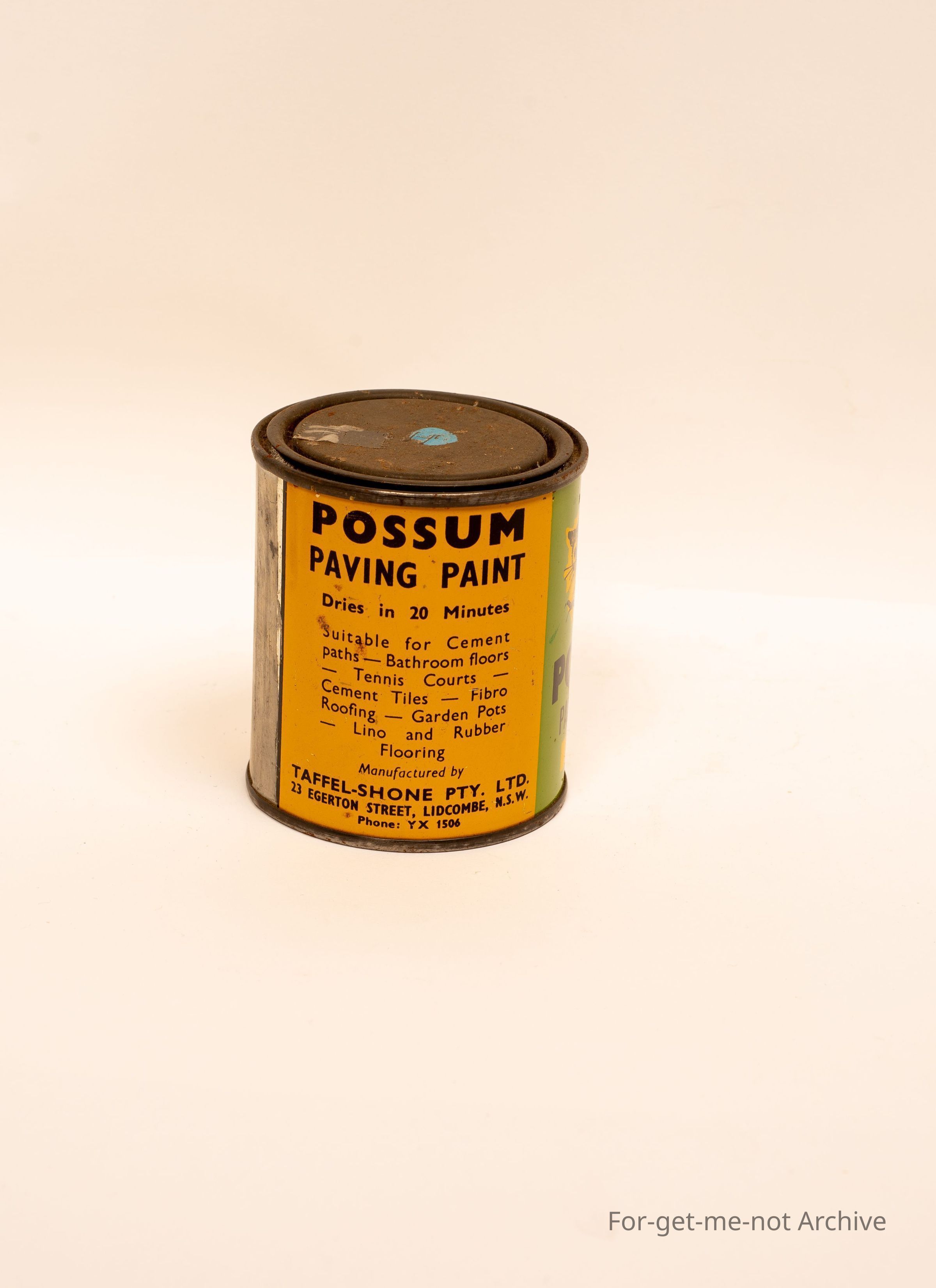 A full can, a tin of possum paving paint blue colour with image of possum in a gum tree.