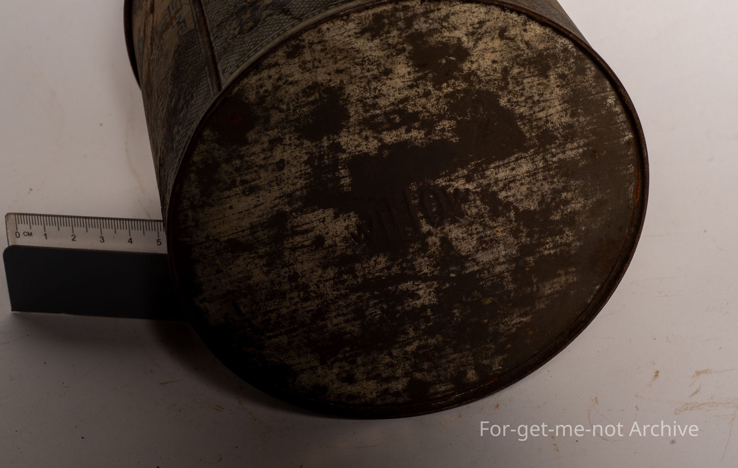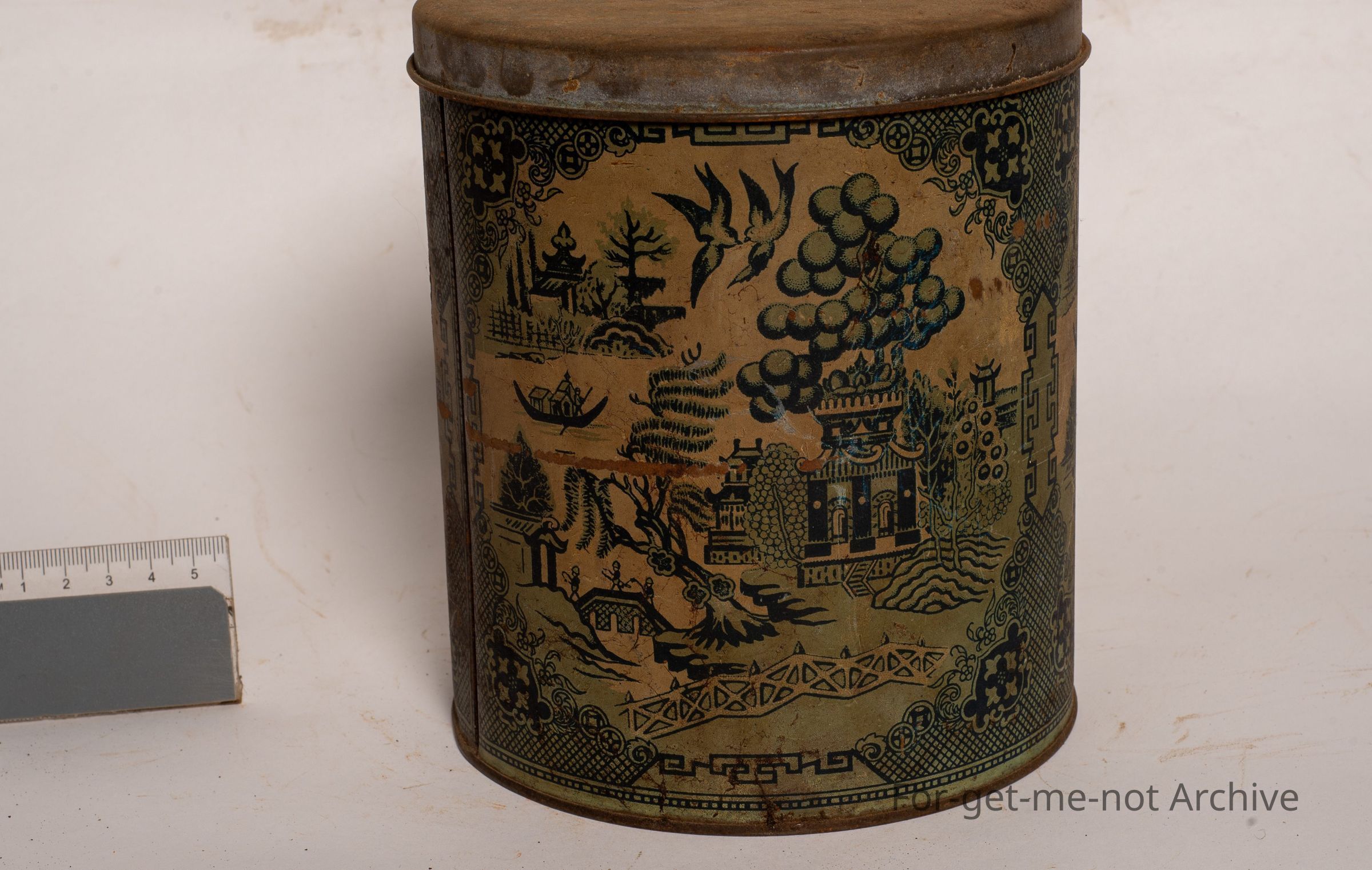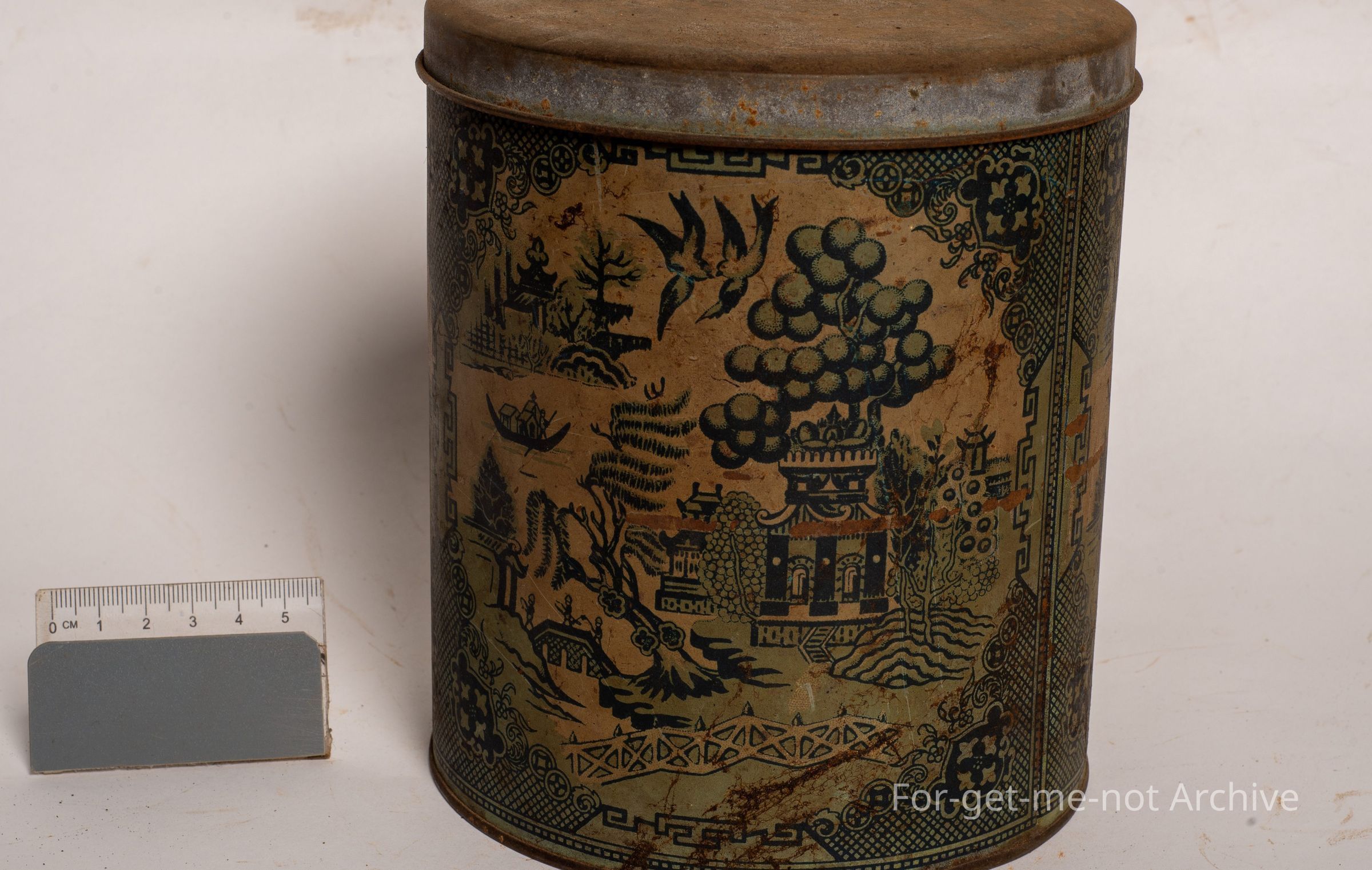 This is a canister style tin, sugar on the front with Willow pattern design on the lid and right around the circumference of the tin. Reasonable condition.