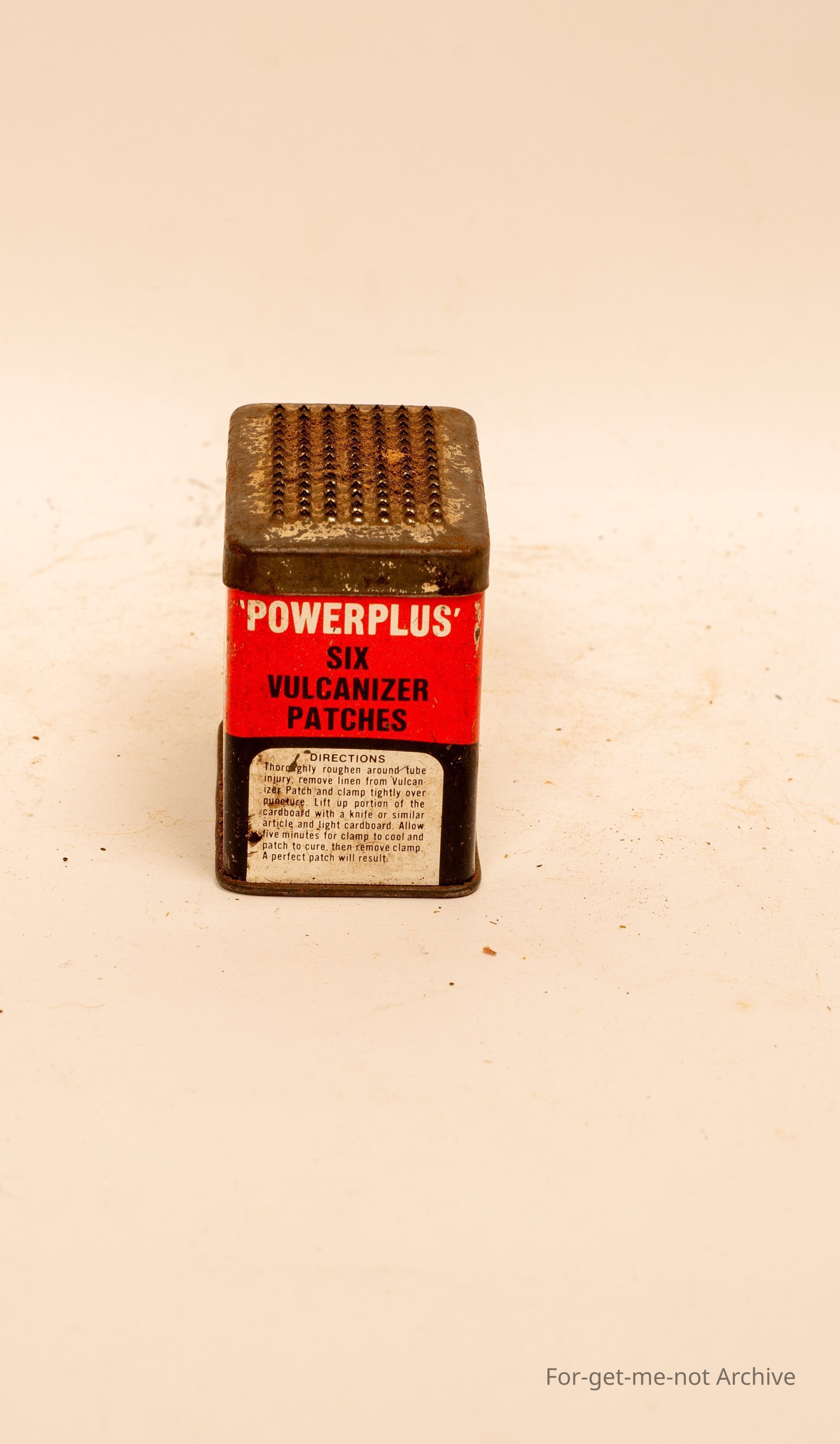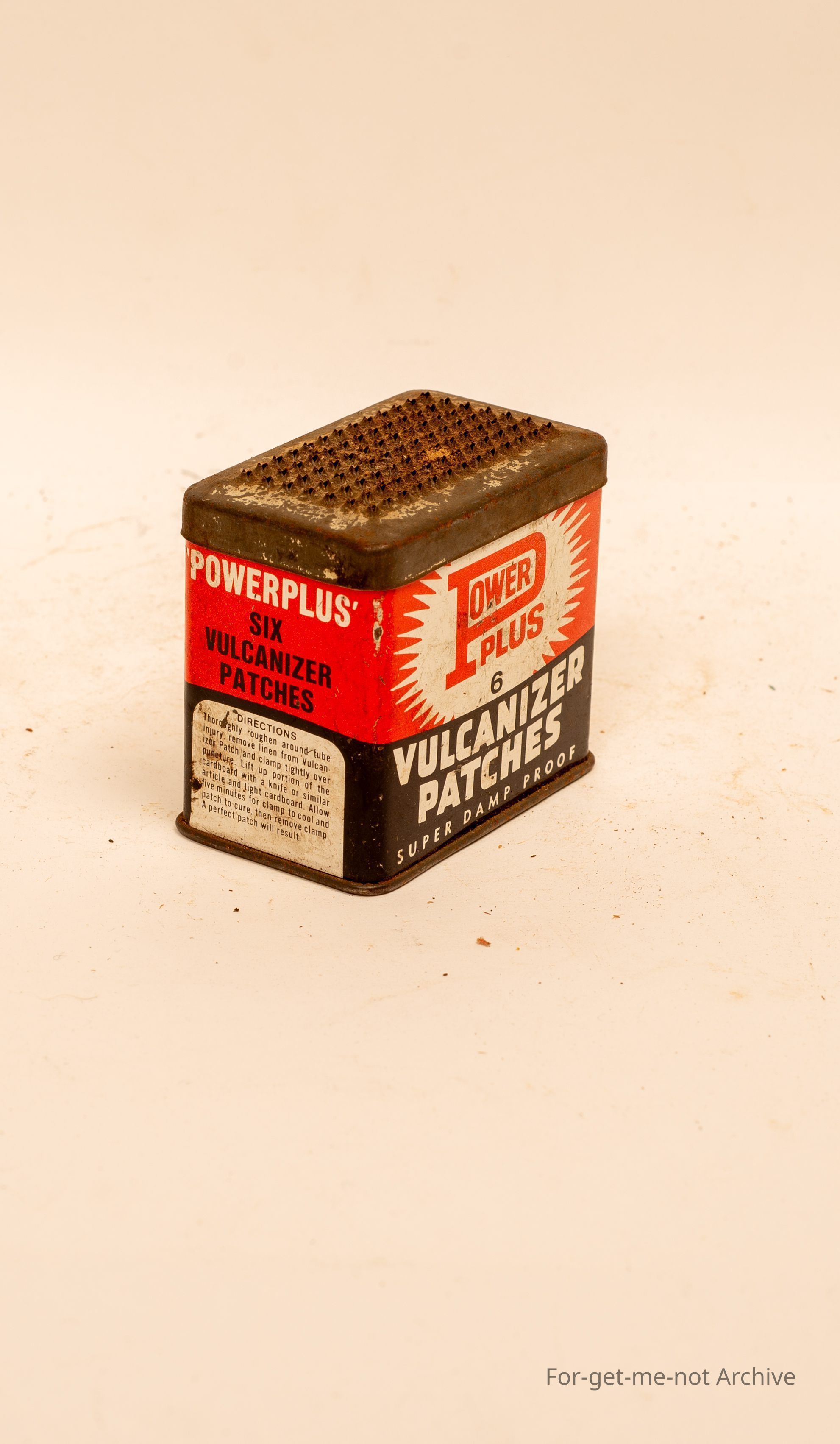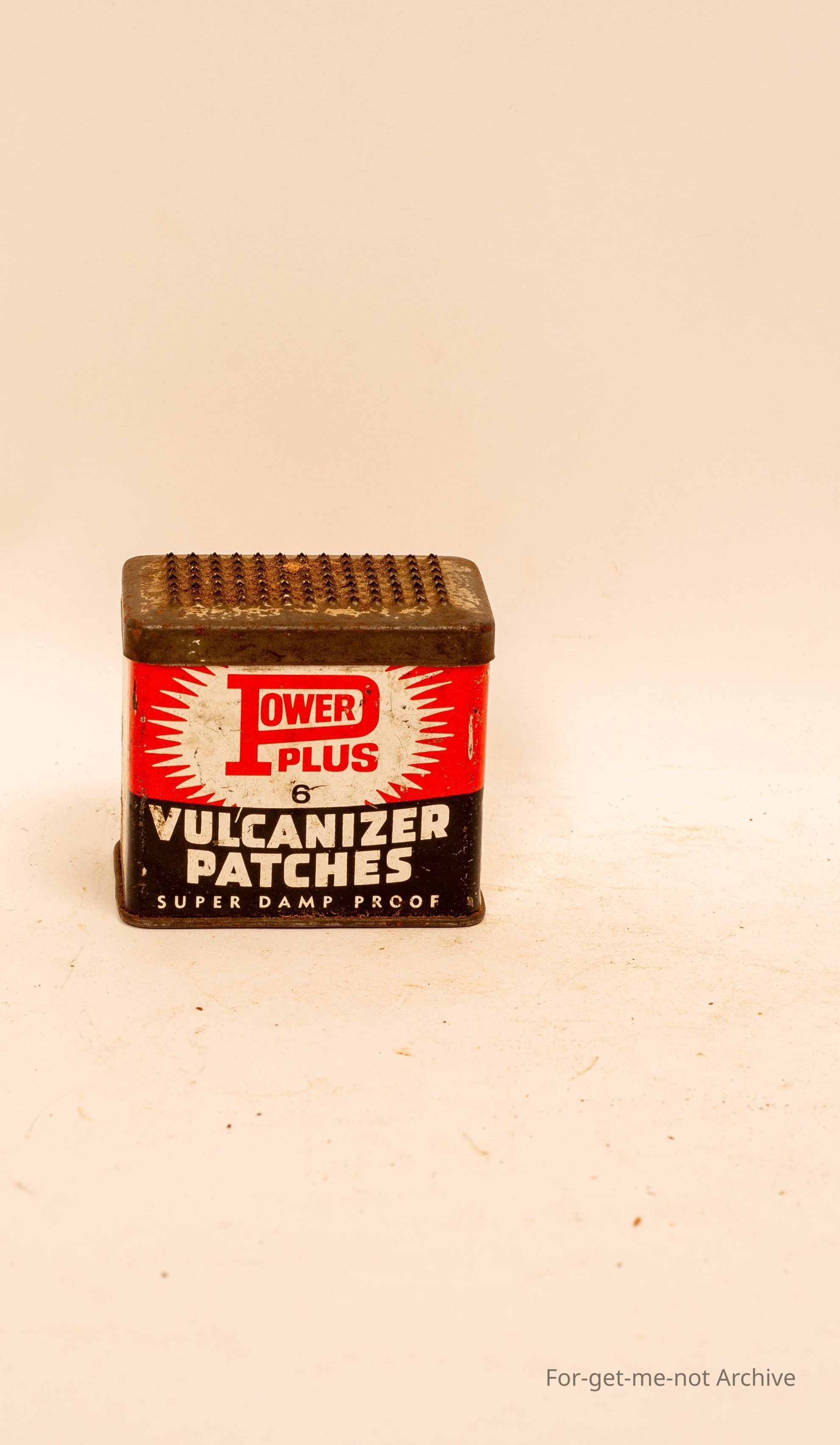 Small tin, Power plus vulcanised patches, super damp proof, made in New South Wales, Australia.