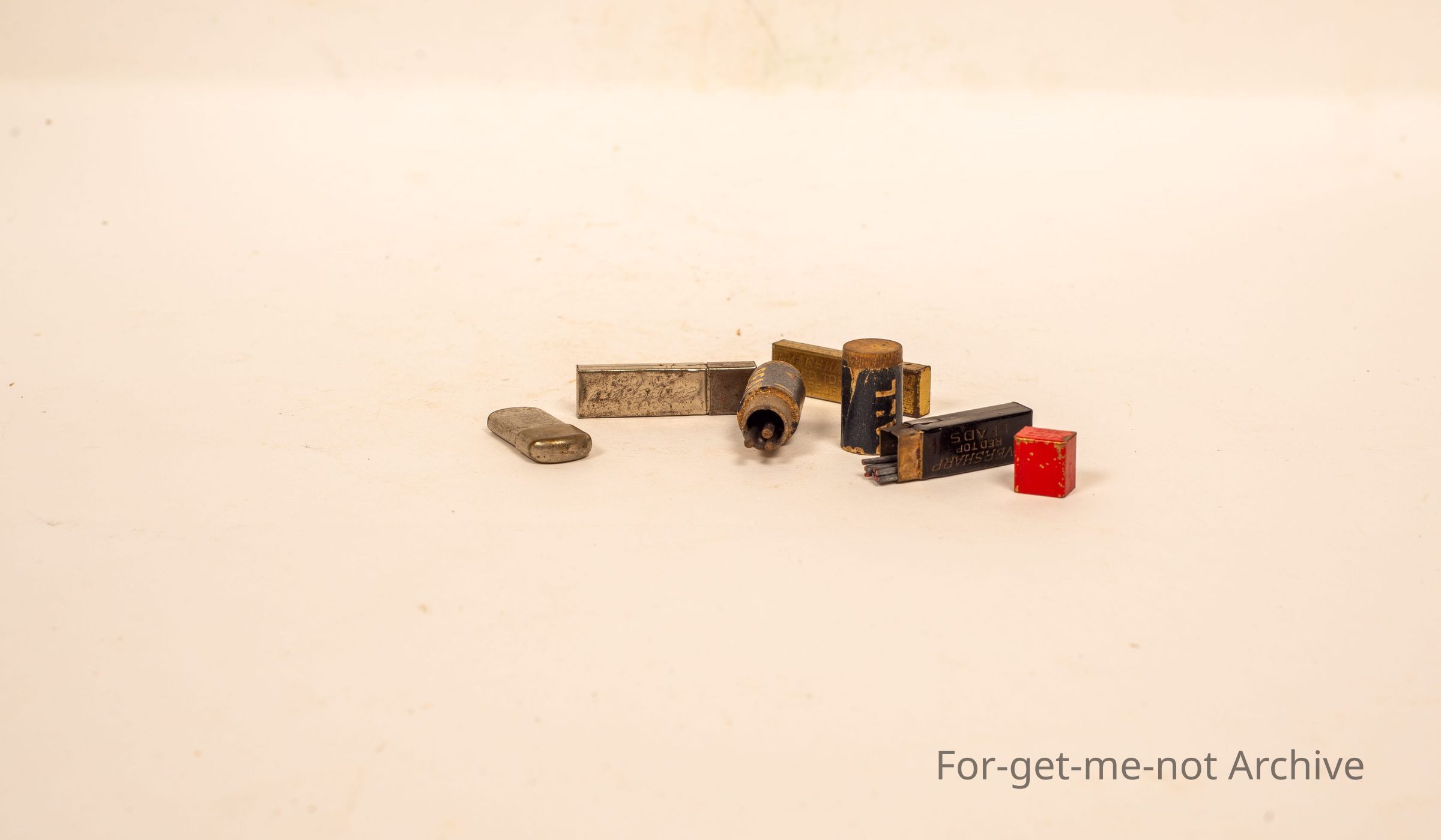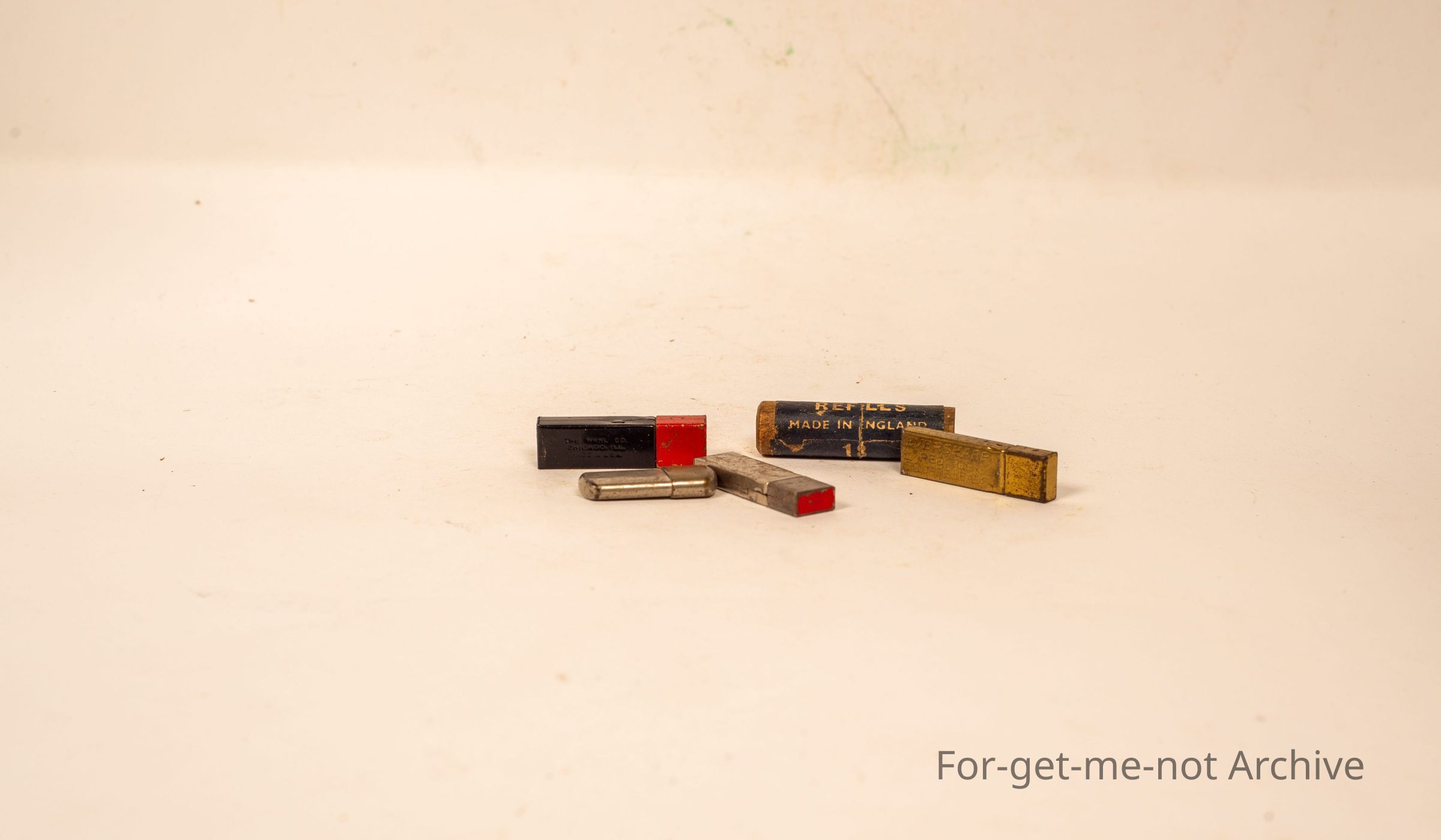 A group of 5, small tins that would have held replacement lead pencil for various type small pens.