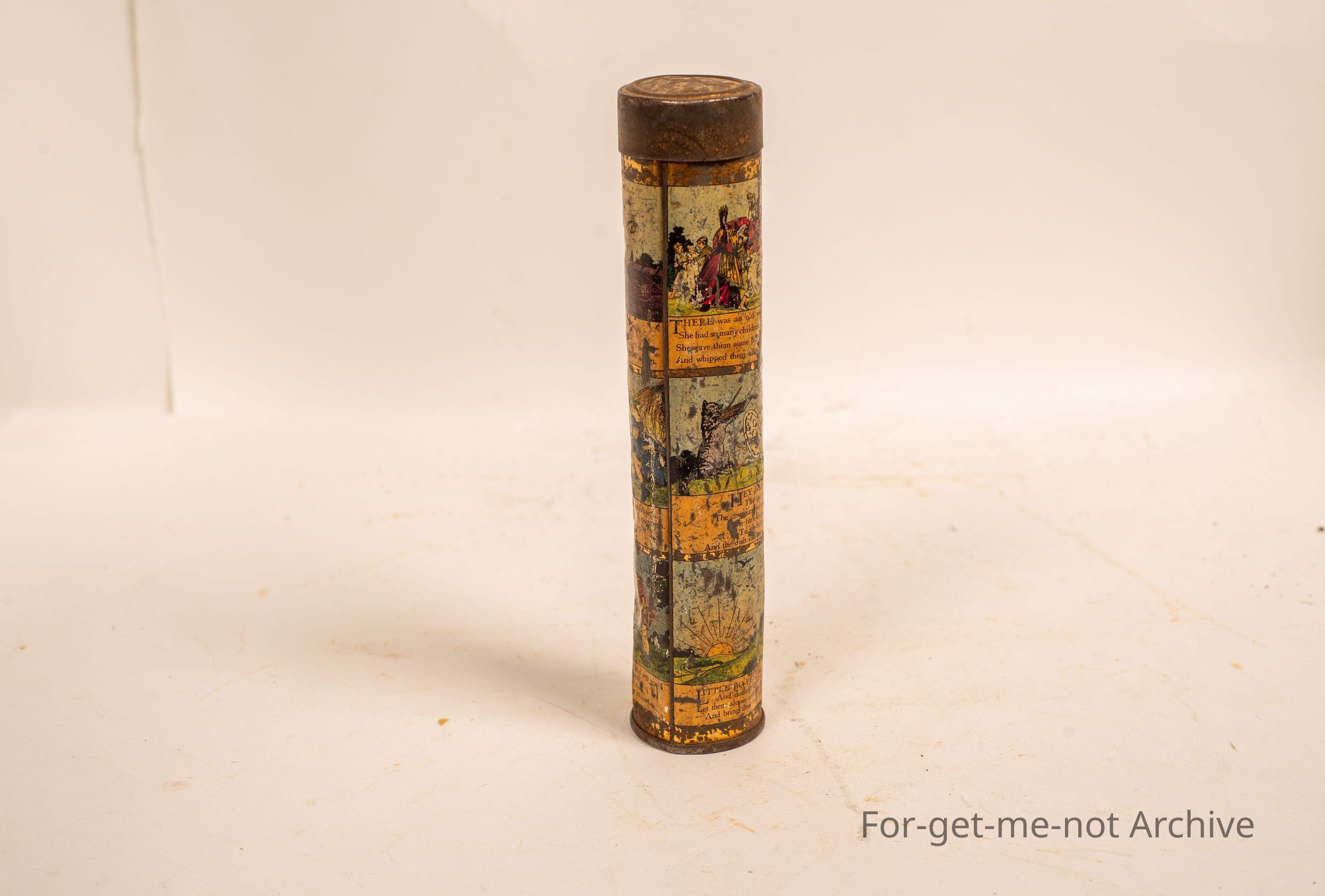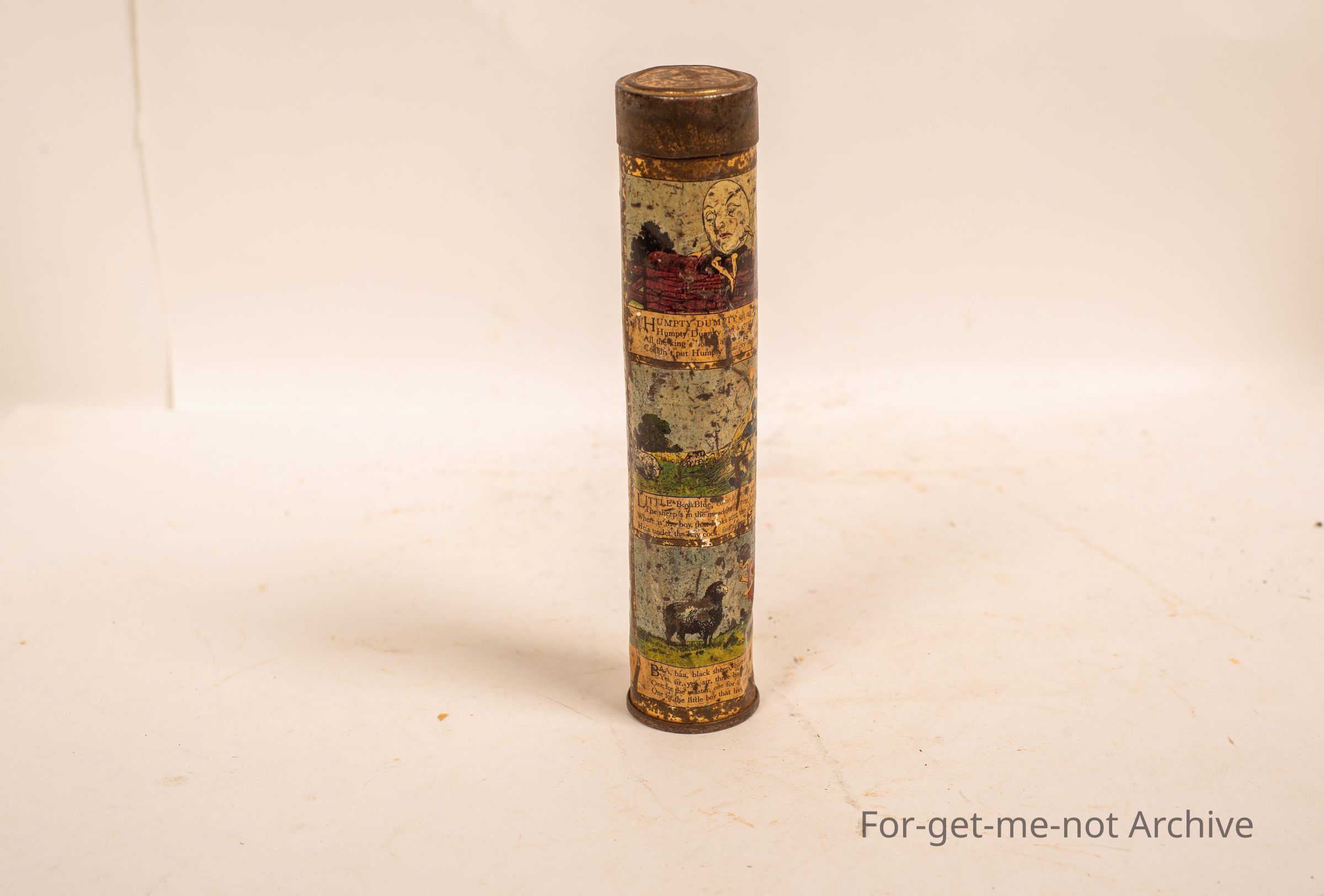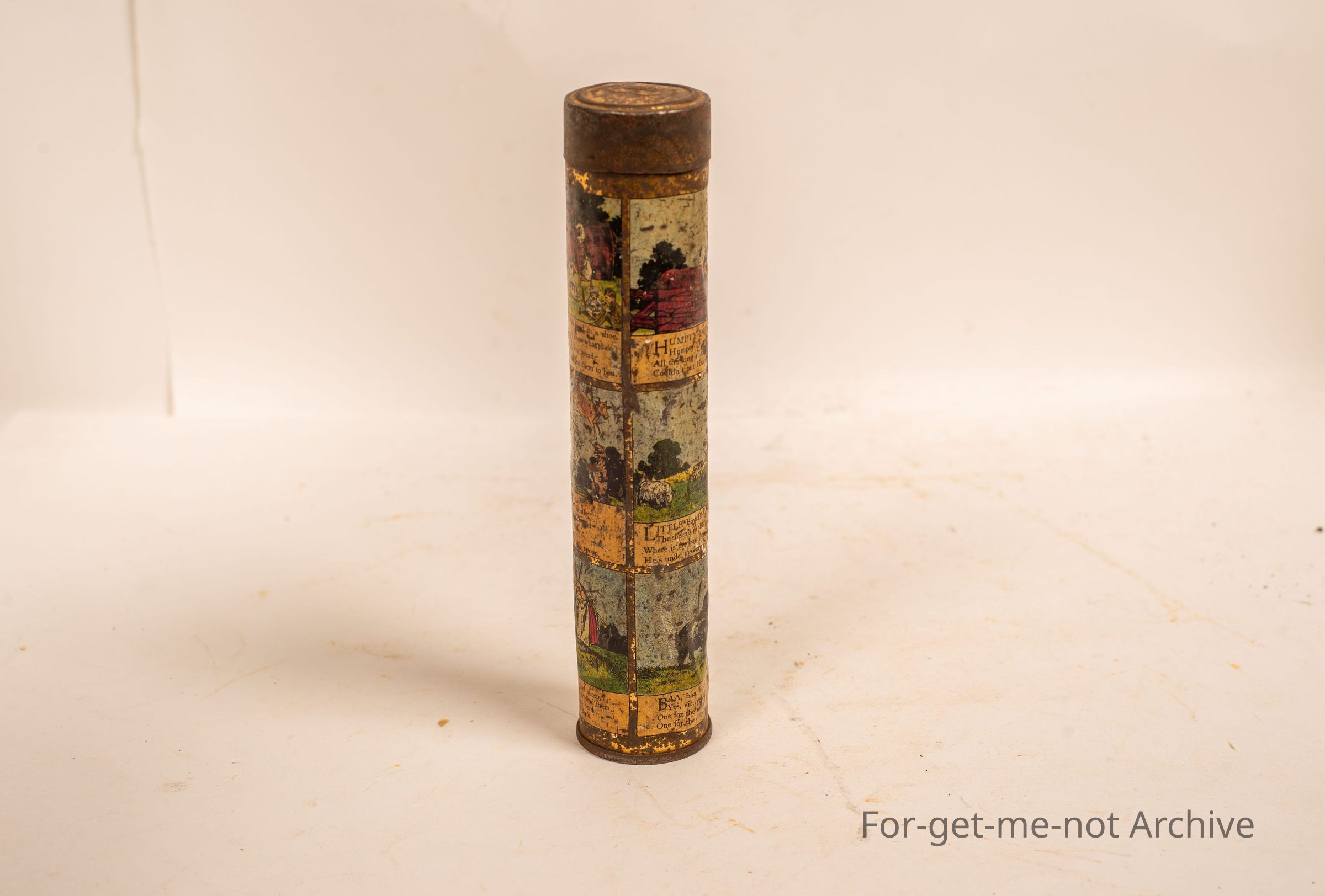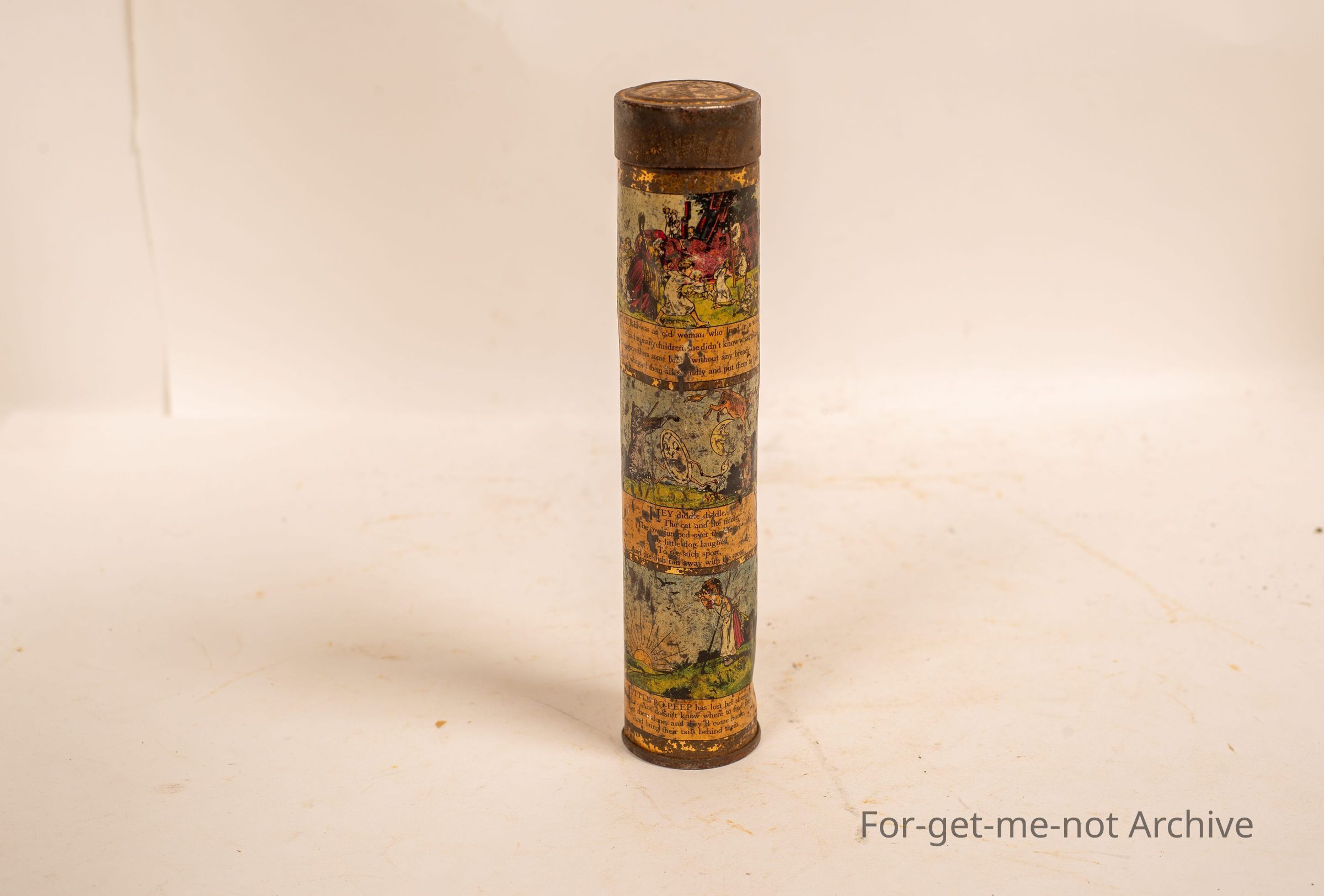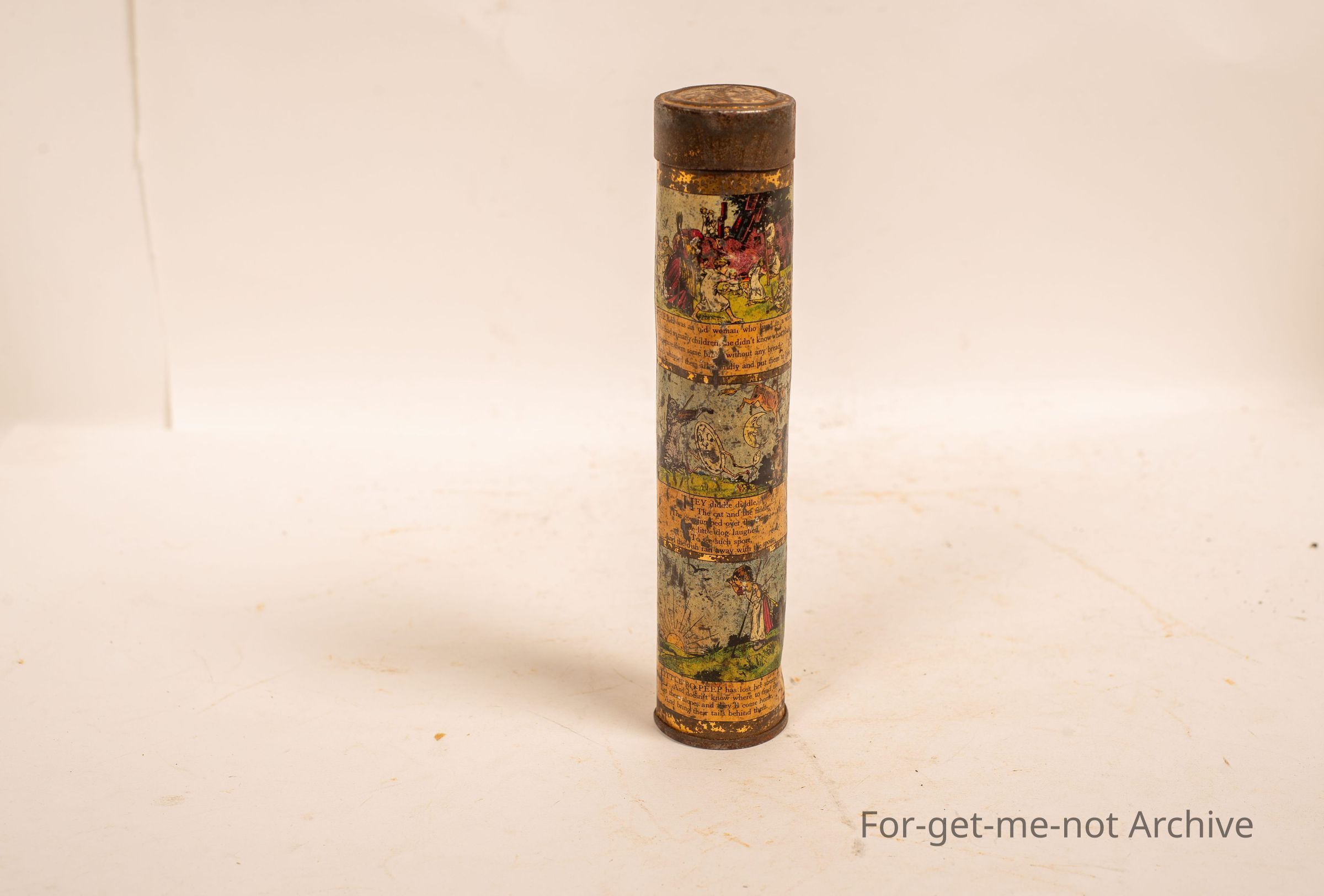A tin cylindrical case from Hoadley's chocolates, depicting various nursery rhymes around each side of the tin. Would be very old, and quite a rare tin in reasonable condition, so it was a kid's tin. A pencil caseCollection