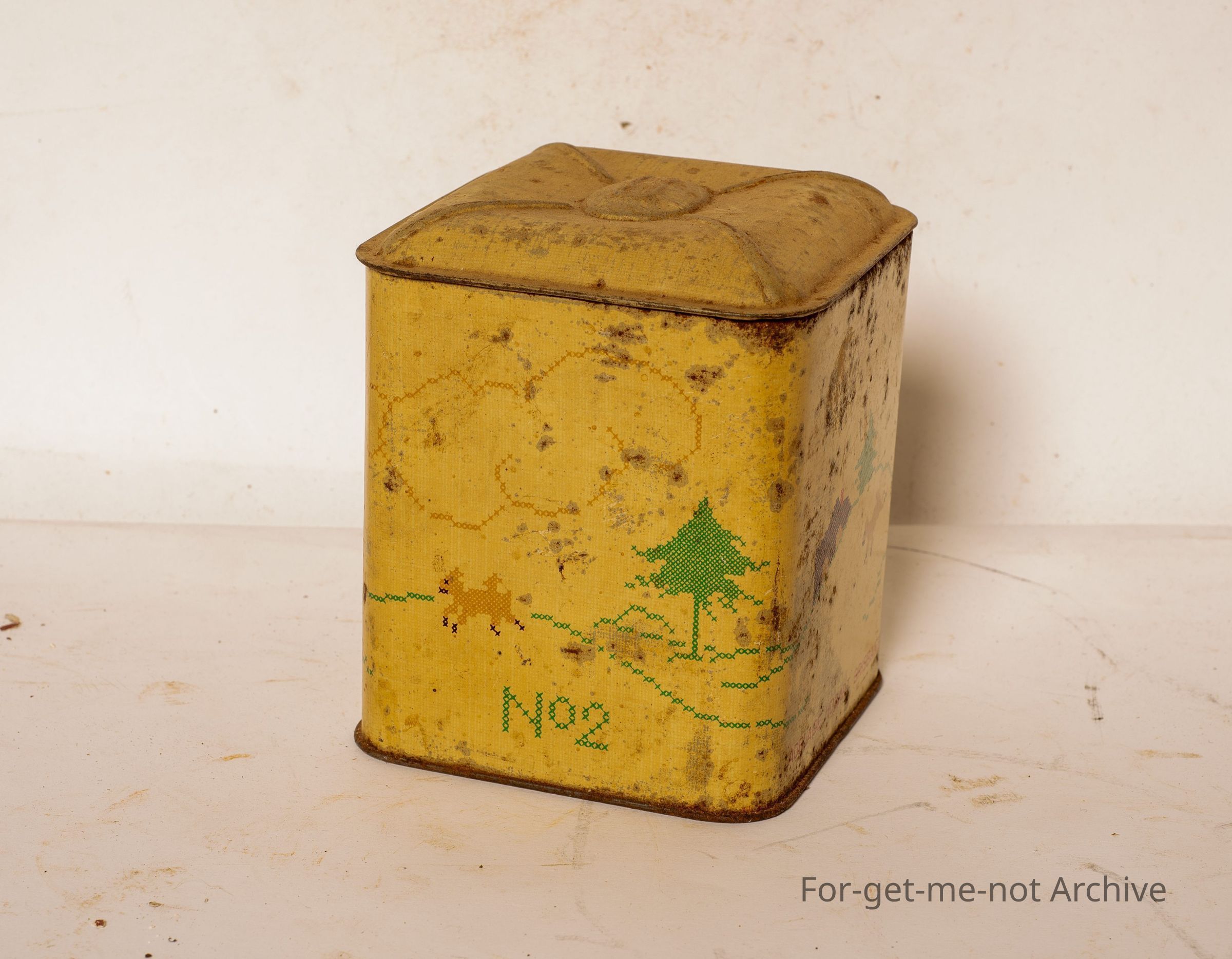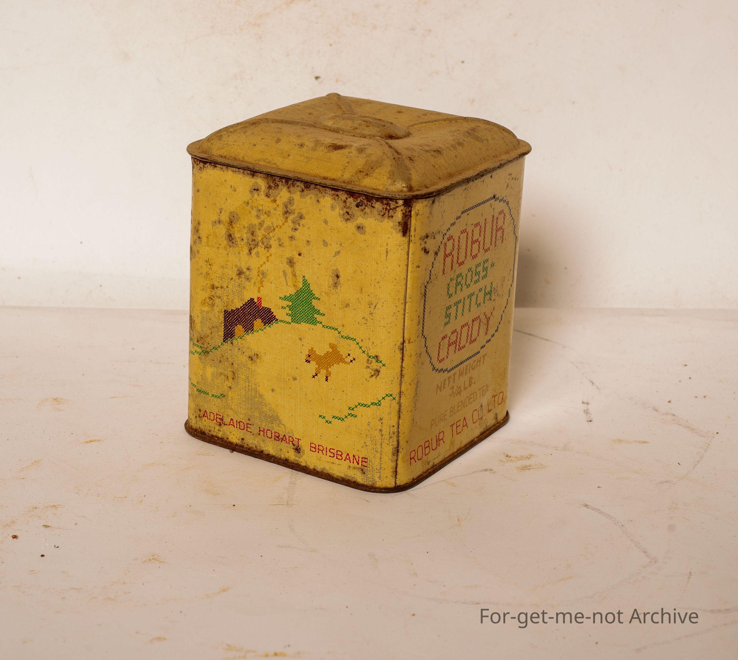 Robour tea tin. this is called the Robour Cross Stitch Caddy. Net weight, 3 quarters of a pound. This has images of cross stitching around each side. Fair bit of writing printed into the bottom.Collection