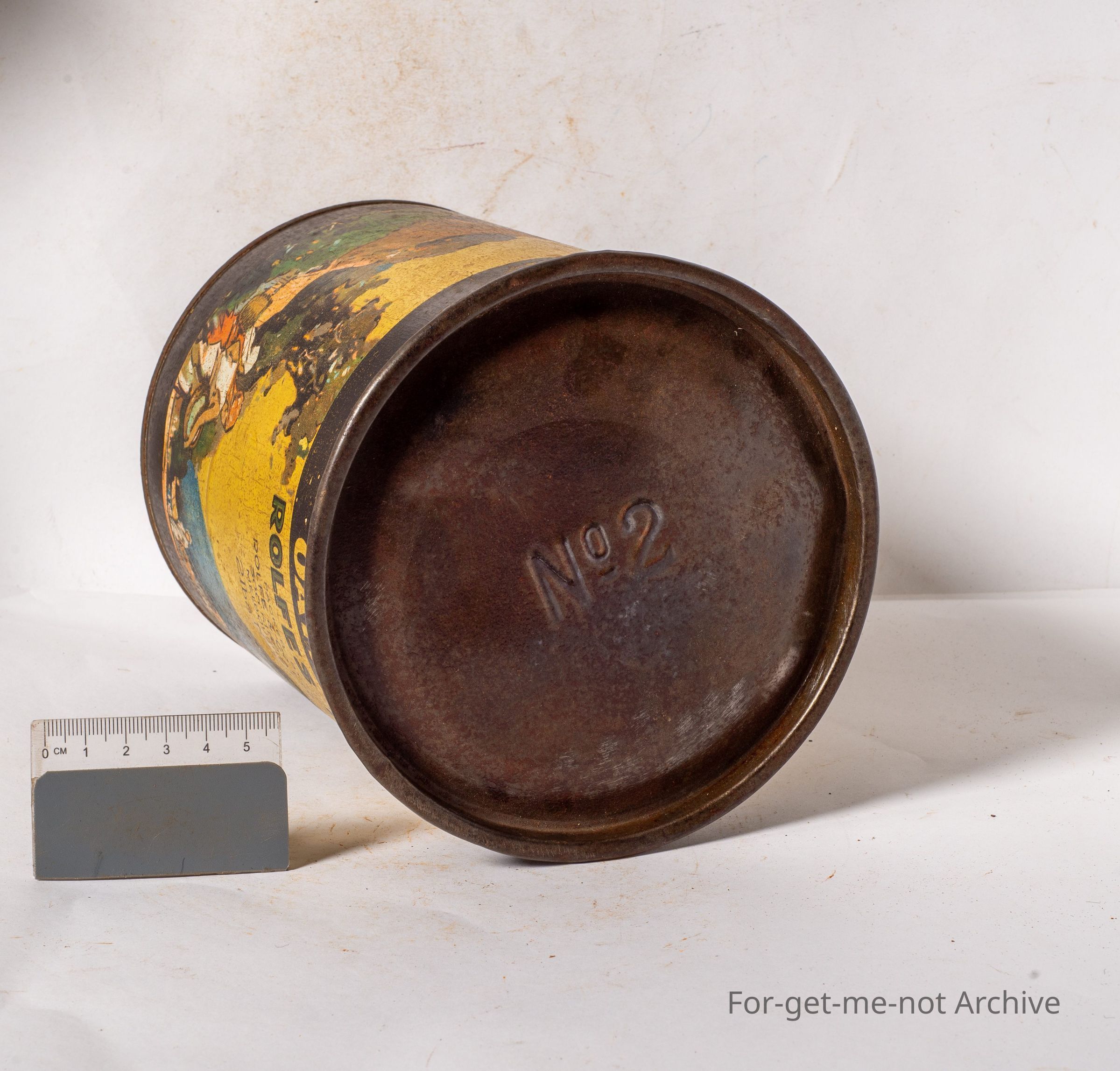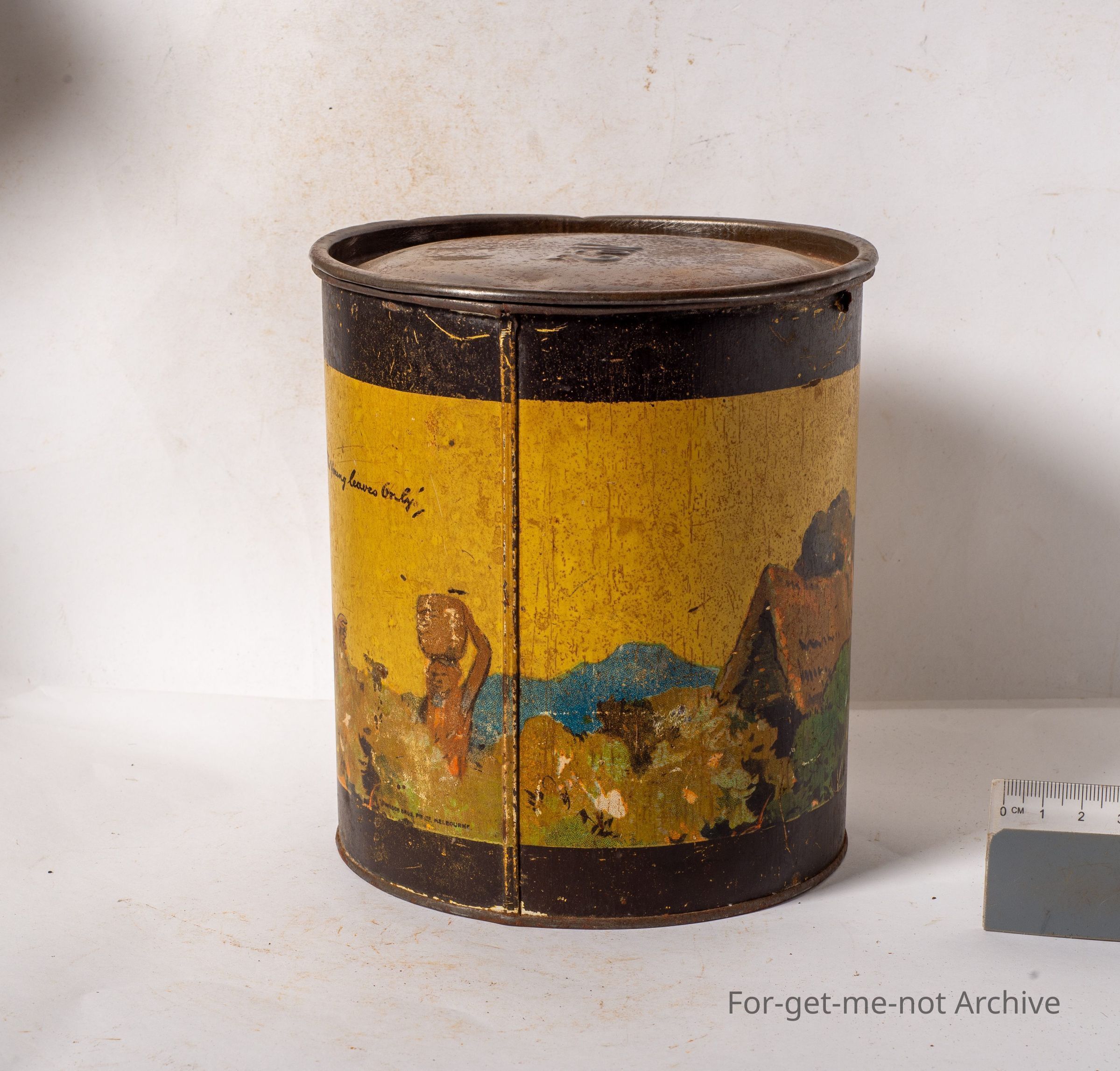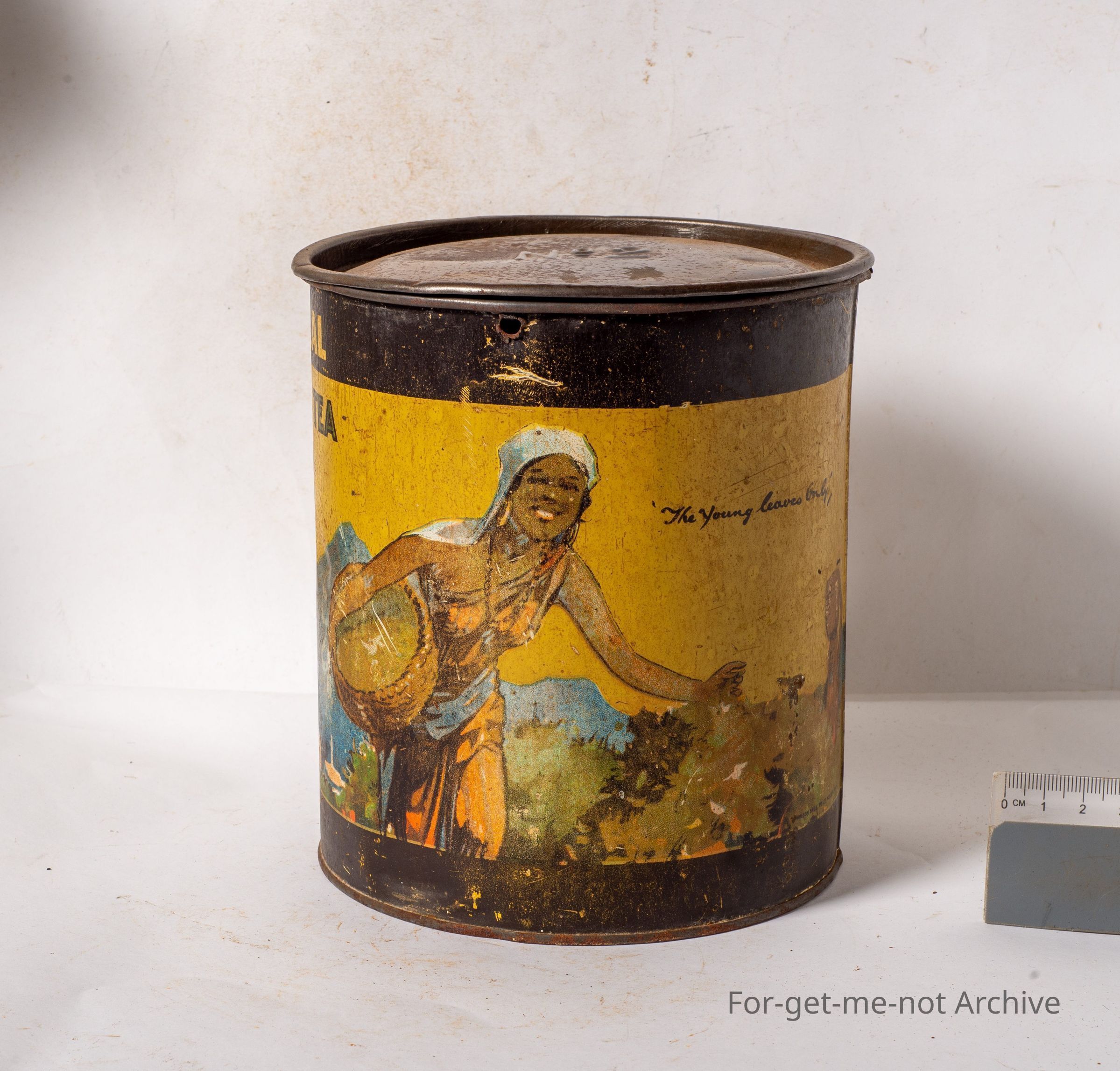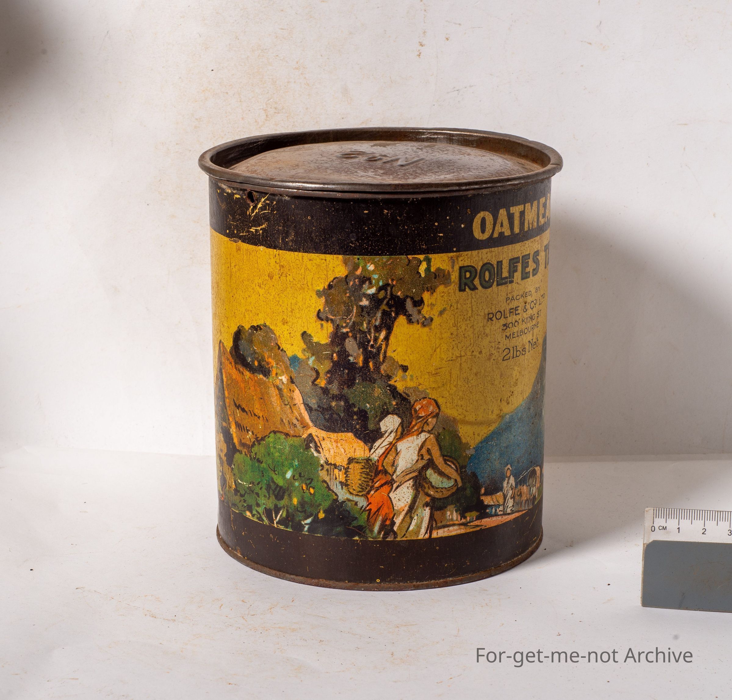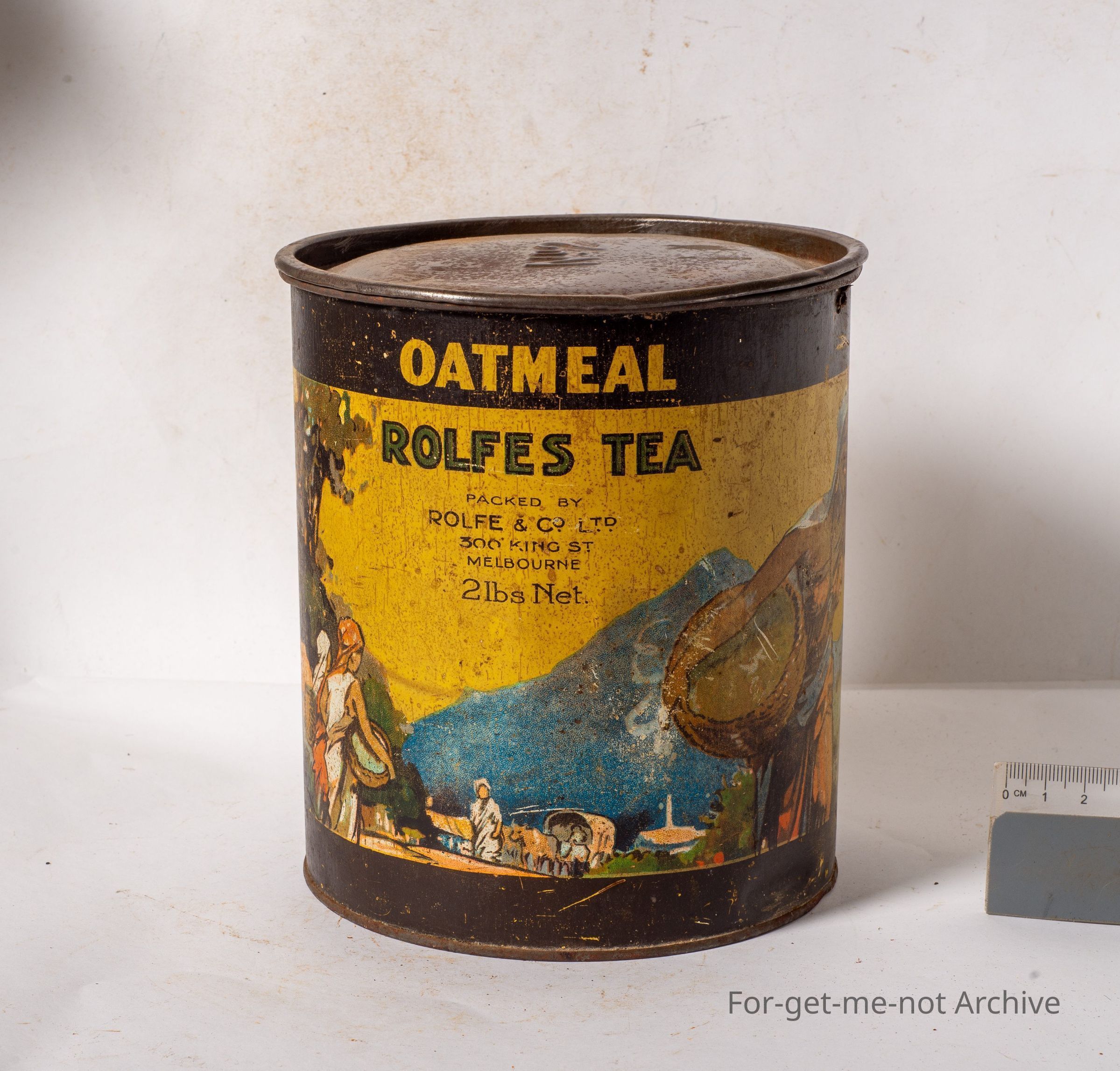 Rolfes tea, packed by Rolfe, King Street, Melbourne, 2lb net. Graphics of tea pickers. The young leaves only. This tin can be reused as a storage unit for oatmeal. Nice early tin,