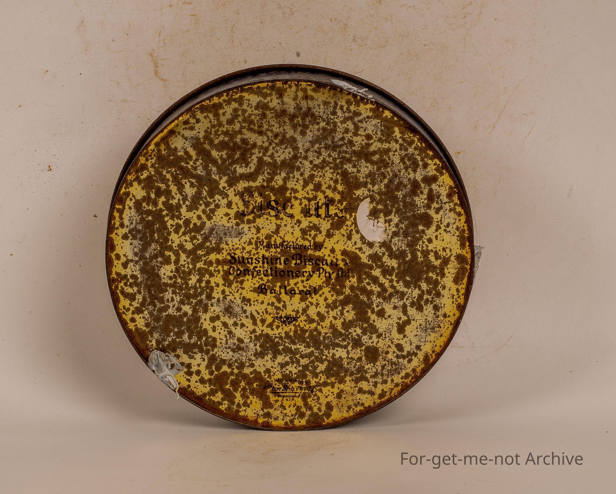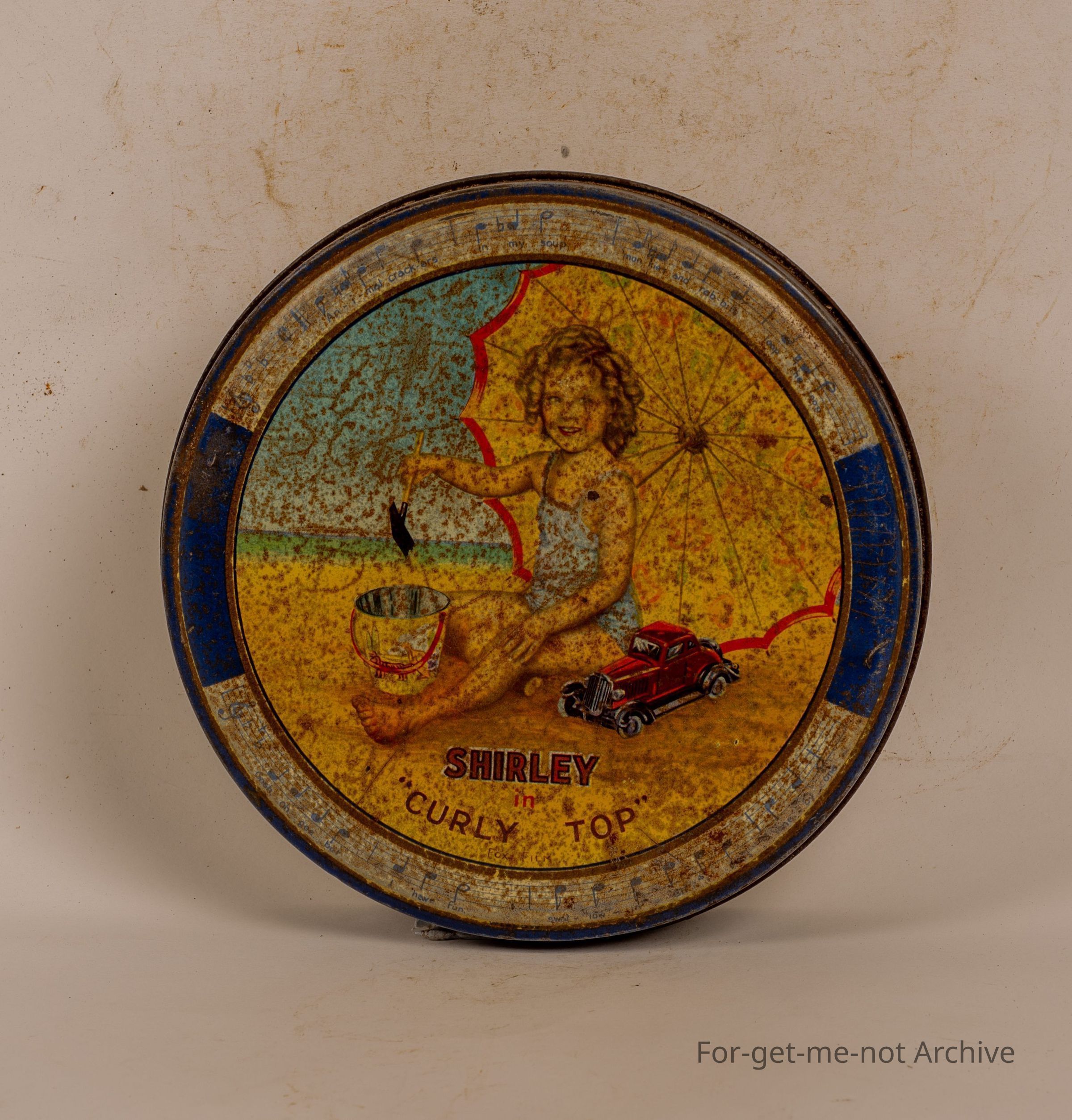 Sunshine Biscuit Factory tin with Shirley Temple sitting in a beach scene, not in very good condition but quite a scarce tin