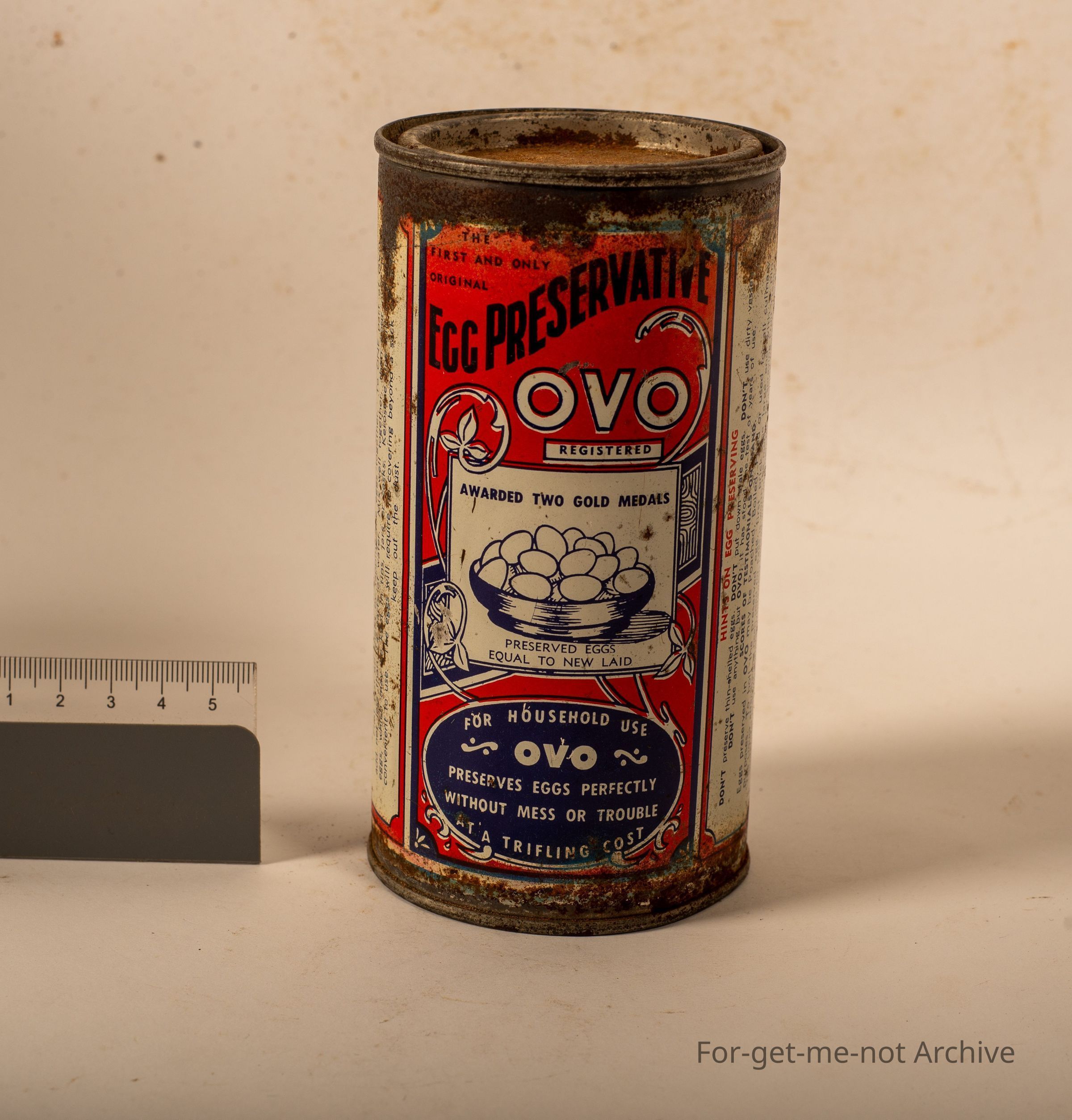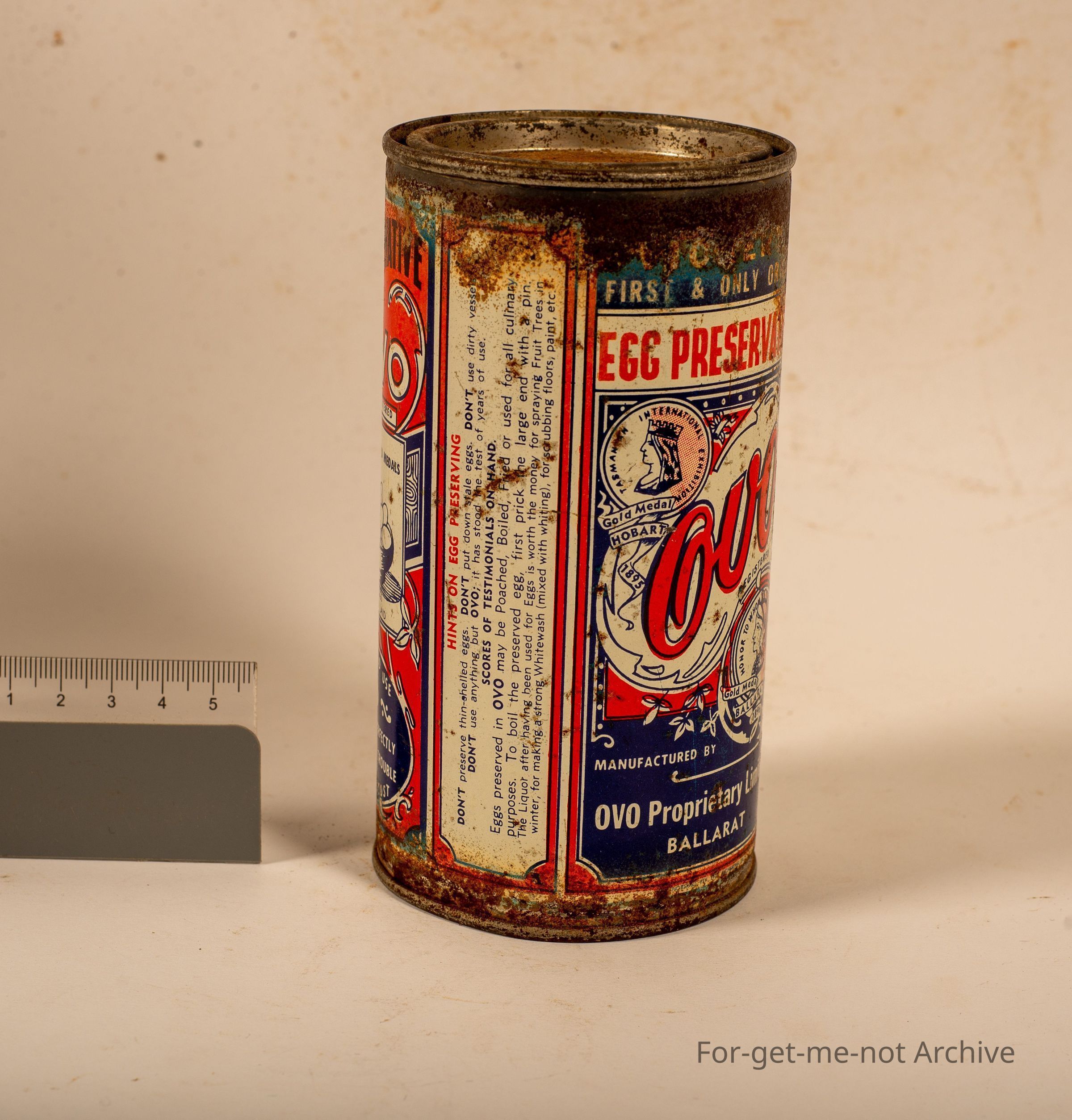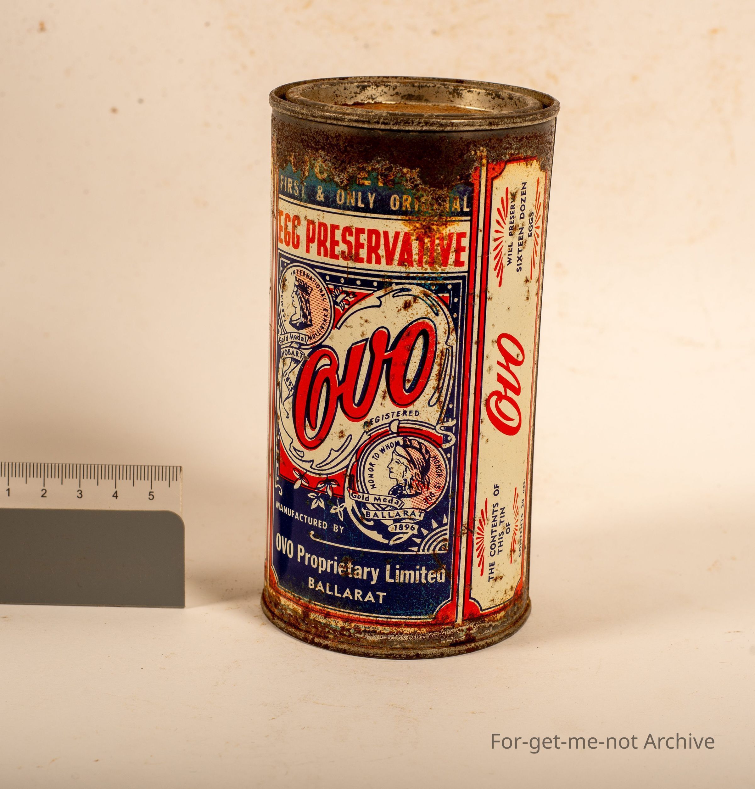 A tall tin from OVO Pty Ltd Ballarat for egg preservative. OVO depicting seen a bucketful of eggs on the front. Quite a rare tin in reasonable condition for its age. Full of the material.