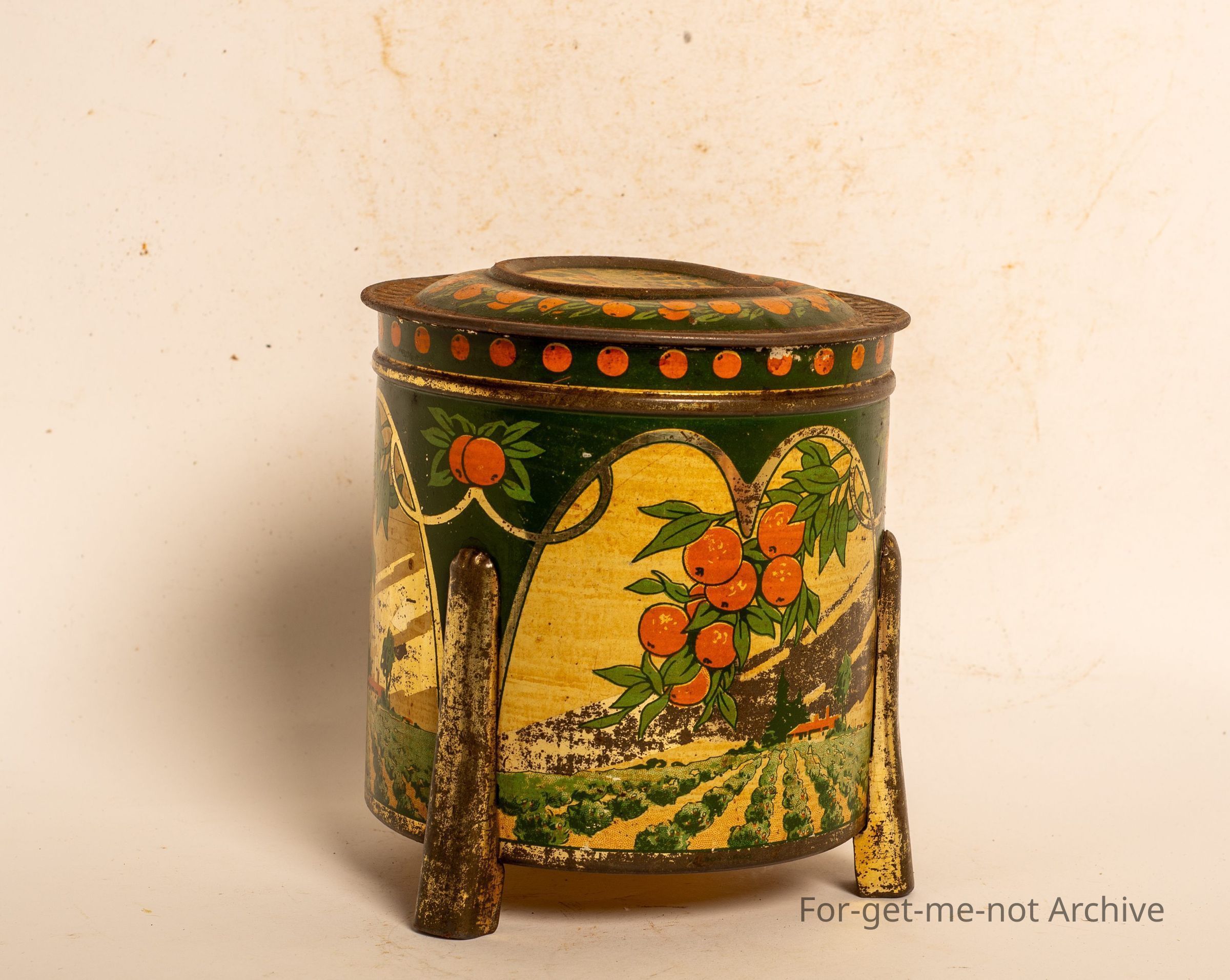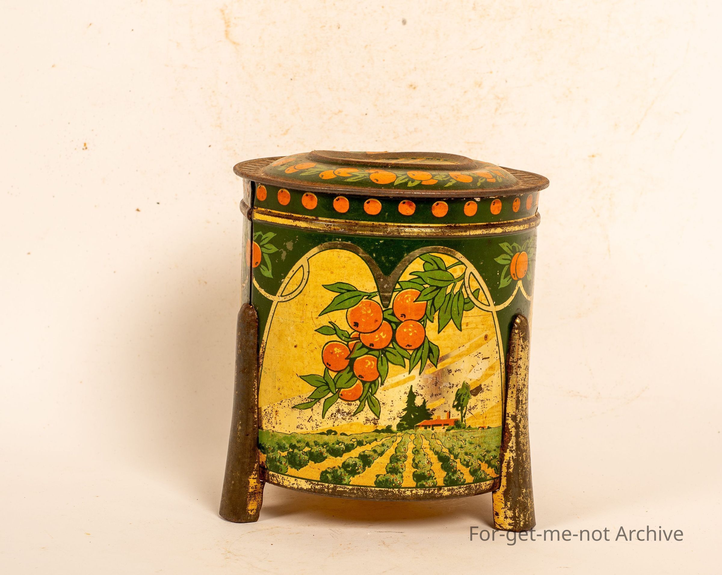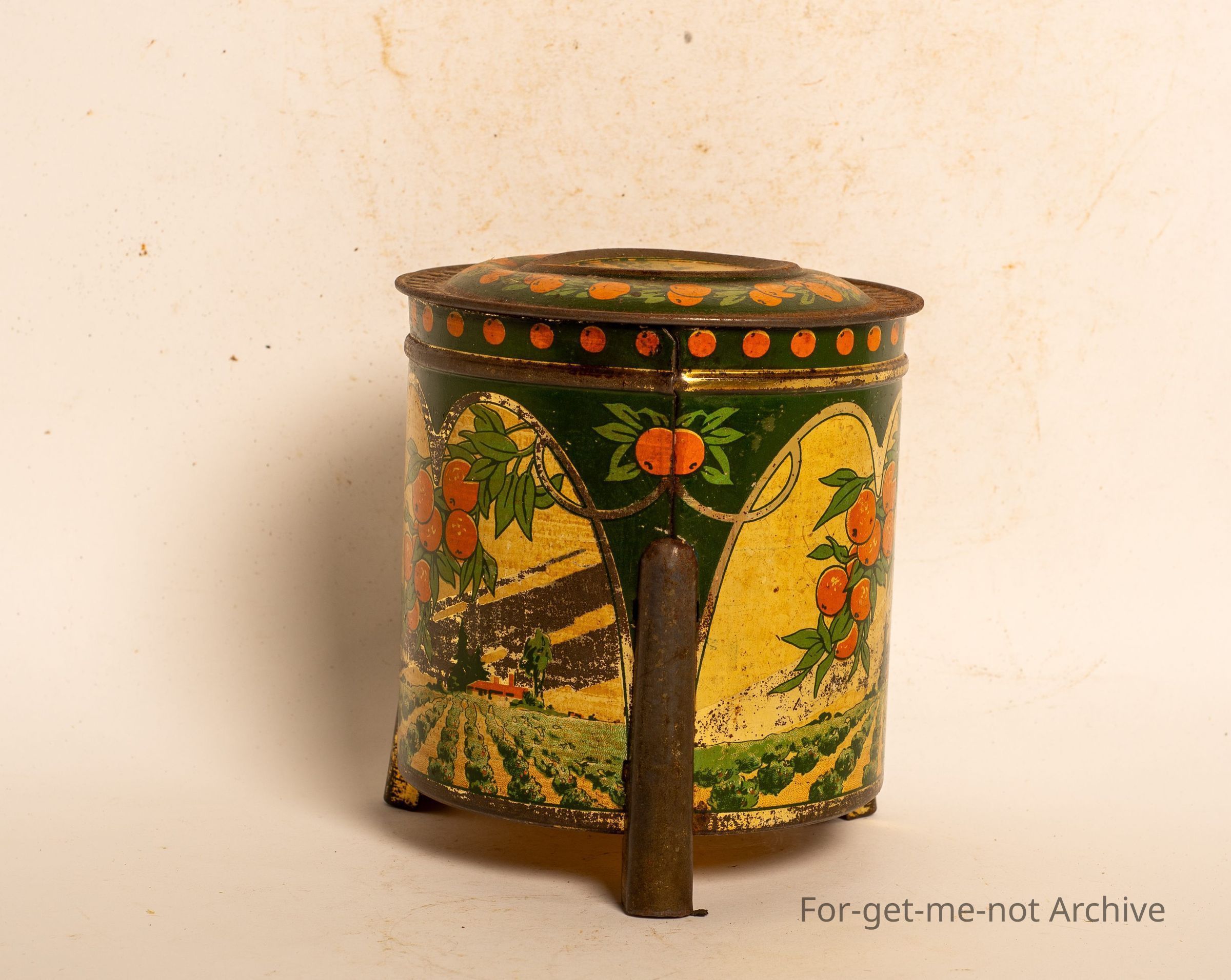 Biscuit tin from Sunshine Biscuits at Ballarat. Three legs, very good,