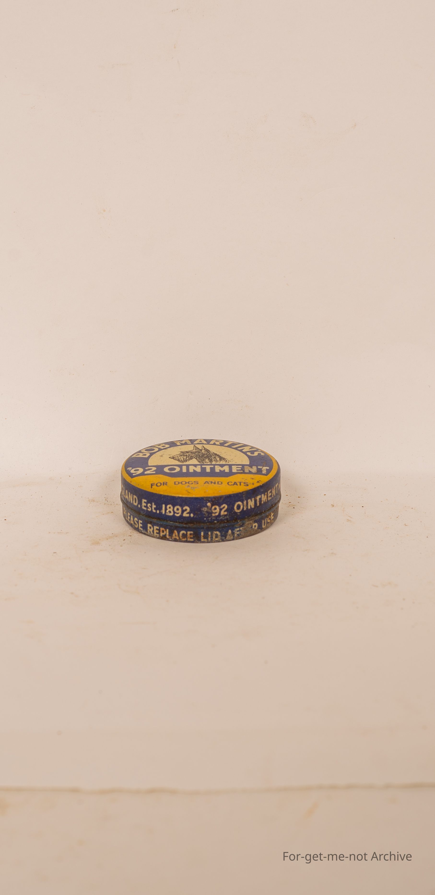 A tin of Bob Martens 92 Ointment, Terrier dog on top. On front for dogs and cats
