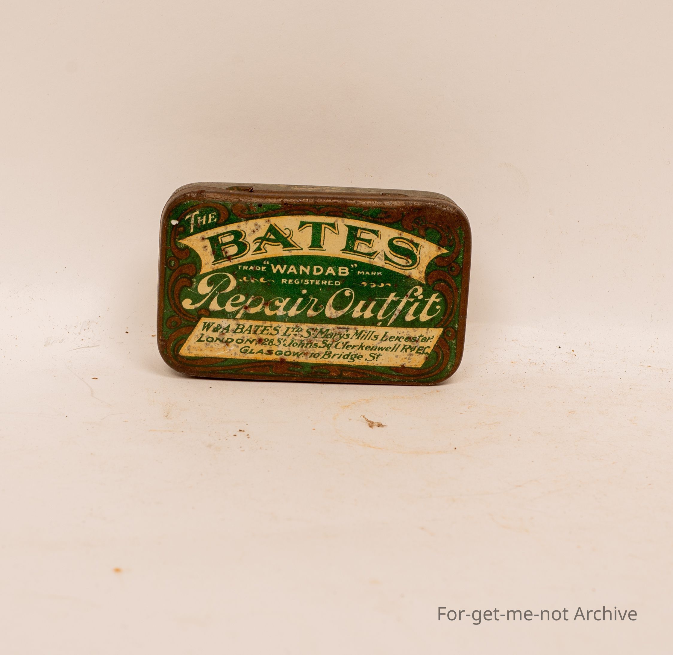The Bates repair outfit, made in Glasgow, an unusual tin for bicycle tube repairs