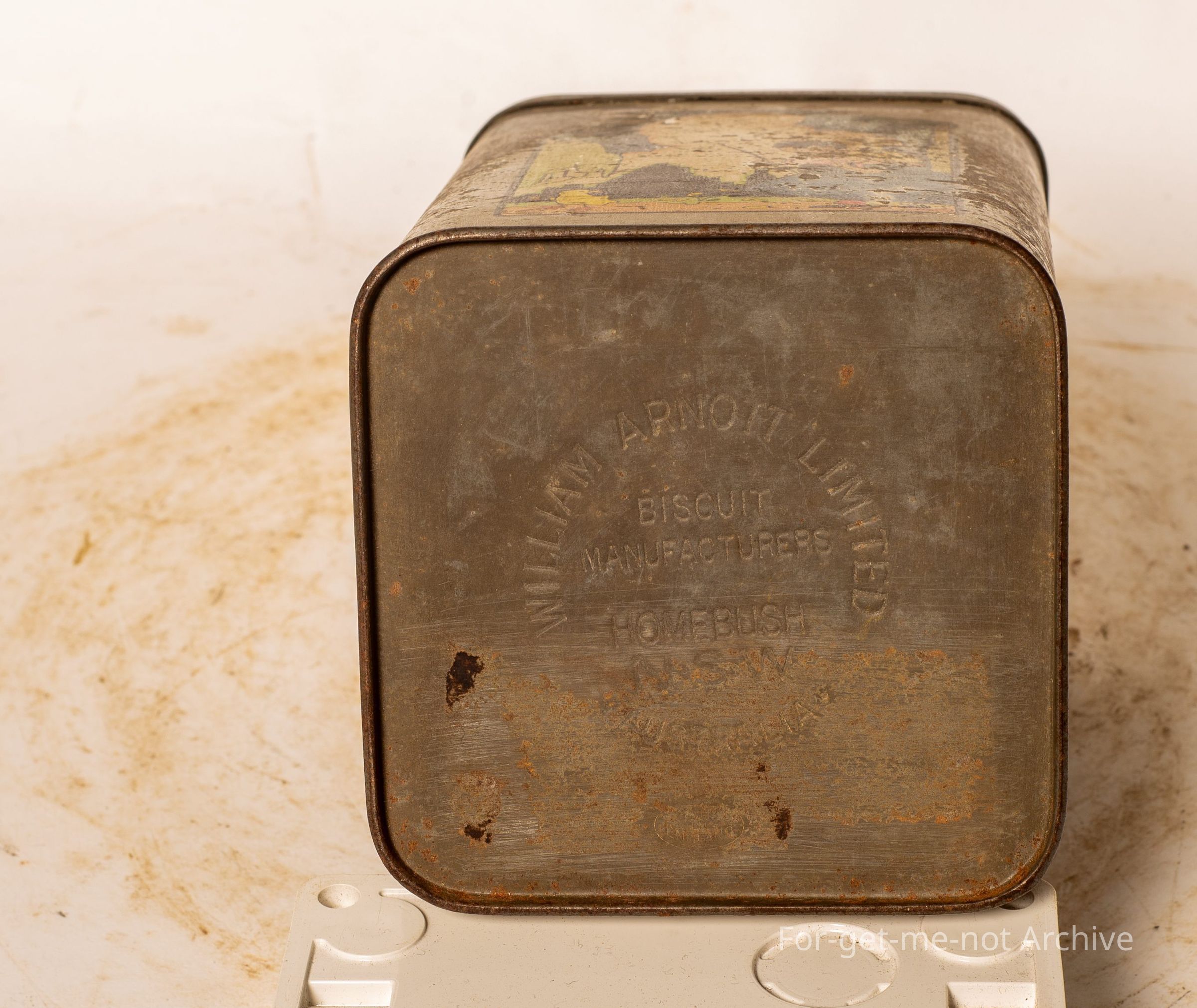 An early Arnott's tin stamped on the base from Homebush. The tin is in down condition, but still scarce.