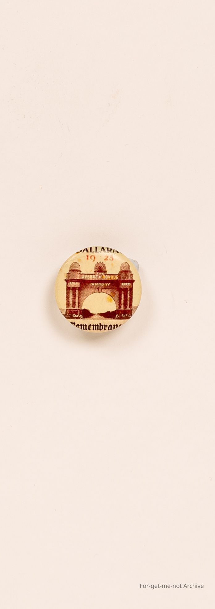 Tin badge. Ballarat remembrance day 1923 with image of Arch of Victory.