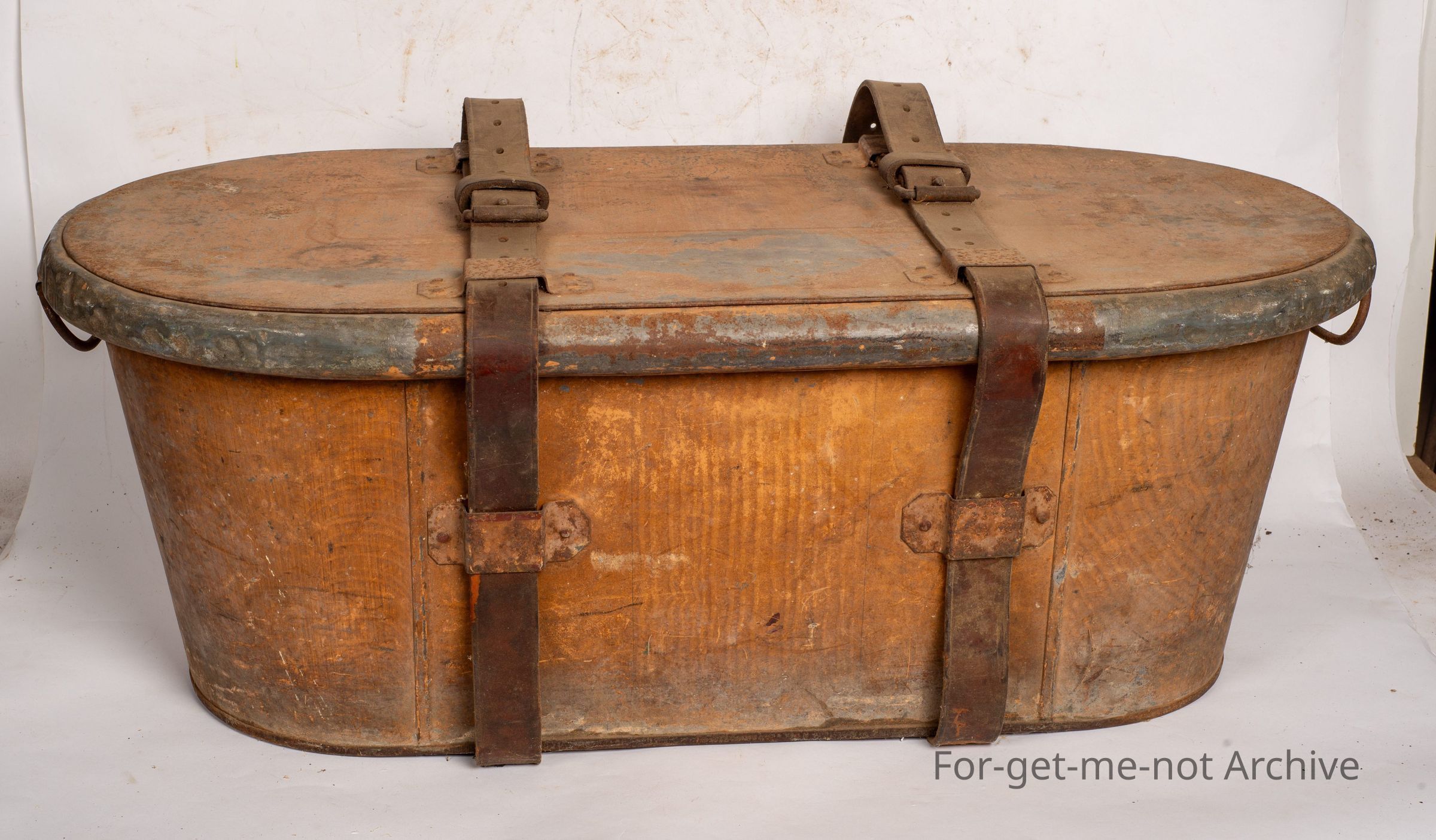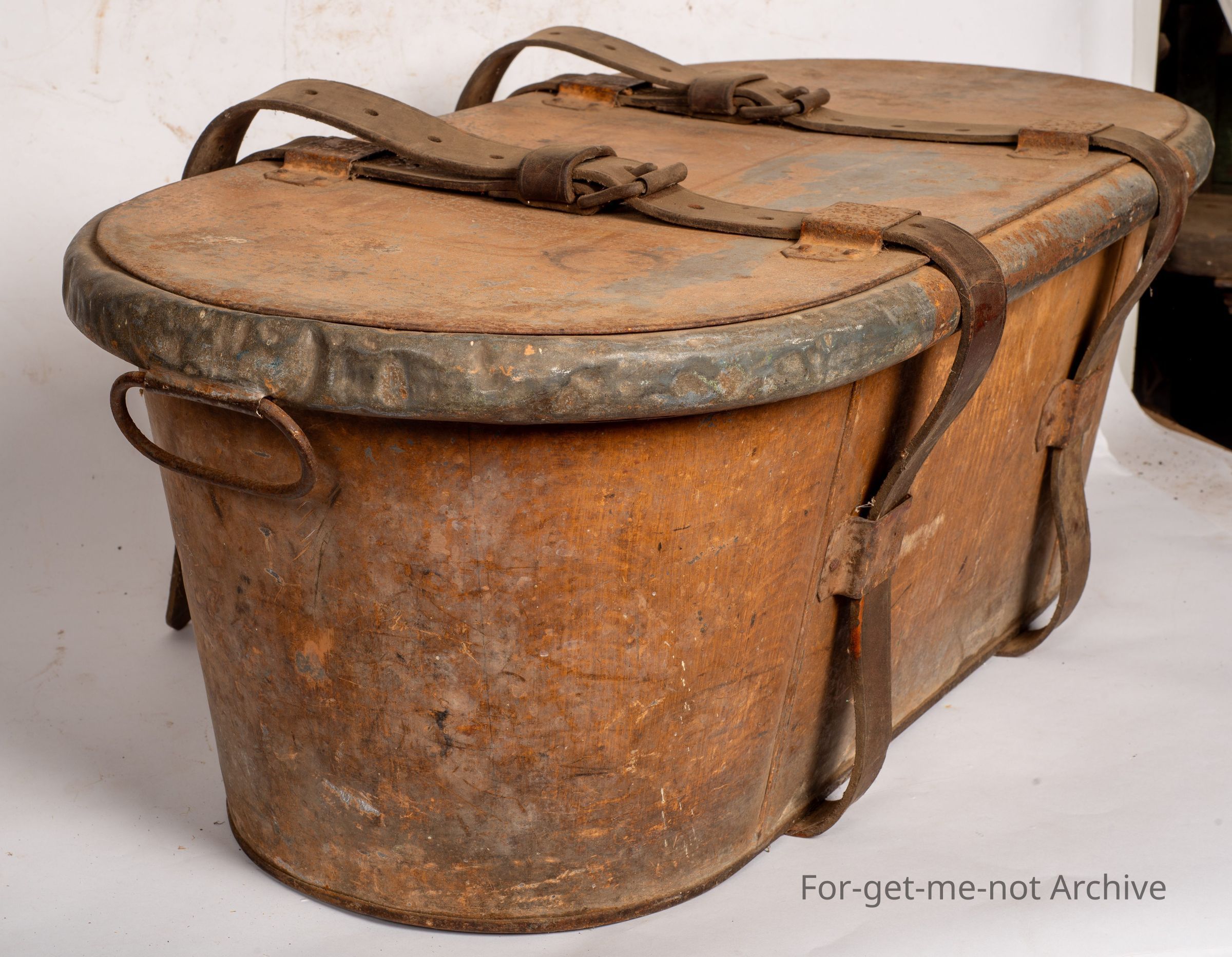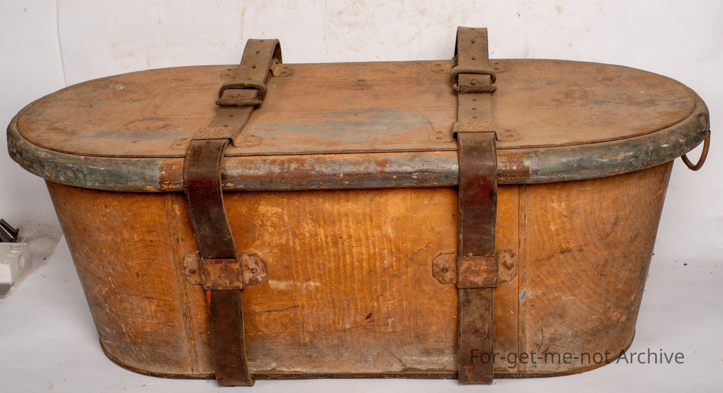 This is an unusual piece, very hard to find. These were a tin bath with a lid that were used by people traveling long distances overland in horse drawn drays and carriages. This they were held together by heavy strapping, which strapped them onto the load. Rarely found with the lid and the straps. A marvellous early piece of domestic useCollection