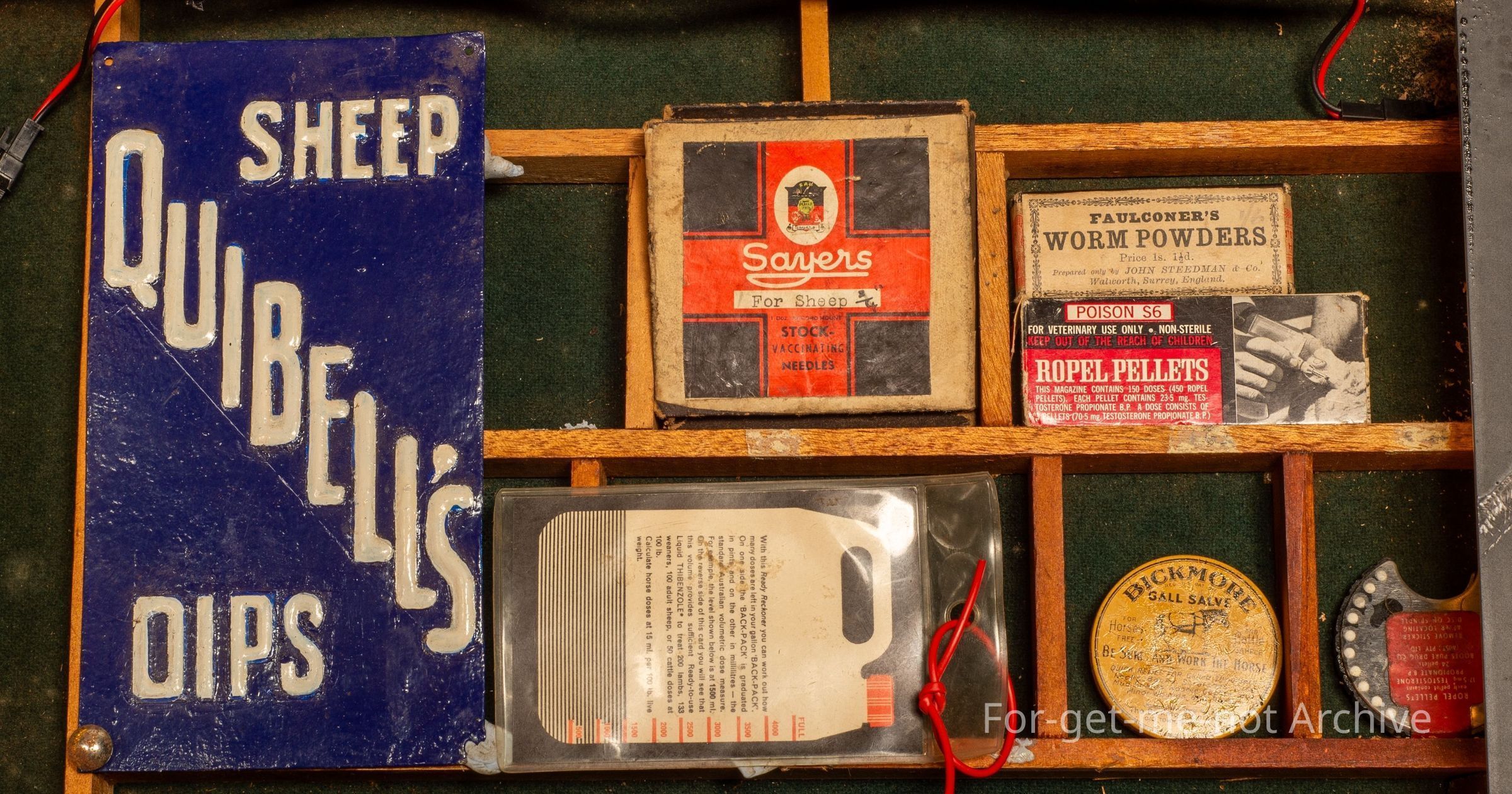 This is a little group of advertising pieces and products from the sheep industry of years ago, a little tin sign from Quibbles, a tin of a box of needles from Sayers Allport, a container of Ropel pellets, which was hormone, and advertising for Thiobenzol. A nice little group, reflective of animal health years ago.Collection