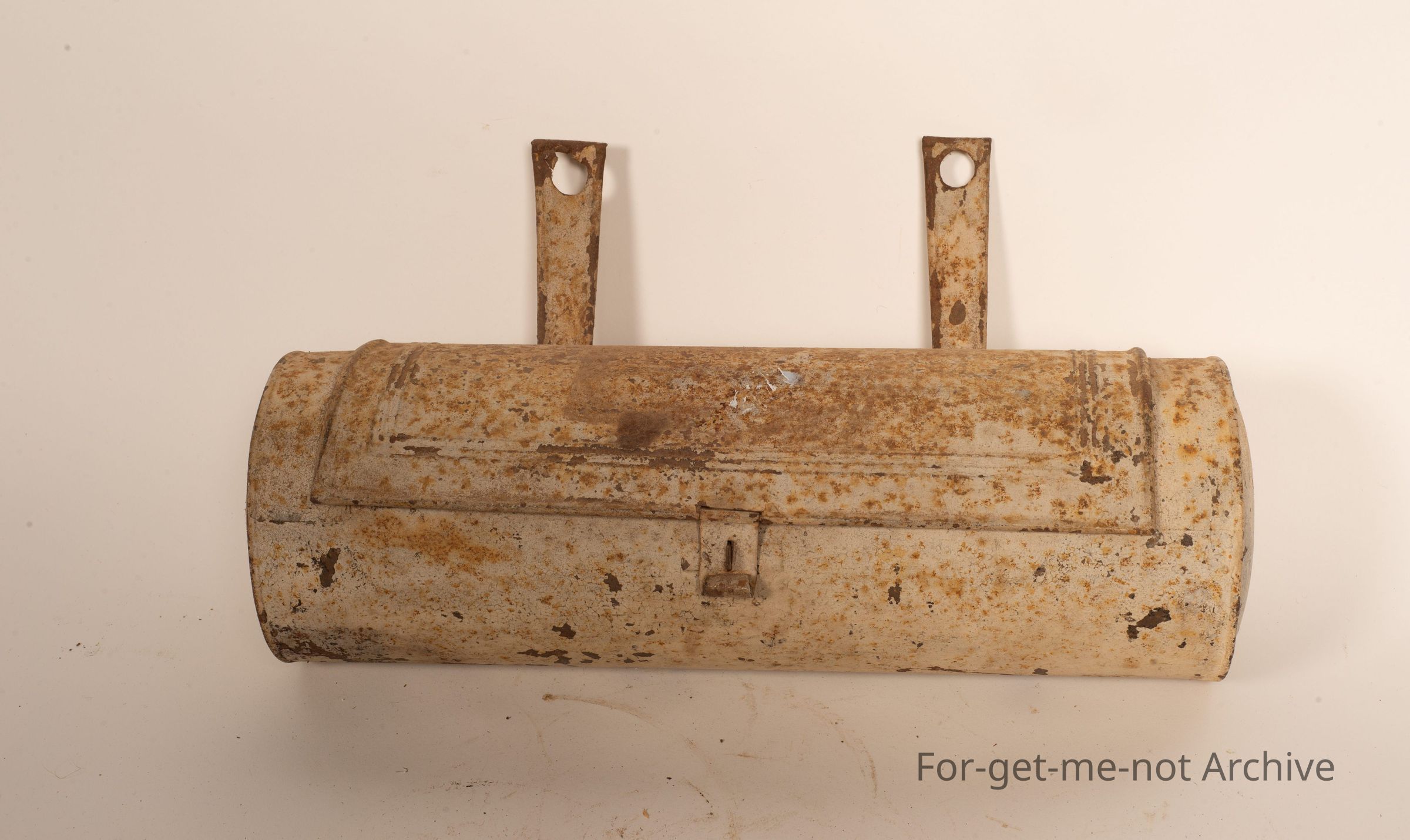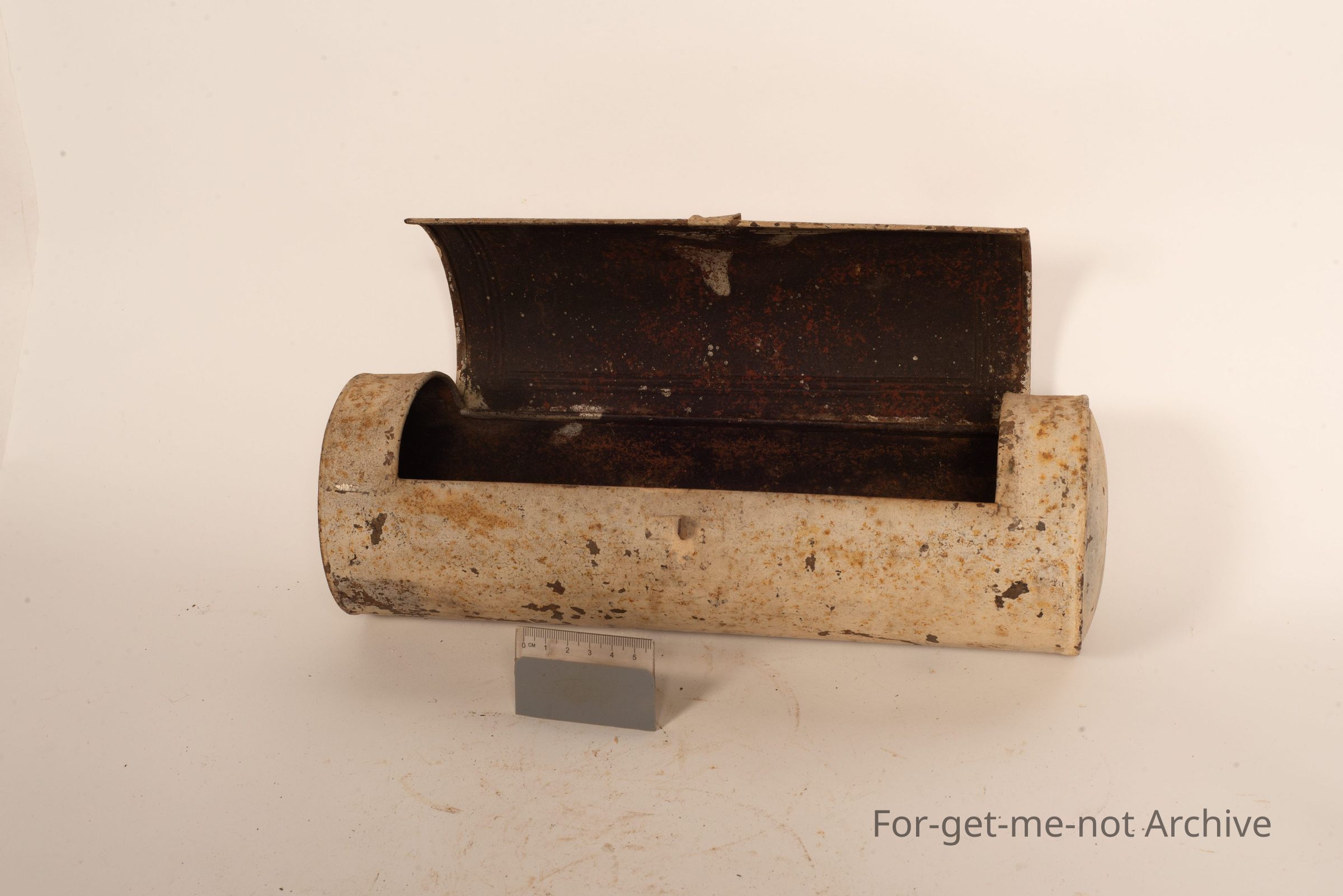 This is a tin candle box, vermin proof, a lockable lid. These were a cylindrical box, kept in poor households to keep vermin out of the candles. Also kept in carriages. Once again, lockable to keep the vermin out. An early day thing.Collection