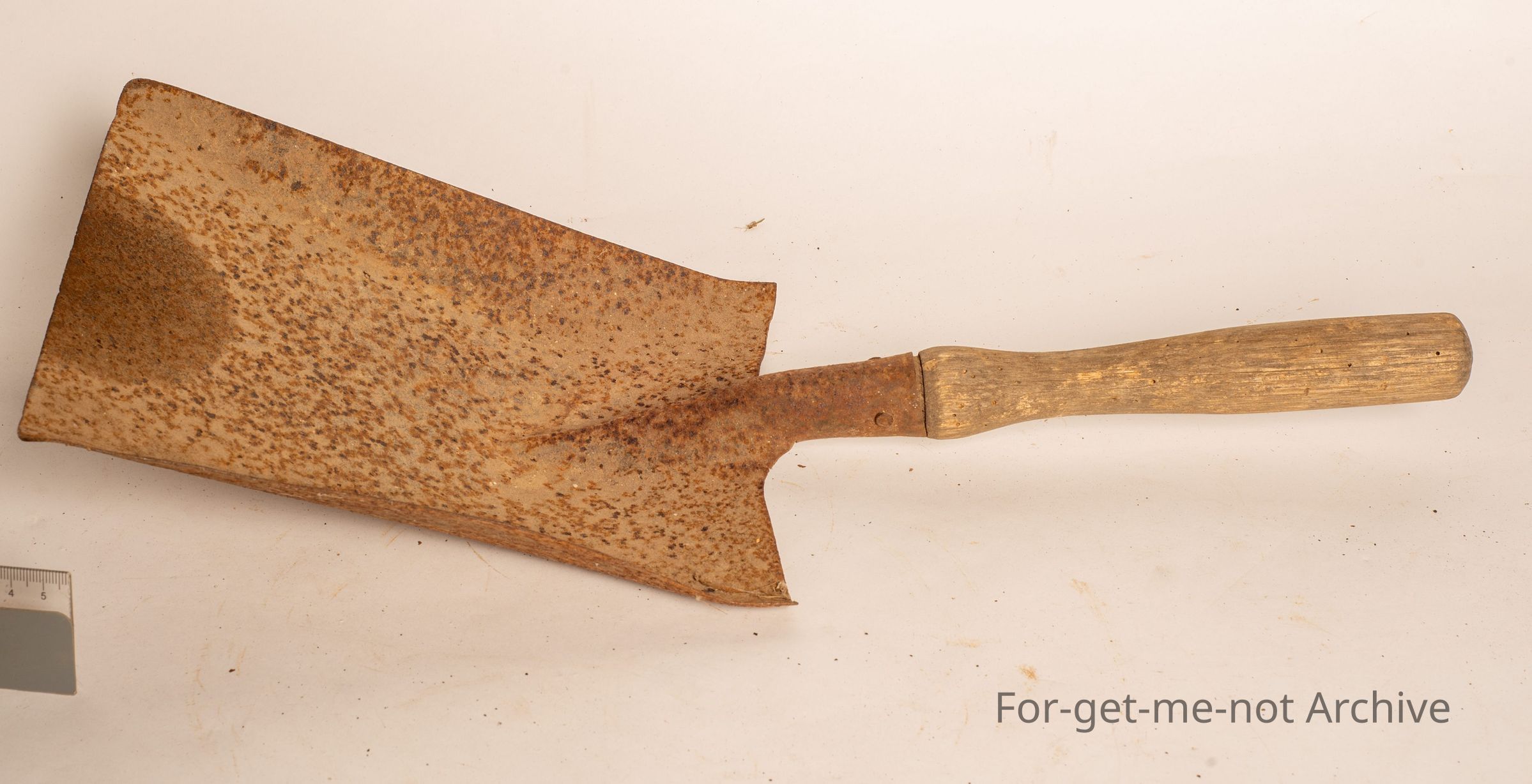 This is a tin hearth shovel, wooden handle. Still in good order. Would clean up nicely. Would have been used on the hearth of the fireplace
