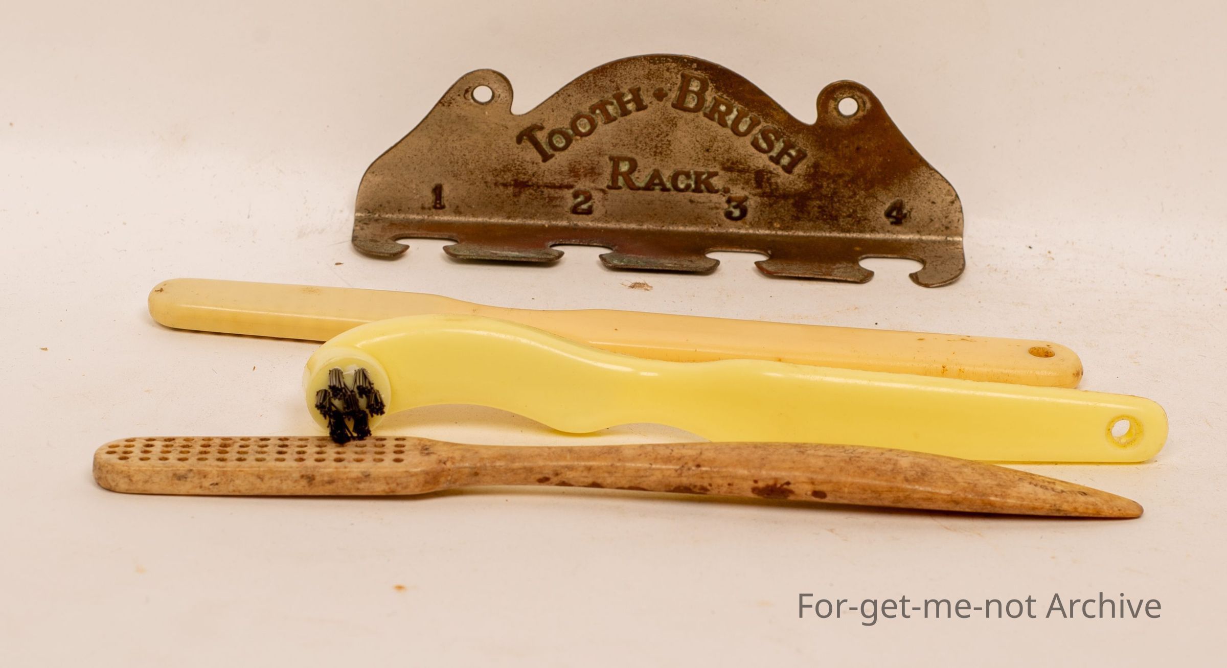 Tin holder for toothbrushes with 3 toothbrushes 2 x bone handles