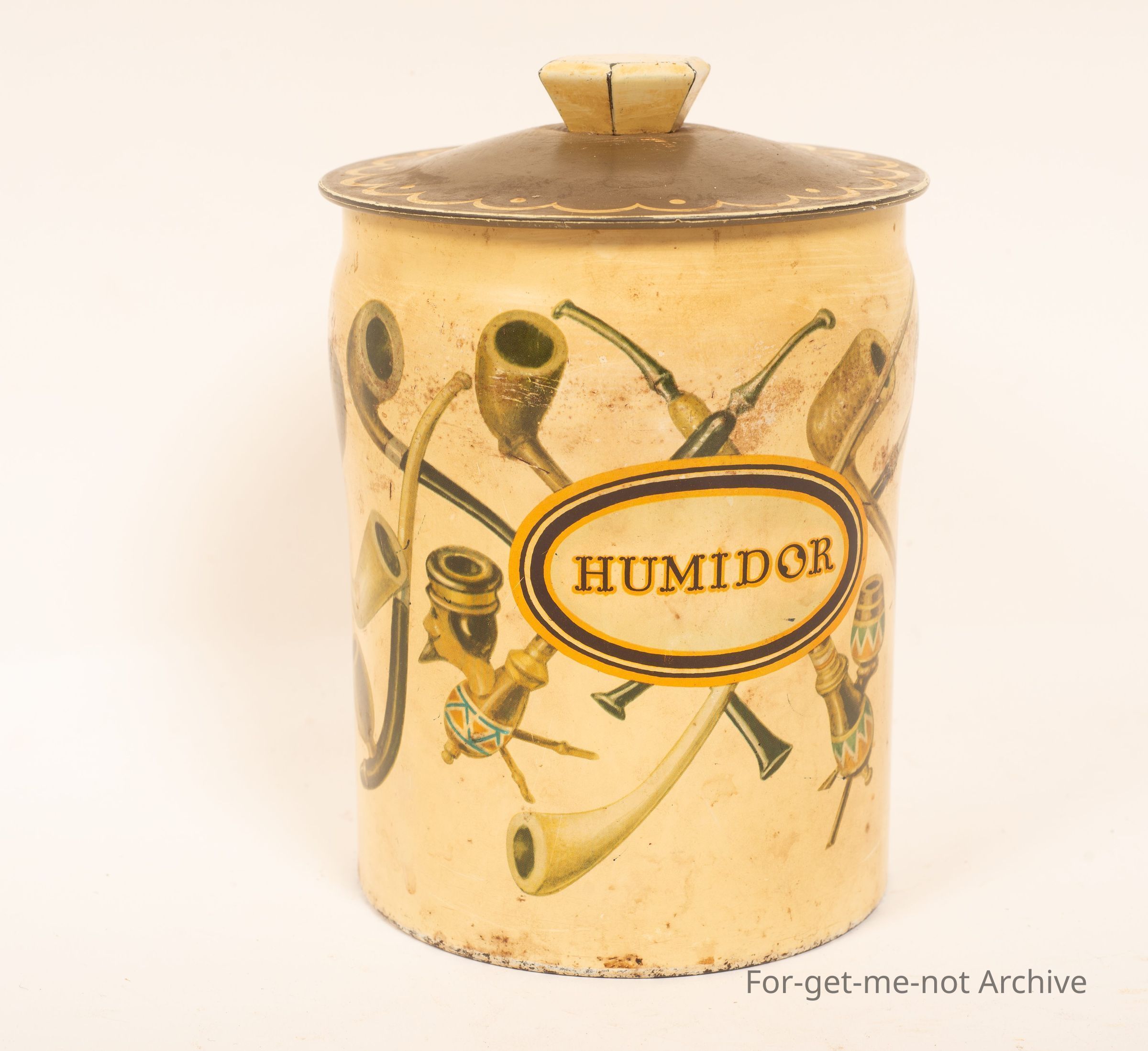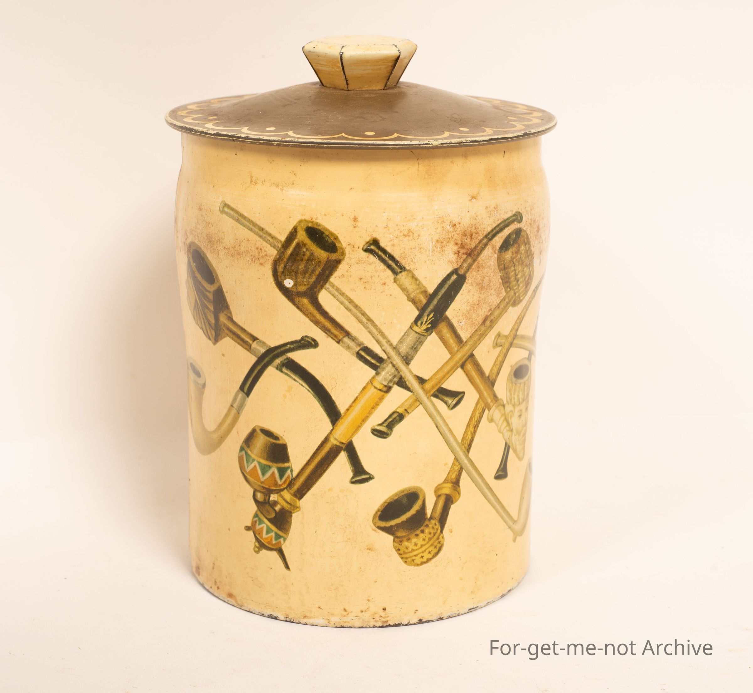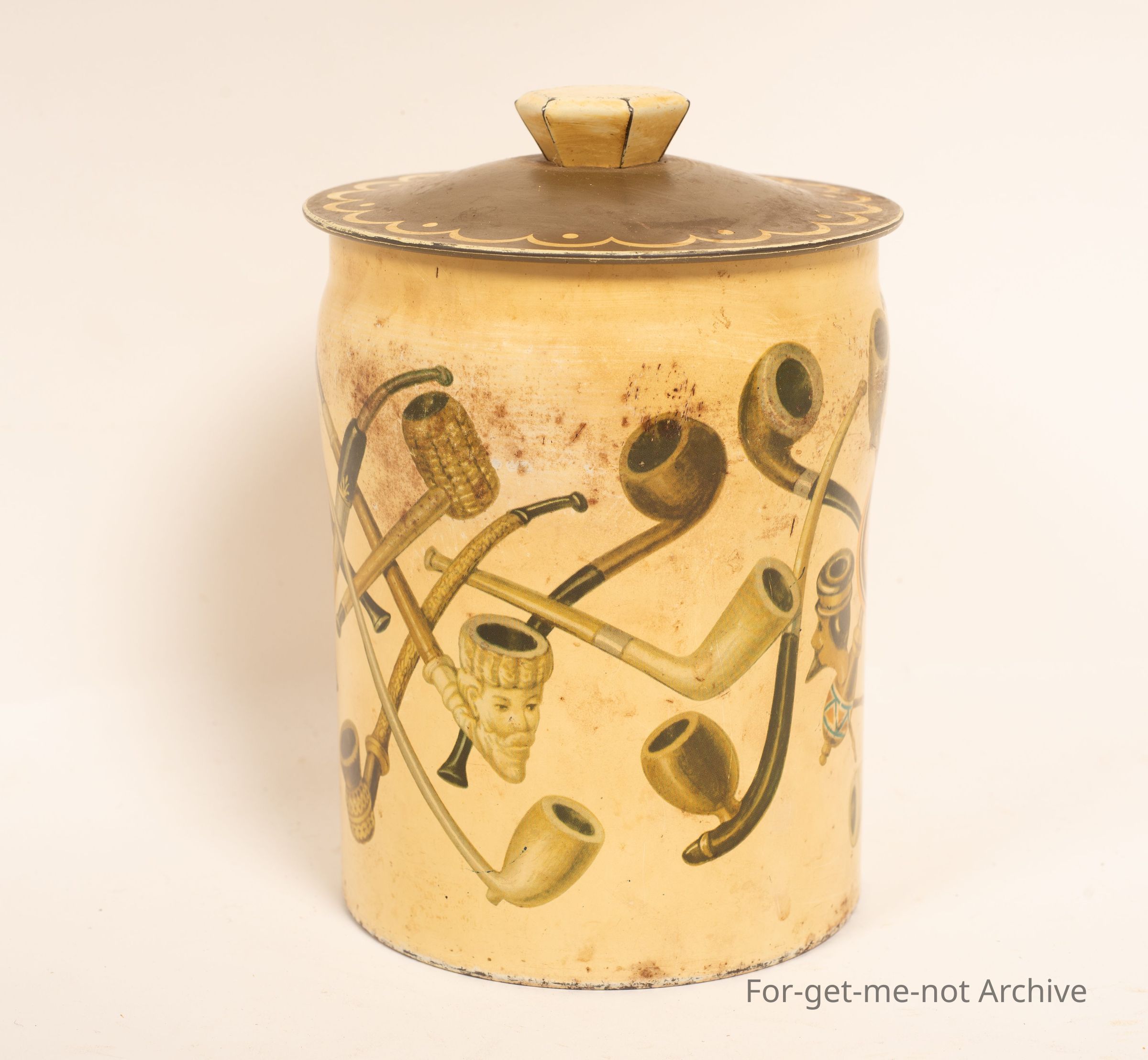 This is a tin humidor for storing tobacco. Graphics of all sorts of pipes right around the circumference of the tin, in reasonable order.