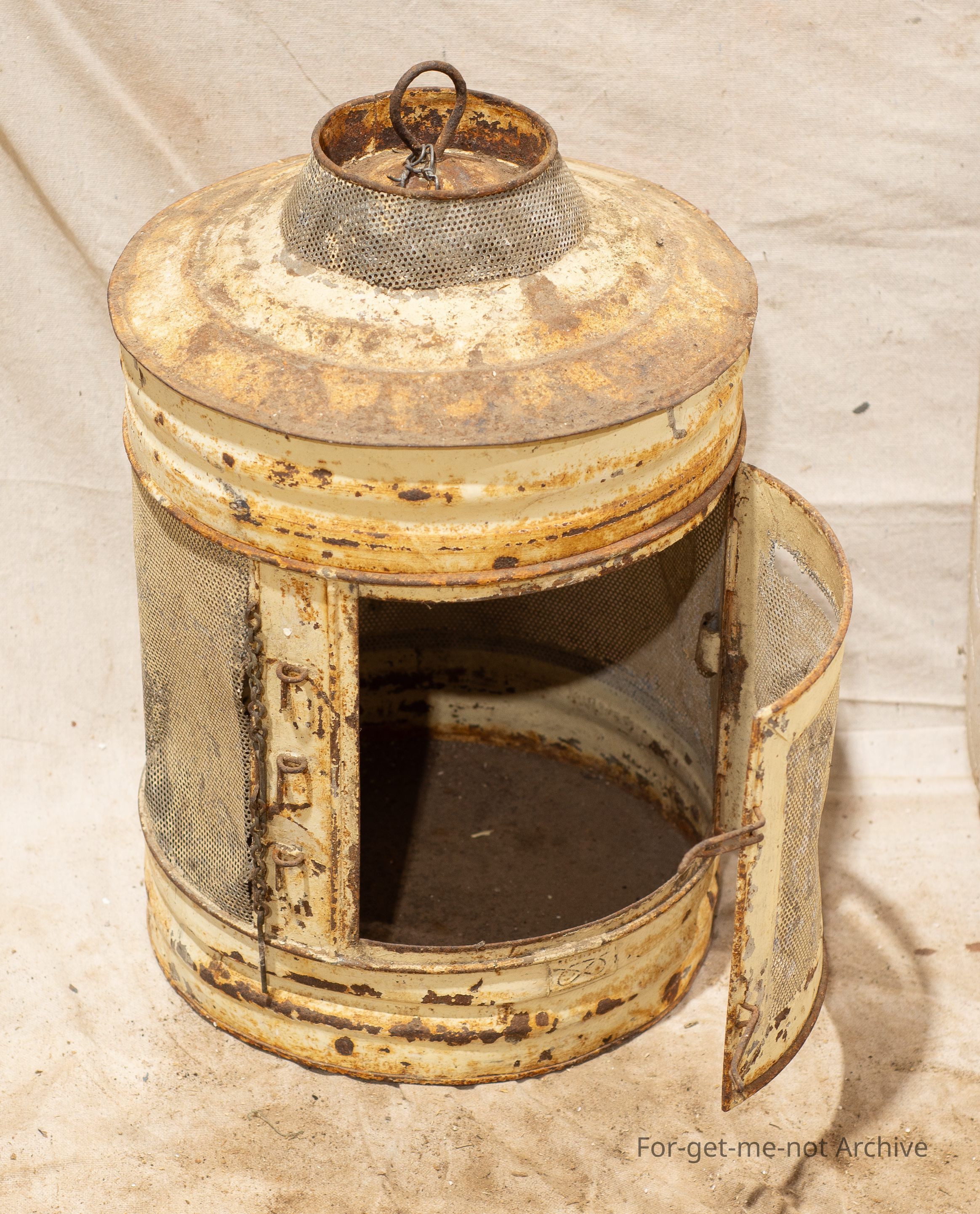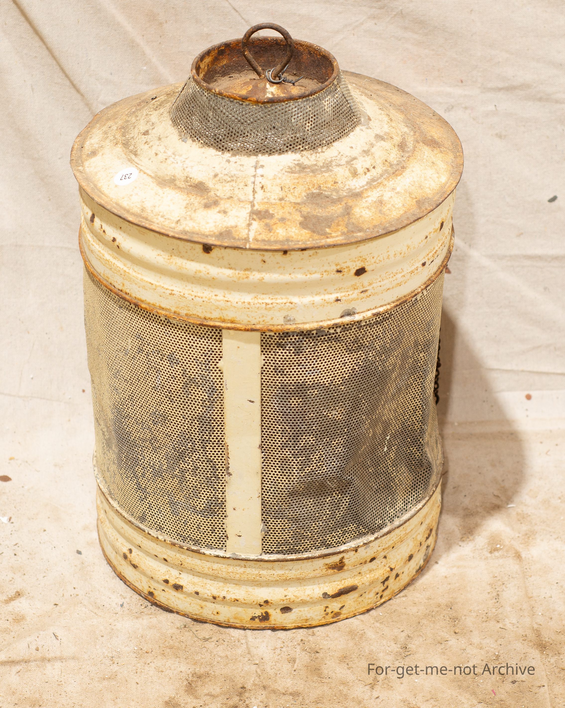 circular meat safe,with zinc perforated covering. Has a registered trademark made in Australia with looped rope symbol.